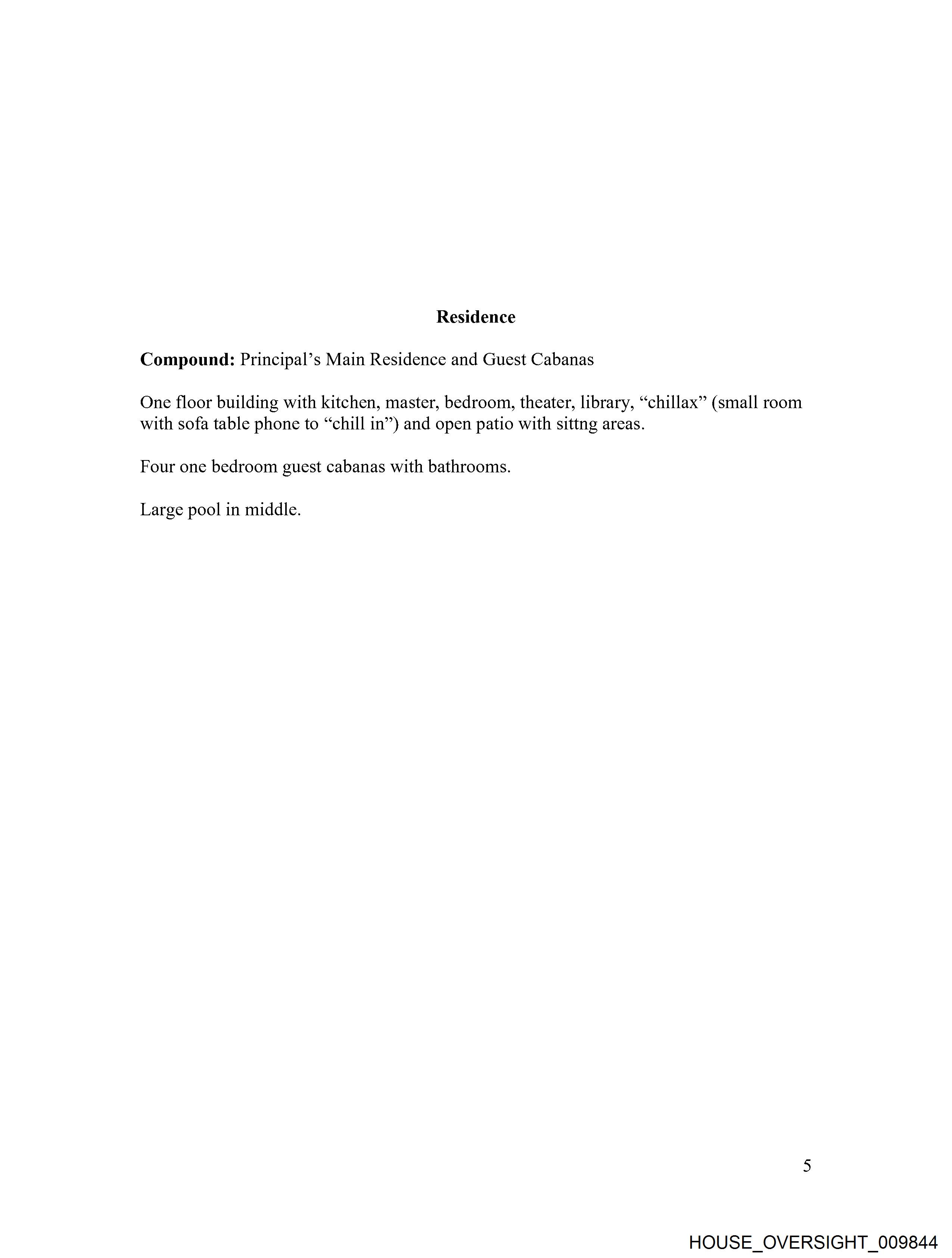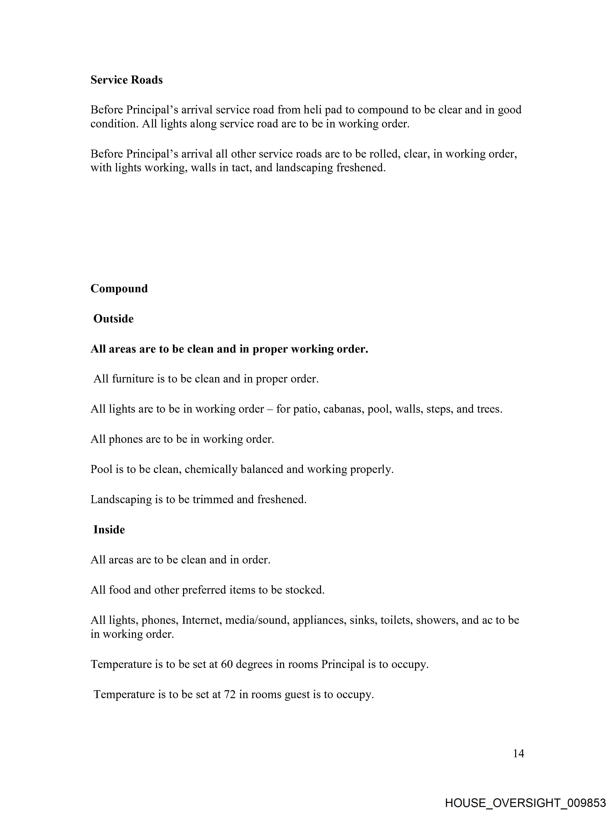 Service Roads Before Principal’s arrival service road from heli pad to compound to be clear and in good condition. All lights along service road are to be in working order. Before Principal’s arrival all other service roads are to be rolled, clear, in working order, with lights working, walls in tact, and landscaping freshened. Compound Outside All areas are to be clean and in proper working order. All furniture is to be clean and in proper order. All lights are to be in working order — for patio, cabanas, pool, walls, steps, and trees. All phones are to be in working order. Pool is to be clean, chemically balanced and working properly. Landscaping is to be trimmed and freshened. Inside All areas are to be clean and in order. All food and other preferred items to be stocked. All lights, phones, Internet, media/sound, appliances, sinks, toilets, showers, and ac to be in working order. Temperature is to be set at 60 degrees in rooms Principal is to occupy. Temperature is to be set at 72 in rooms guest is to occupy. 14 HOUSE_OVERSIGHT_009853
