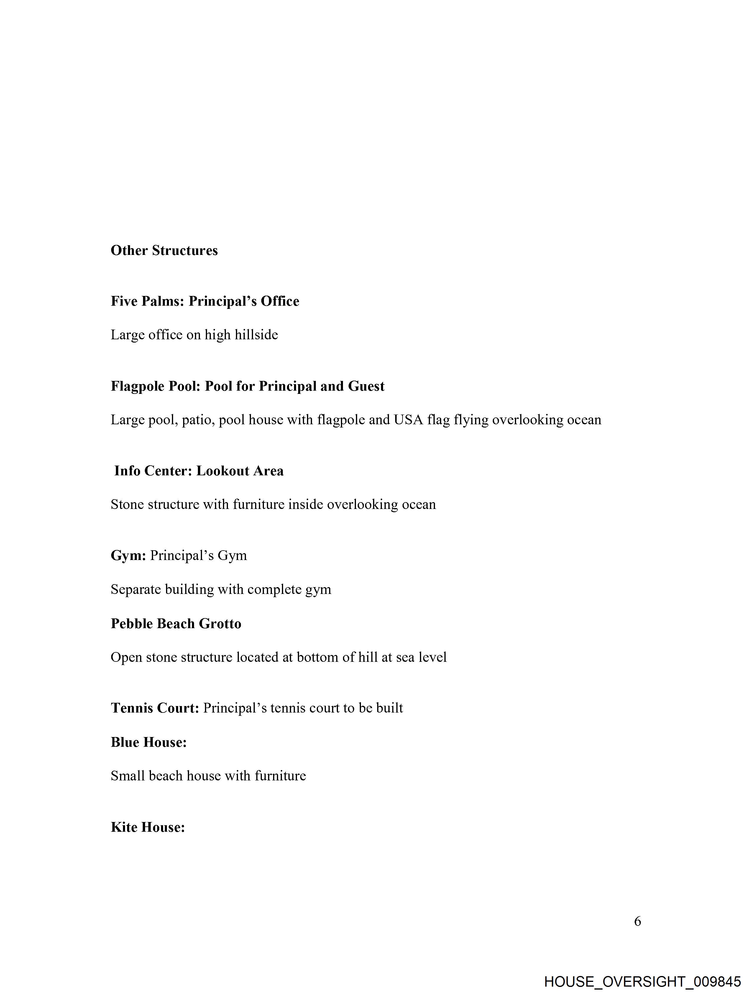 Other Structures Five Palms: Principal’s Office Large office on high hillside Flagpole Pool: Pool for Principal and Guest Large pool, patio, pool house with flagpole and USA flag flying overlooking ocean Info Center: Lookout Area Stone structure with furniture inside overlooking ocean Gym: Principal’s Gym Separate building with complete gym Pebble Beach Grotto Open stone structure located at bottom of hill at sea level Tennis Court: Principal’s tennis court to be built Blue House: Small beach house with furniture Kite House: HOUSE_OVERSIGHT_009845