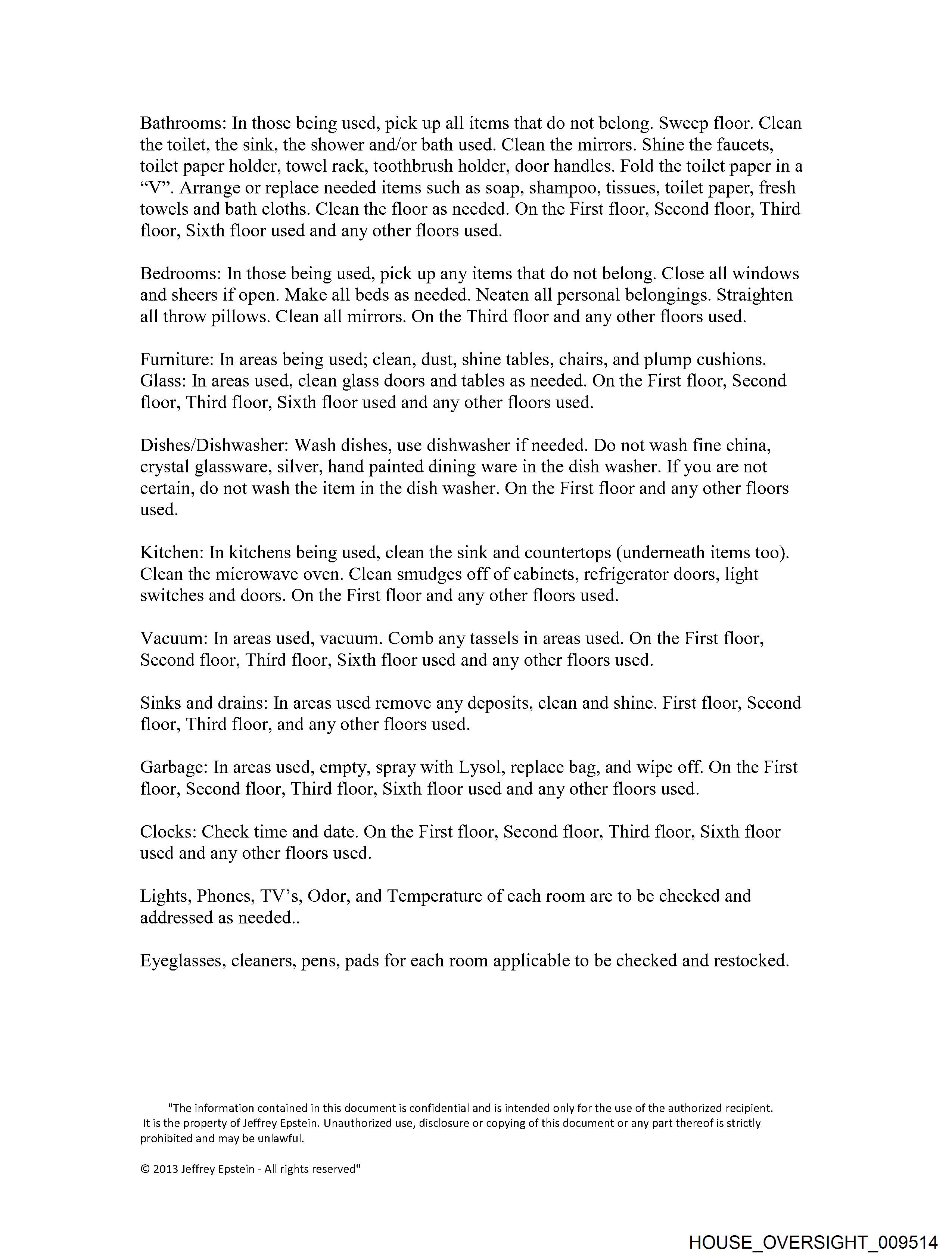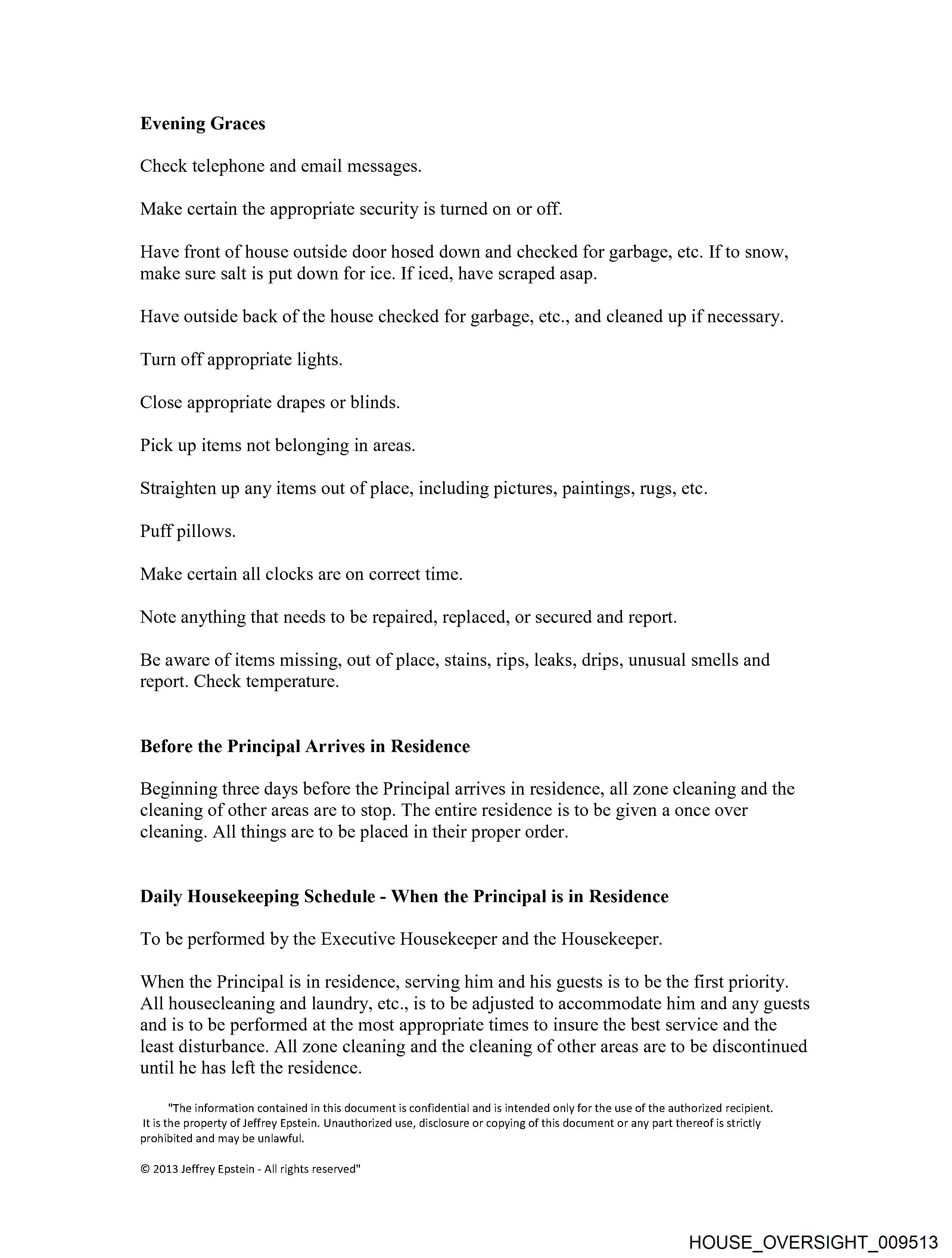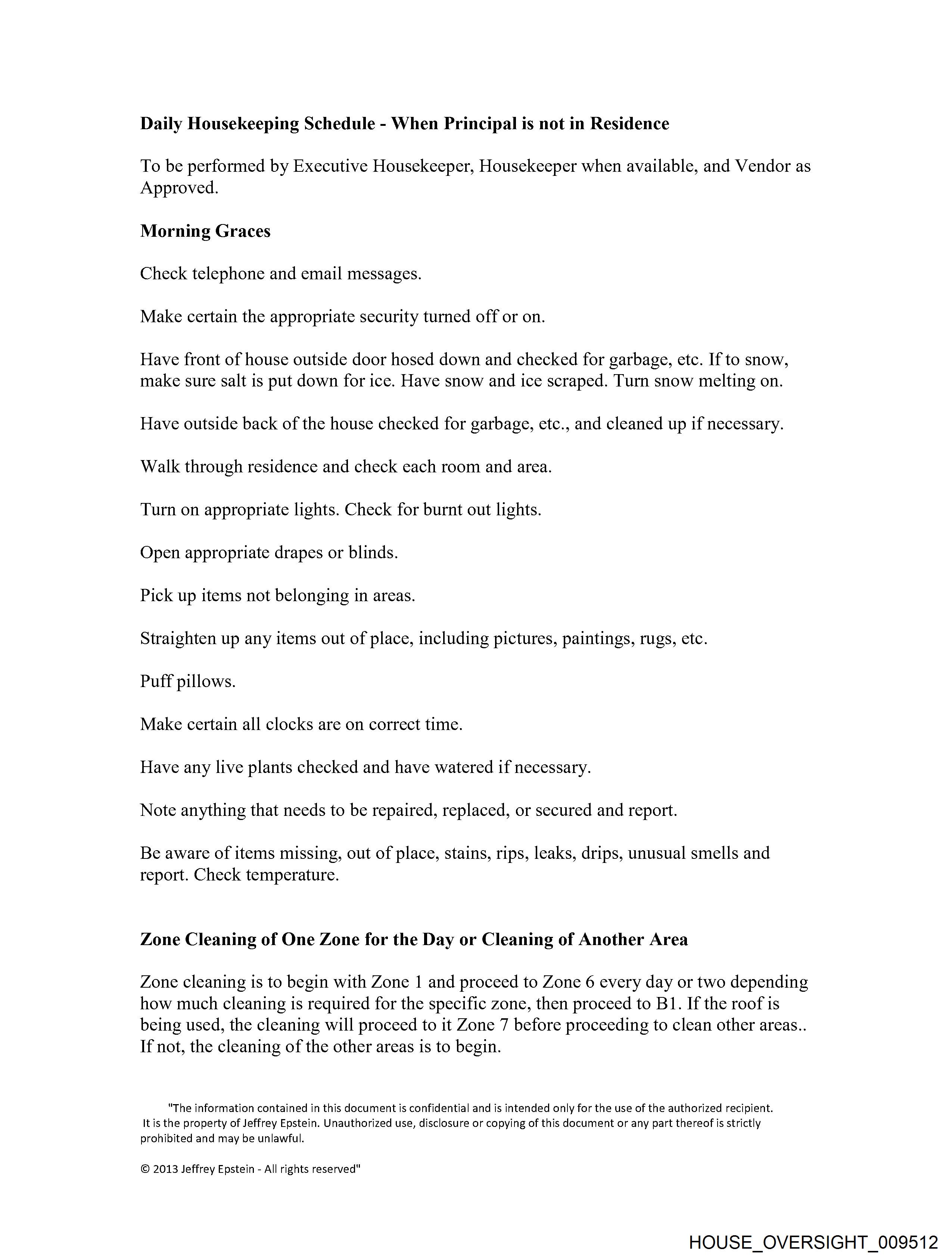 Daily Housekeeping Schedule To be performed daily when Principal is not in residence (see details above). Daily Graces Zone and Area cleaning Evening Graces Weekly Housekeeping Schedule The cleaning of zones and other areas is to begin at the first of the week and proceed daily one right after another after the Principal leaves the residence. Zone B1 - First Level Basement Zone | - First Floor, Front of House, Back of House Zone 2 - Second Floor Zone 3 - Third Floor Zone 4 - Fourth Floor Zone 5 - Fifth Floor Zone 6 - Sixth Floor, Balcony Zone 7 — Roof Laundry Clothes and Shoes Glassware and Silverware Walls and Ledges Inside of Windows and Doors, Outside of Windows and Doors Books Staircases Elevators Drapes, Blinds, and Rugs "The information contained in this document is confidential and is intended only for the use of the authorized recipient. It is the property of Jeffrey Epstein. Unauthorized use, disclosure or copying of this document or any part thereof is strictly prohibited and may be unlawful. © 2013 Jeffrey Epstein - All rights reserved" HOUSE_OVERSIGHT_009515