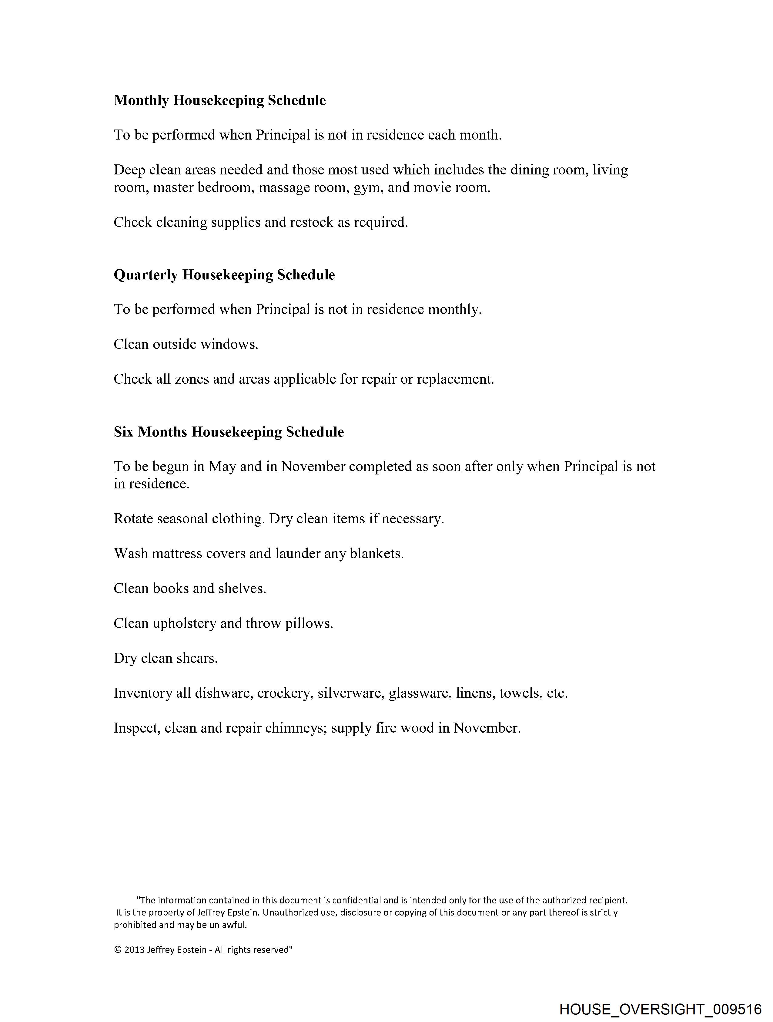Monthly Housekeeping Schedule To be performed when Principal is not in residence each month. Deep clean areas needed and those most used which includes the dining room, living room, master bedroom, massage room, gym, and movie room. Check cleaning supplies and restock as required. Quarterly Housekeeping Schedule To be performed when Principal 1s not in residence monthly. Clean outside windows. Check all zones and areas applicable for repair or replacement. Six Months Housekeeping Schedule To be begun in May and in November completed as soon after only when Principal is not in residence. Rotate seasonal clothing. Dry clean items if necessary. Wash mattress covers and launder any blankets. Clean books and shelves. Clean upholstery and throw pillows. Dry clean shears. Inventory all dishware, crockery, silverware, glassware, linens, towels, etc. Inspect, clean and repair chimneys; supply fire wood in November. "The information contained in this document is confidential and is intended only for the use of the authorized recipient. It is the property of Jeffrey Epstein. Unauthorized use, disclosure or copying of this document or any part thereof is strictly prohibited and may be unlawful. © 2013 Jeffrey Epstein - All rights reserved" HOUSE_OVERSIGHT_009516