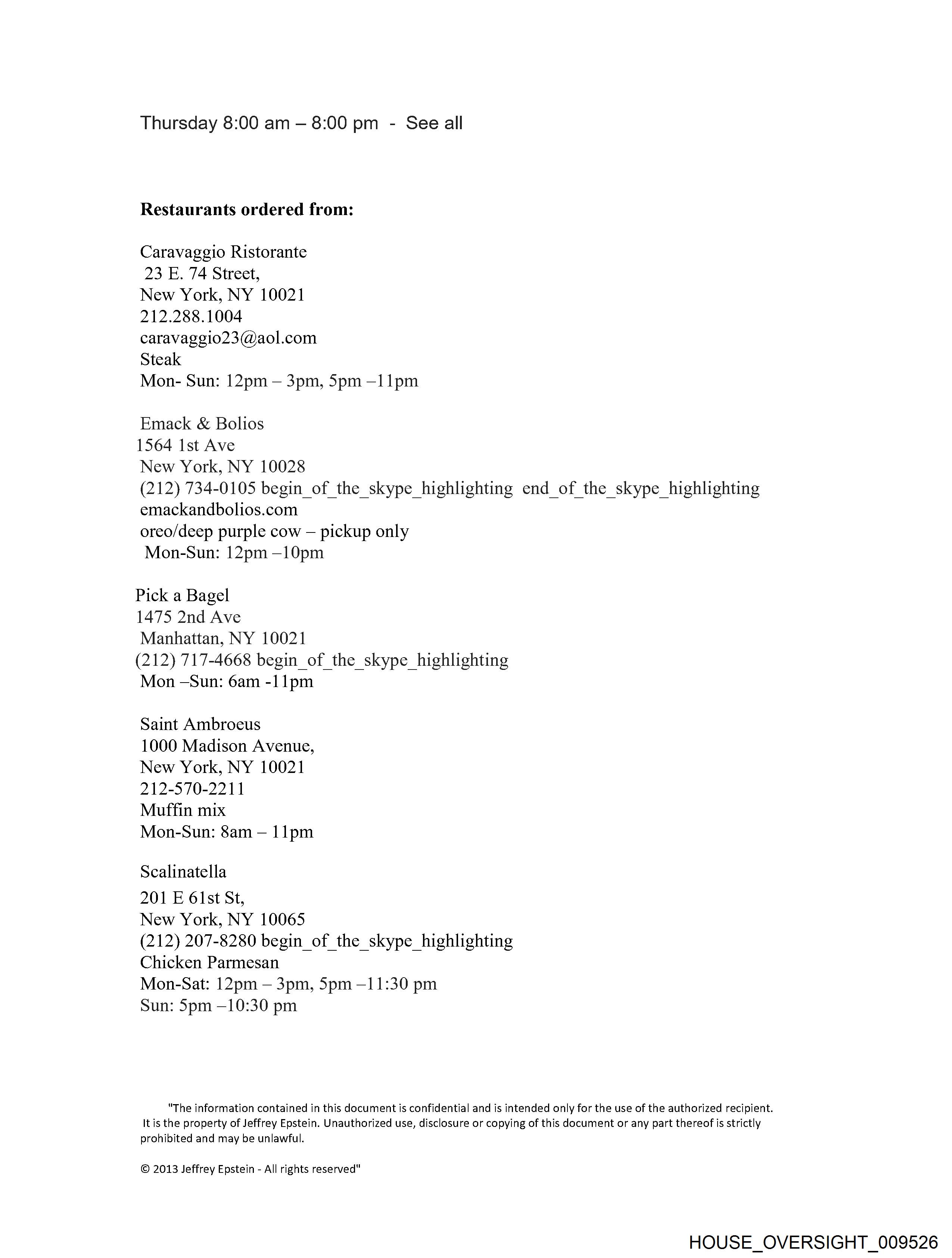 Thursday 8:00 am — 8:00 pm - See all Restaurants ordered from: Caravaggio Ristorante 23 E. 74 Street, New York, NY 10021 212.288.1004 caravagegi023@aol.com Steak Mon- Sun: 12pm — 3pm, 5pm —1 1pm Emack & Bolios 1564 Ist Ave New York, NY 10028 (212) 734-0105 begin of the skype highlighting end of the skype highlighting emackandbolios.com oreo/deep purple cow — pickup only Mon-Sun: 12pm —10pm Pick a Bagel 1475 2nd Ave Manhattan, NY 10021 (212) 717-4668 begin of the skype highlighting Mon —Sun: 6am -1 lpm Saint Ambroeus 1000 Madison Avenue, New York, NY 10021 212-570-2211 Muffin mix Mon-Sun: 8am — 1lpm Scalinatella 201 E 6lst St, New York, NY 10065 (212) 207-8280 begin of the skype highlighting Chicken Parmesan Mon-Sat: 12pm — 3pm, 5pm —11:30 pm Sun: Spm —10:30 pm "The information contained in this document is confidential and is intended only for the use of the authorized recipient. It is the property of Jeffrey Epstein. Unauthorized use, disclosure or copying of this document or any part thereof is strictly prohibited and may be unlawful. © 2013 Jeffrey Epstein - All rights reserved" HOUSE_OVERSIGHT_009526
