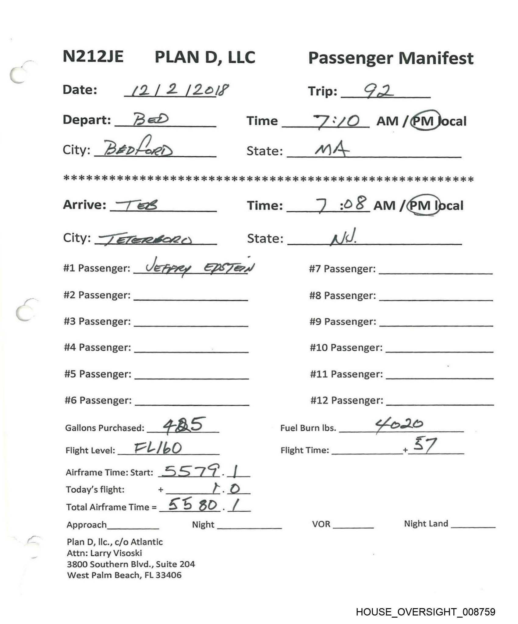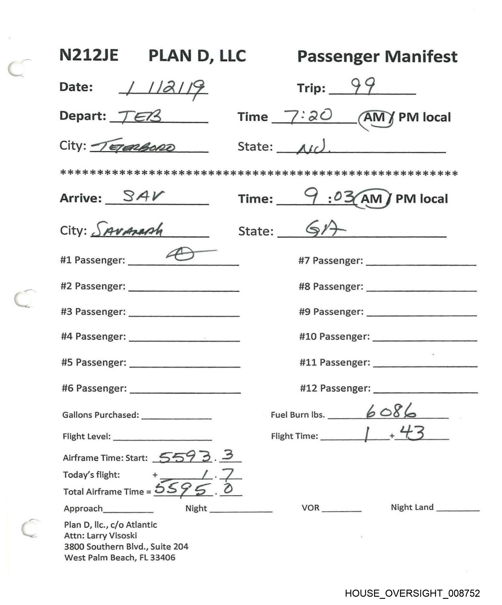 Aa t N212JE PLAN D, LLC Passenger Manifest Date: [2 Ji0 712 Trip: 94 Depart: PAL Time__7:36 _ &)/ PM local City: west phim Beh State: fL 8 26 26 26 26 6 OK ois 2s 6 ois 2 26 oie 2s oe 2 2 2c 2k 2 aie ois ok 2 ois ok ois ik oie oie og 2 oie ik 2k oie 2k 2k 2 ok 2k 2K ok ok 2K oe ok Ok KK OK KOK Arrive: a7 TT Time: \O : SOAN)/ PM local City: S77 FAomAs State: gs Var #1 Passenger: Ps S #7 Passenger: #2 Passenger: #8 Passenger: #3 Passenger: #9 Passenger: #4 Passenger: #10 Passenger: #5 Passenger: #11 Passenger: #6 Passenger: #12 Passenger: Gallons Purchased: Fuel Burn Ibs. B \ [ Flight Level: Ft +1ofre_ 390 Flight Time: 2. + \ ai Airframe Time: Start: 55 x Z.. “a Today’s flight: + a _ Total Airframe Time = SS 5Sou. hom Approach Night VOR Night Land Plan D, lIlc., c/o Atlantic Attn: Larry Visoski 3800 Southern Blivd., Suite 204 West Palm Beach, FL 33406 HOUSE_OVERSIGHT_00875/7