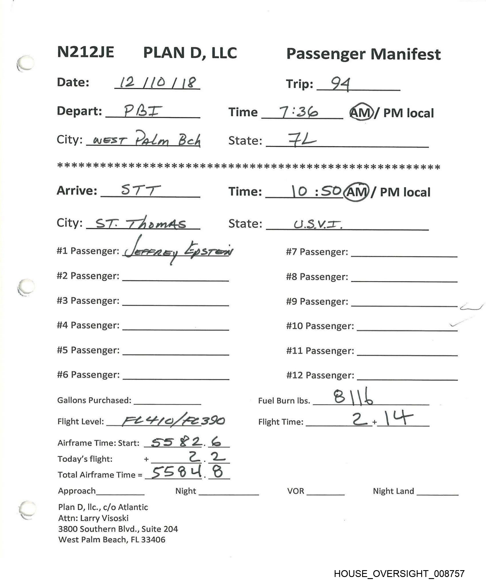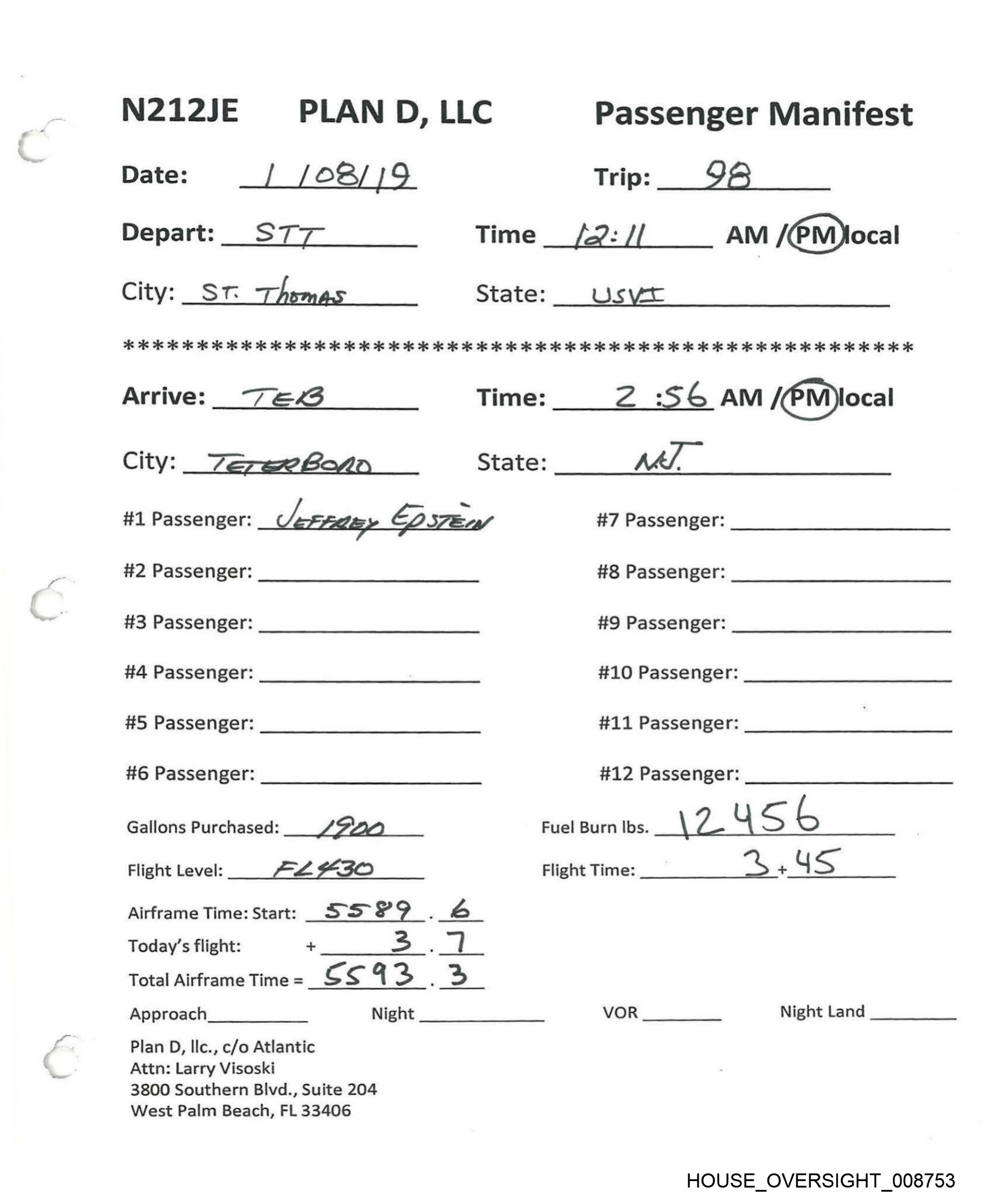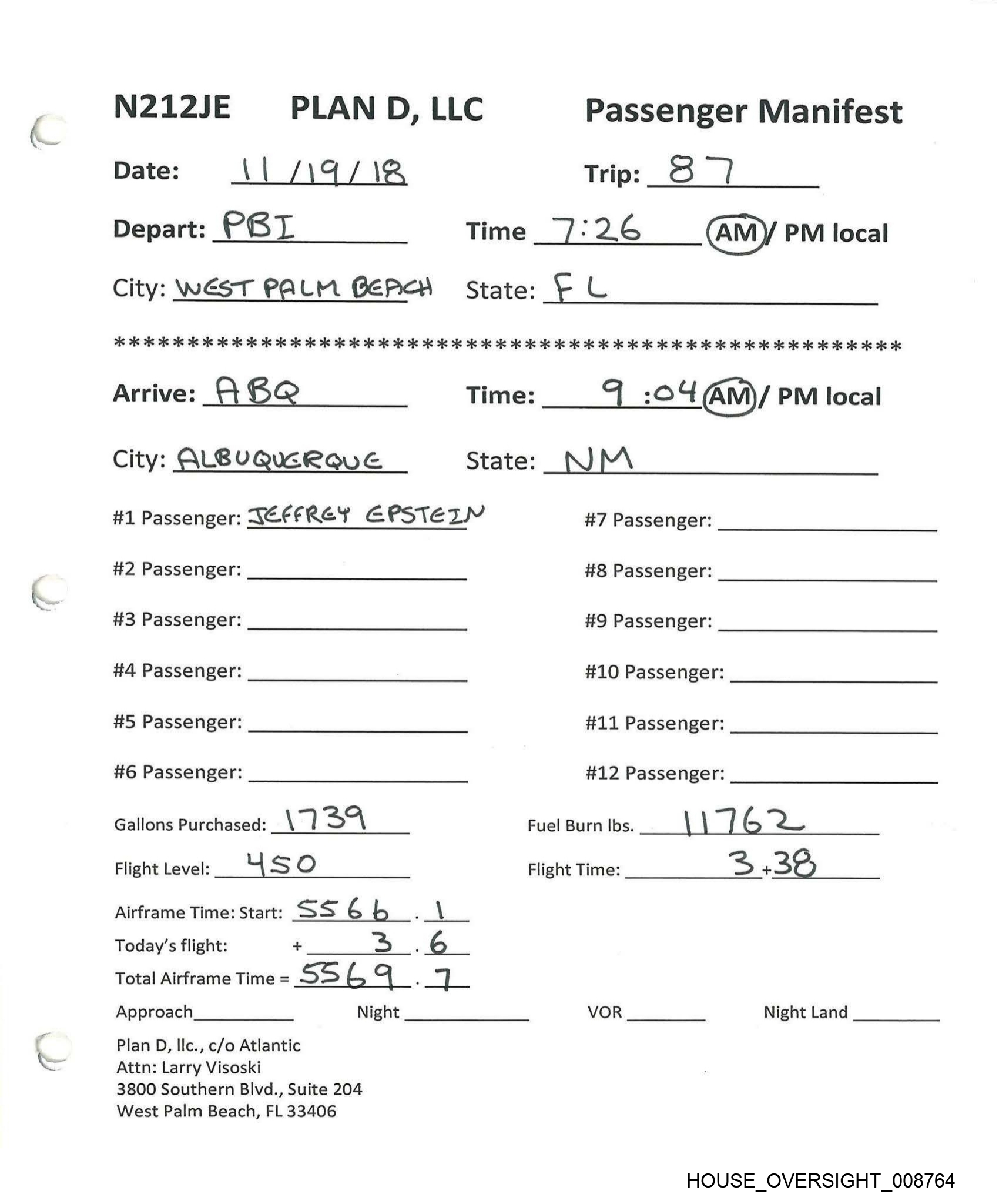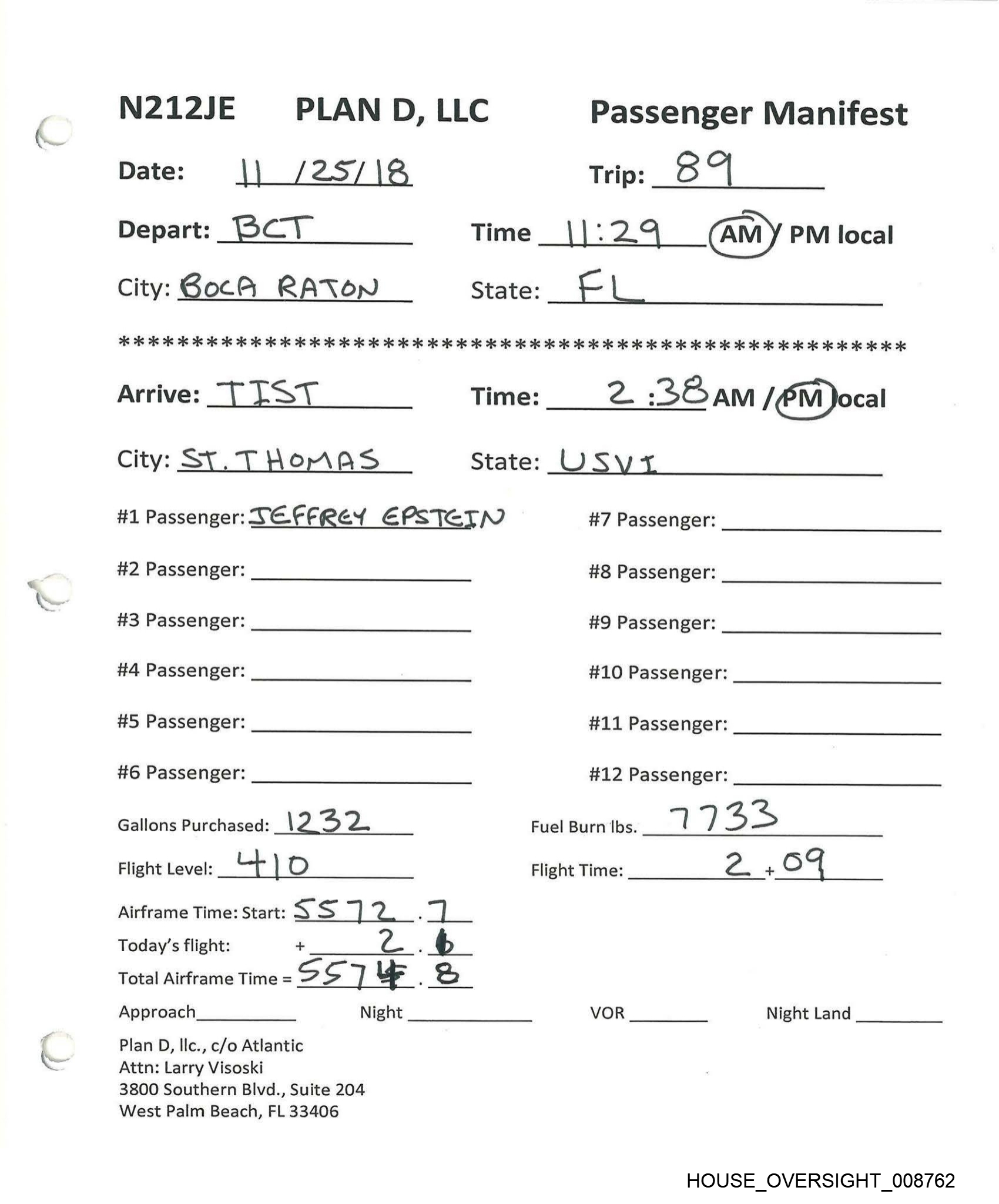 N212JE | PLAND, LLC Passenger Manifest Date: \| /28/18 Trips GO Depart: “| 1ST Time _ 1228 AM /@M)local City: SVT. THOMAS State: USVL 2 2 2s 26 26 As 2 ais 2s 26 2s ok 26 2k 26 2c ok 2 2k 9k oie ok 2K oie ik OK oie ok ok 2 ie og 2 2c 2k 2 oie 2k 2 ok 2k 2k ok ok 2k 2 ok 2K OK OK OK OK KK Arrive: | E& R Time: = :\2 AM (PM)local City: JA TER BoRO State: NO. #1 Passenger: DEFFREY EPSTEIN #7 Passenger: #2 Passenger: #8 Passenger: #3 Passenger: #9 Passenger: #4 Passenger: #10 Passenger: #5 Passenger: #11 Passenger: #6 Passenger: #12 Passenger: Gallons Purchased: RO, “) TwR Fuel Burn Ibs. \ (| i Flight Level: “A, O Flight Time: c! + Gu Airframe Time: Start: Ss ] on 8B. Today’s flight: + 3 . -) Total Airframe Time = S Ss 1 8 Ss Approach Night VOR Night Land Plan D, Ilc., c/o Atlantic Attn: Larry Visoski 3800 Southern Blvd., Suite 204 West Palm Beach, FL 33406 HOUSE_OVERSIGHT_008761