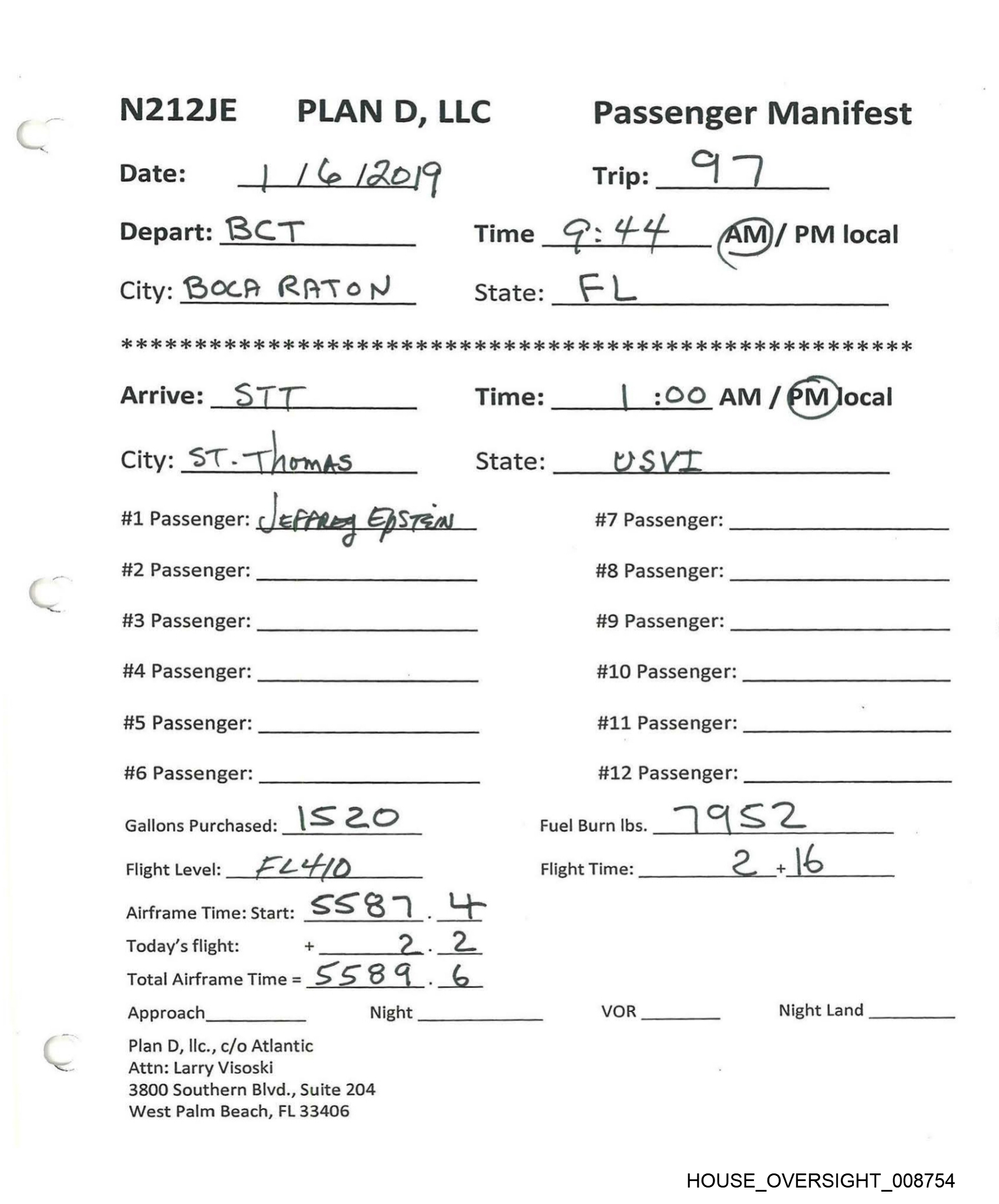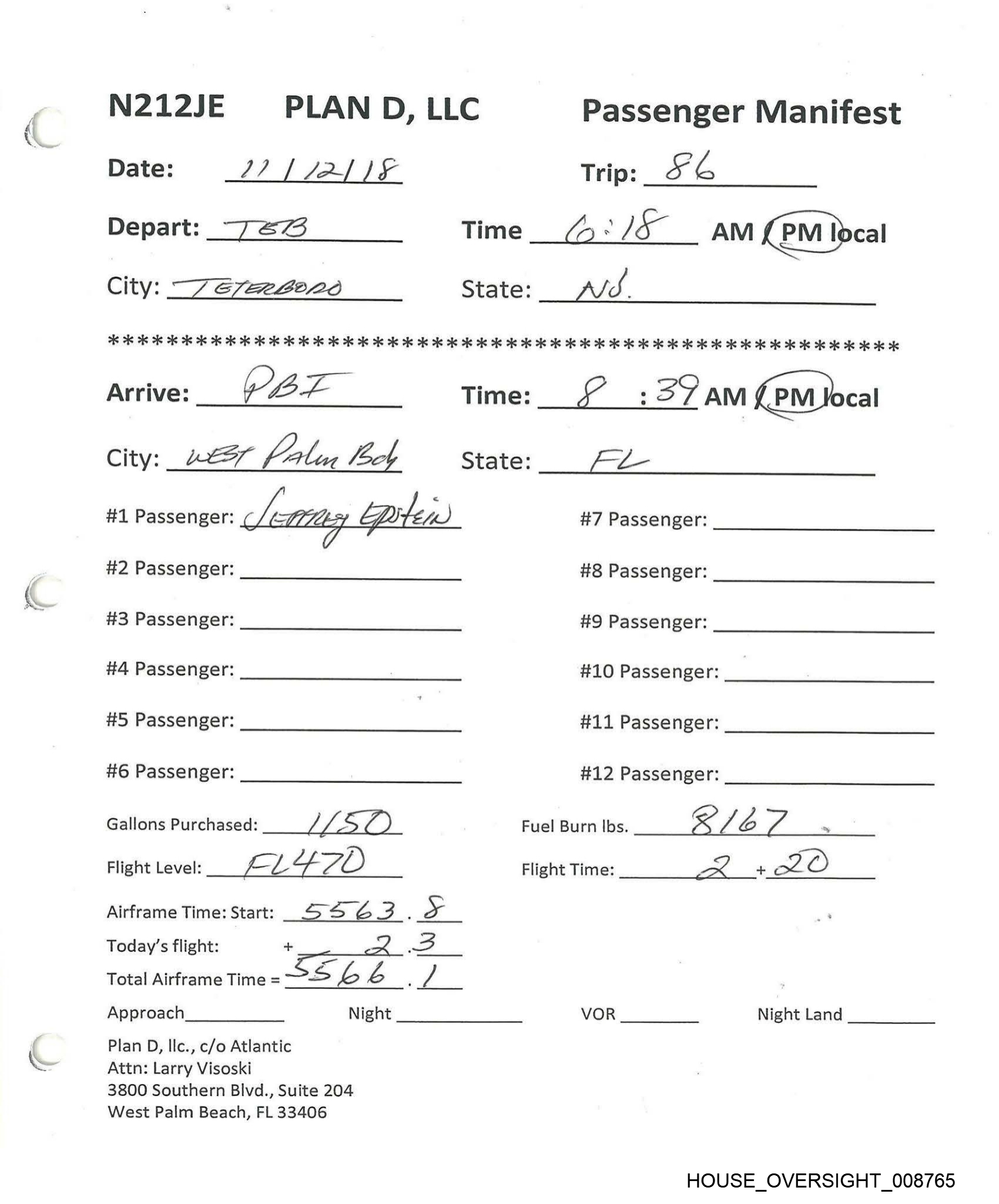 N212JE PLAN D, LLC Passenger Manifest Date: \) /257\8 Trip: 8 | Depart: BCT Time _ ||.2.9 AM Y PM local City: Boch RAYON State: 'e L 7k 7k 26 2c ok 2s 2s 2 28 2 6 2 os ie is ie ak i 2 oie oie oie oie oie ie oie isk ik ik 2 2k 2g 2k 2 0g ig 2k 9 2k 2K 2K 2k 2K OK 2k 2 2 ok ok ok OK OK Arrive: {LST Time: 2:36am /@M Jocal City: ST. THonas State: U #1 Passenger: TEFFREY EPSTETII #7 Passenger: #2 Passenger: #8 Passenger: #3 Passenger: #9 Passenger: #4 Passenger: #10 Passenger: #5 Passenger: #11 Passenger: #6 Passenger: #12 Passenger: Gallons Purchased: _\ ay es Fuel Burn lbs. 4 7 => Flight Level: O Flight Time: ae a). ae Airframe Time: Start: x 2 — ] Today’s flight: + r.. , ¢ Total Airframe Time = oS } ifs : Vo) Approach Night VOR Night Land Plan D, Ilc., c/o Atlantic Attn: Larry Visoski 3800 Southern Blvd., Suite 204 West Palm Beach, FL 33406 HOUSE_OVERSIGHT_008762