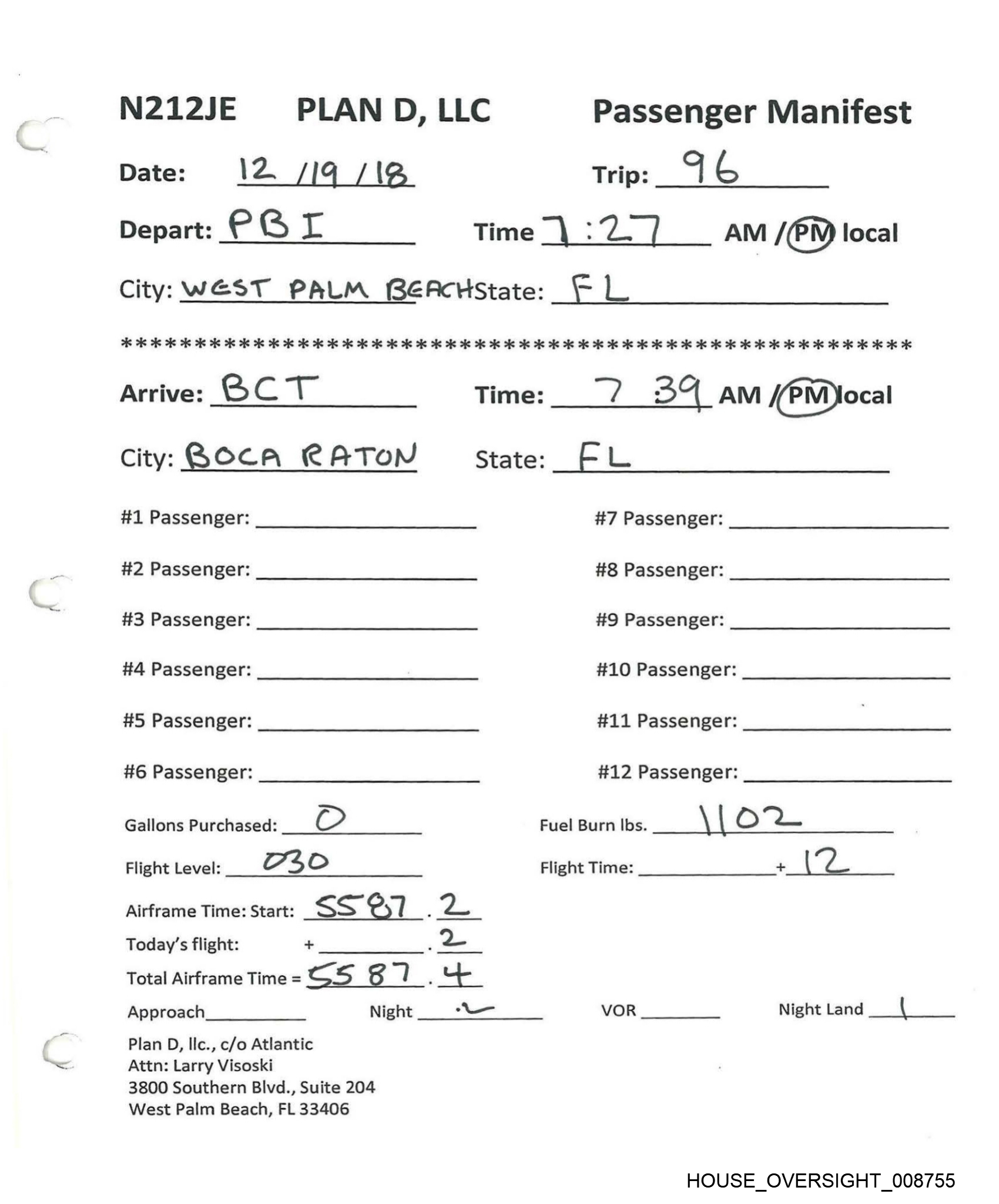 N212JE Date: 12 /19 /IR Depart: CB L PLAN D, LLC Passenger Manifest Trip: | G Time | :2 ] AM /@N local City: WEST PALM BeACcHState: FL 7K OK A Boe os os os oe oe oe oe oe ie 2s 2k 2 oie 2 2 ok kk 2 2 oo KK OK OK OK OK KK KK OK OK OO OK OK OK KK OK OK KK OK KK Arrive: BcT City: BOCA RATON #1 Passenger: #2 Passenger: #3 Passenger: #4 Passenger: #5 Passenger: #6 Passenger: Gallons Purchased: O Flight Level: he oO Airframe Time:stare: SS Cs] FP |e Today’s flight: + . Total Airframe Time = cs 5 dl ‘ Approach Night atl Plan D, Ilc., c/o Atlantic Attn: Larry Visoski 3800 Southern Blvd., Suite 204 West Palm Beach, FL 33406 Flight Time: Time: ¥ 34 AM [(PM)ocal State: Fo #7 Passenger: #8 Passenger: #9 Passenger: #10 Passenger: #11 Passenger: #12 Passenger: Fuel Burn lbs. \ "i. es i VOR Night Land ( HOUSE_OVERSIGHT_008755