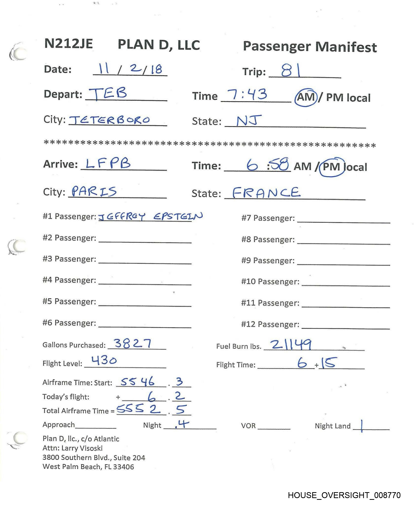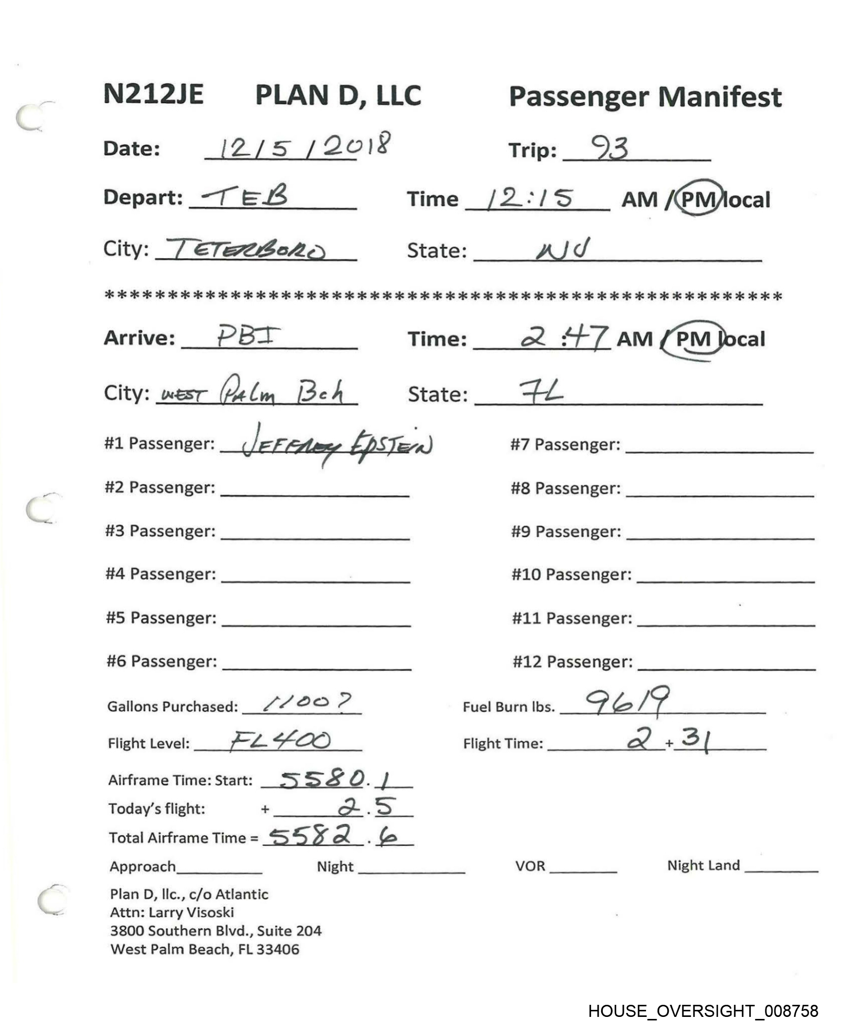 —"\, N212JE PLAN D, LLC Passenger Manifest Date: JO (30/20/8 Trip: SO Depart: S77 Time _ //- ZS AML/ PM local City: S/- TKet2mtts State: L/S 7 AAG ois ie os 2 os 2k 2 2k ie oie 2s ois ois ie 2k 2k 2 2 2 ok 2 2 oe ok ok ok OR OK RR RK RR RK KKK ROKK KKKKKKKES Arrive:_ 7&3 Time: 3:24AM /@Mocal City: “Fer a Boro State: AL J. #1 Passenger: [, Zas wi #7 Passenger: #2 Passenger: #8 Passenger: #3 Passenger: #9 Passenger: #4 Passenger: , #10 Passenger: #5 Passenger: | #11 Passenger: #6 Passenger: #12 Passenger: Gallons Purchased: _/ LEO Fev Fuel Burn Ibs. \ 2 } V be _ Flight Level: ZLLFSO Flight Time: ) + > | Airframe Time: Start: OS ¢Z. 7 Today’s flight: + > 6 Total Airframe Time = SS uf 6 , 3 Approach Night VOR Night Land Plan D, Ilc., c/o Atlantic Attn: Larry Visoski 3800 Southern Blvd., Suite 204 West Palm Beach, FL 33406 HOUSE_OVERSIGHT_008771