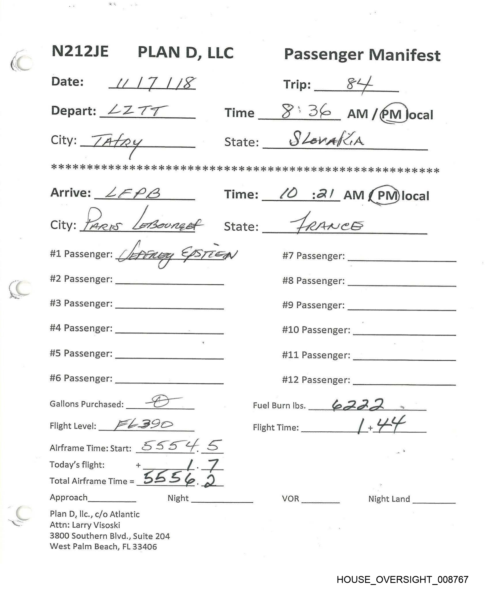 (AA BIS” N212JE PLAN D, LLC Passenger Manifest Date: pPLl7 1201s Trip: 3c Depart: 477A Time 437.37 __ AM (mi Jocal City: oe, ‘8 Le State: ae AAS CES 7B os 2 6 ok 2s 2 OK 2 2 2 ok 2 2 OK 2 2 2 2 KK oe oe ok 2K oe oe OK OK OO OK OK OK OK OK OK OK OK OK KK OK OK KK KE KE KE KK Arrive: 22 72 Time: c :43 AM/PM\ocal City: BratsZA VA- State: SLo KA Kee #1 Passenger: eer LDSTer4) #7 Passenger: #2 Passenger: #8 Passenger: #3 Passenger: #9 Passenger: #4 Passenger: #10 Passenger: #5 Passenger: #11 Passenger: #6 Passenger: #12 Passenger: Gallons Purchased: Fuel Burn lbs. rs / 7 s~ % Flight Level: FL ie O Flight Time: + | 4 Airframe Time: Start: mr i 55 a — Today’s flight: Total Airframe Time = Frie§ 4 = Approach Night VOR Night Land Plan D, llc., c/o Atlantic Attn: Larry Visoski 3800 Southern Blvd., Suite 204 West Palm Beach, FL 33406 HOUSE_OVERSIGHT_008769