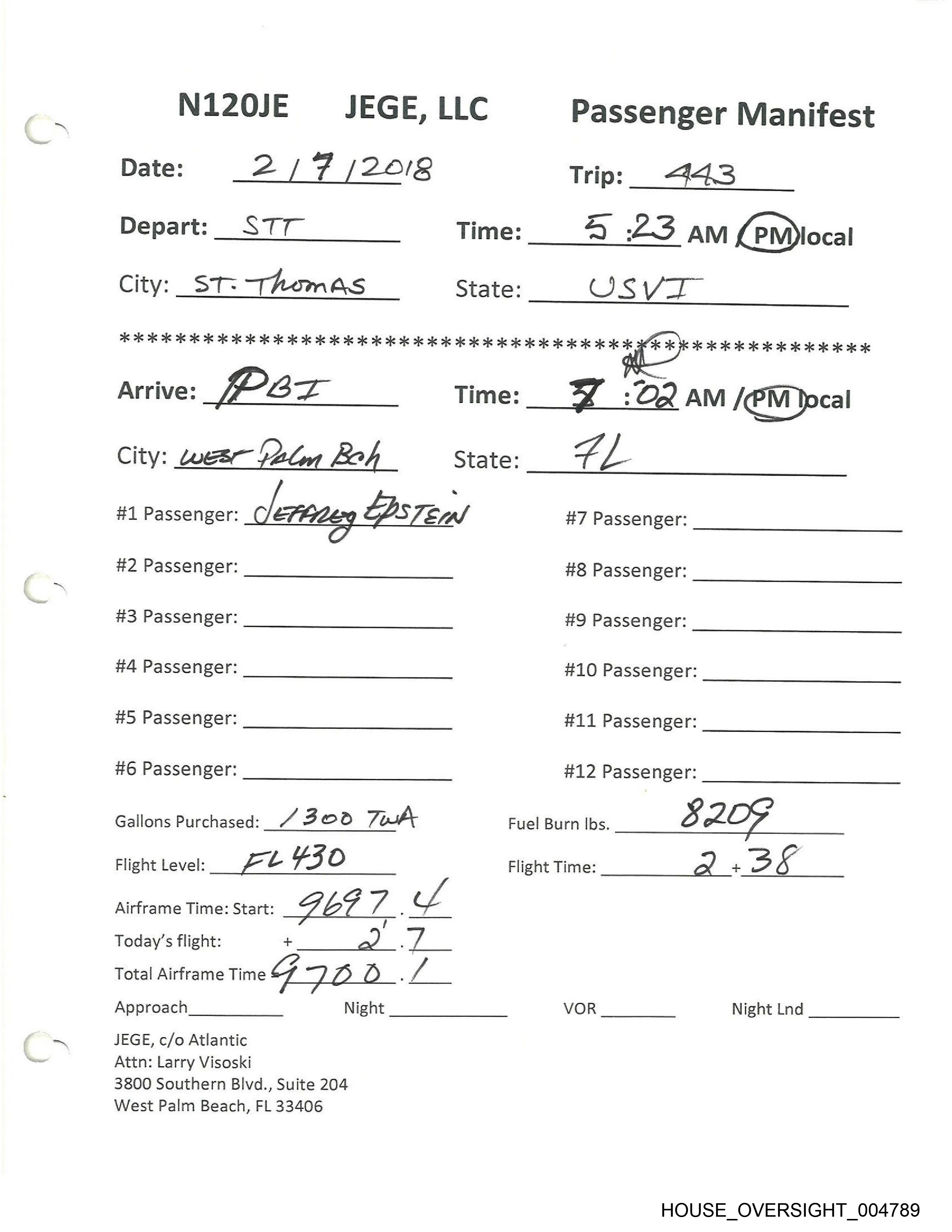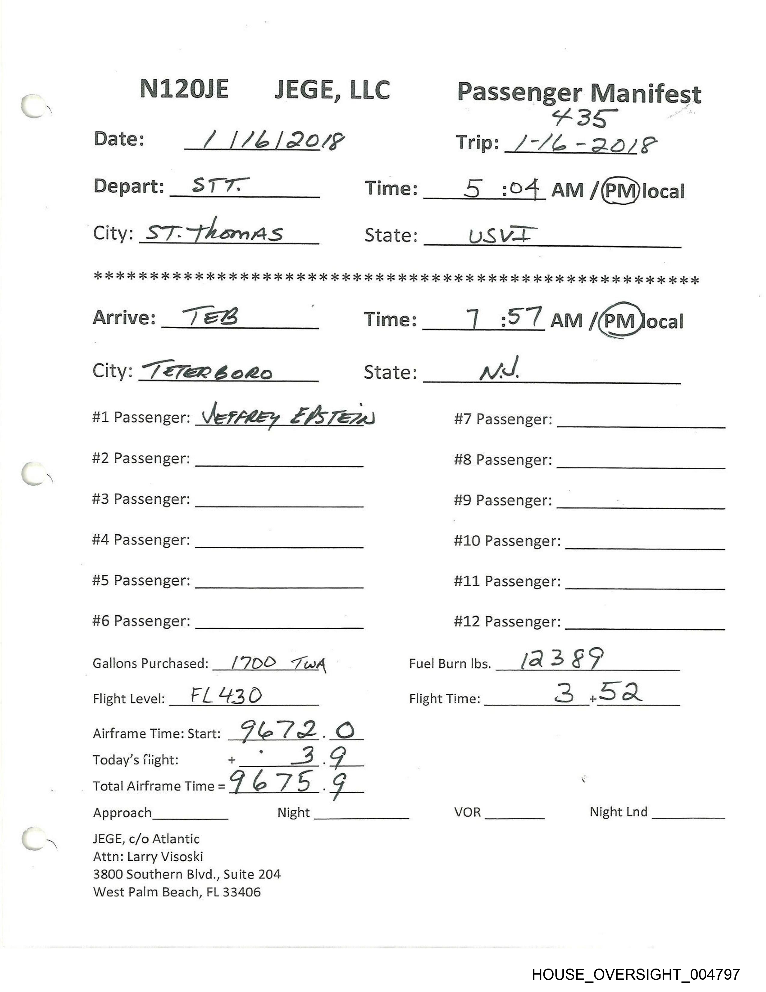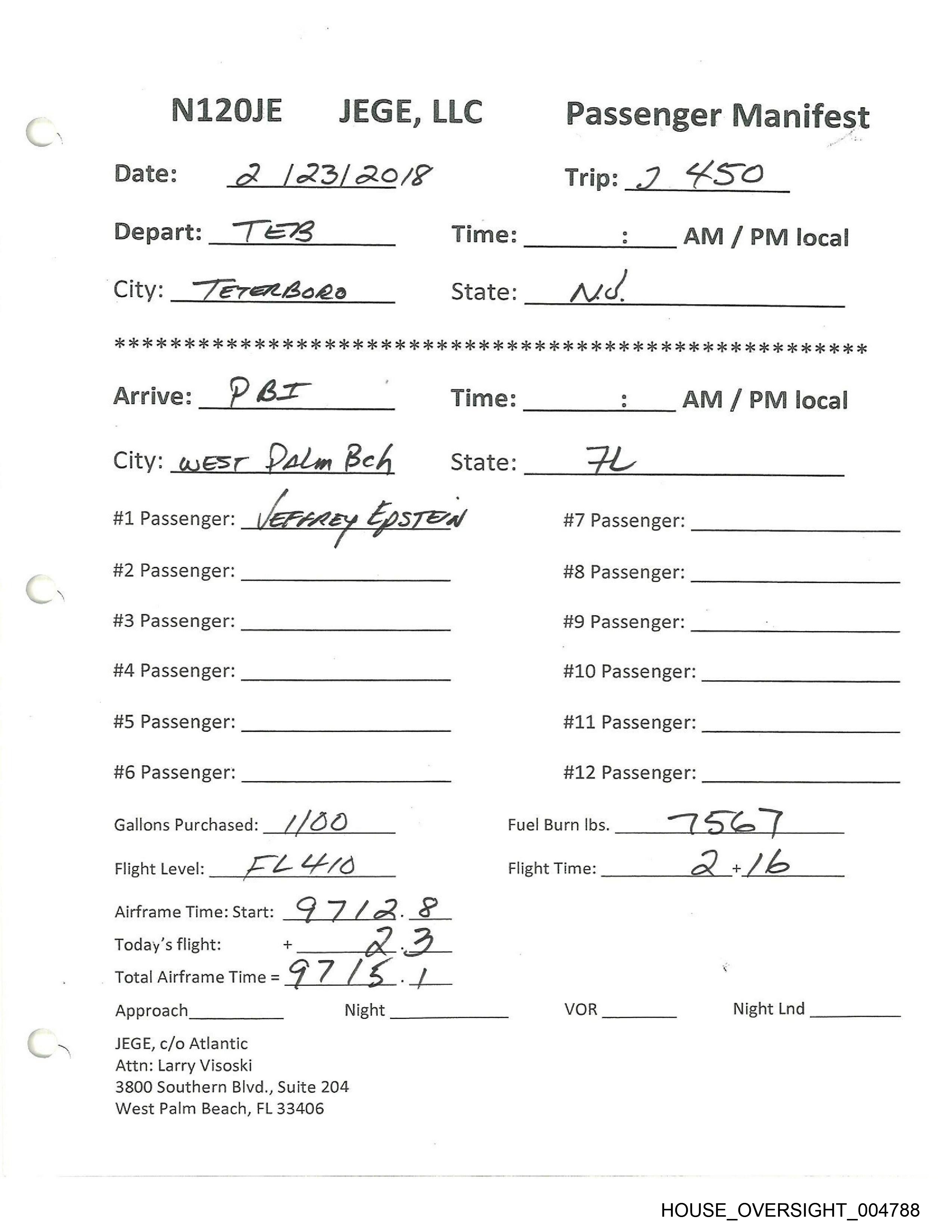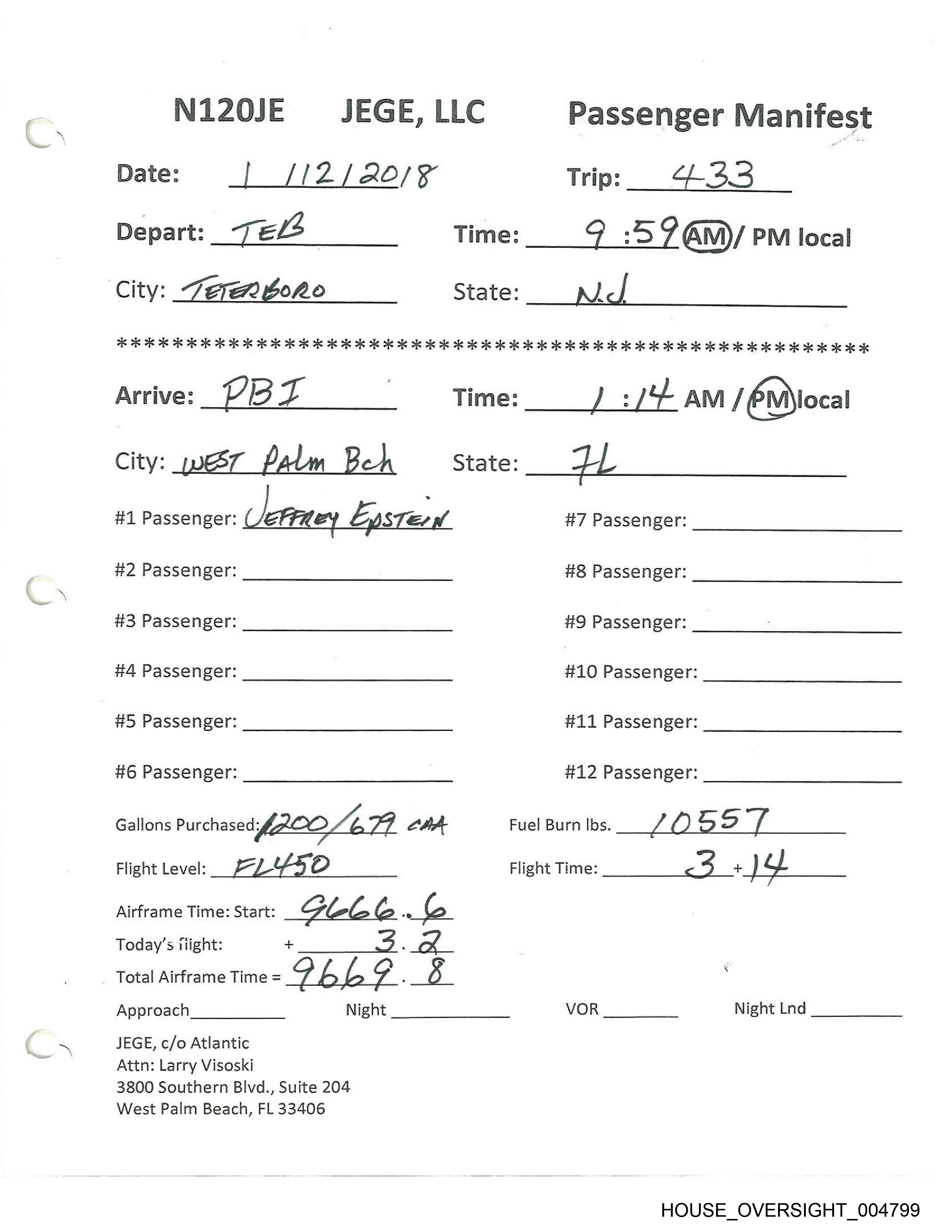 #1 Passenger: JEFFREY EPSTELN #7 Passenger: