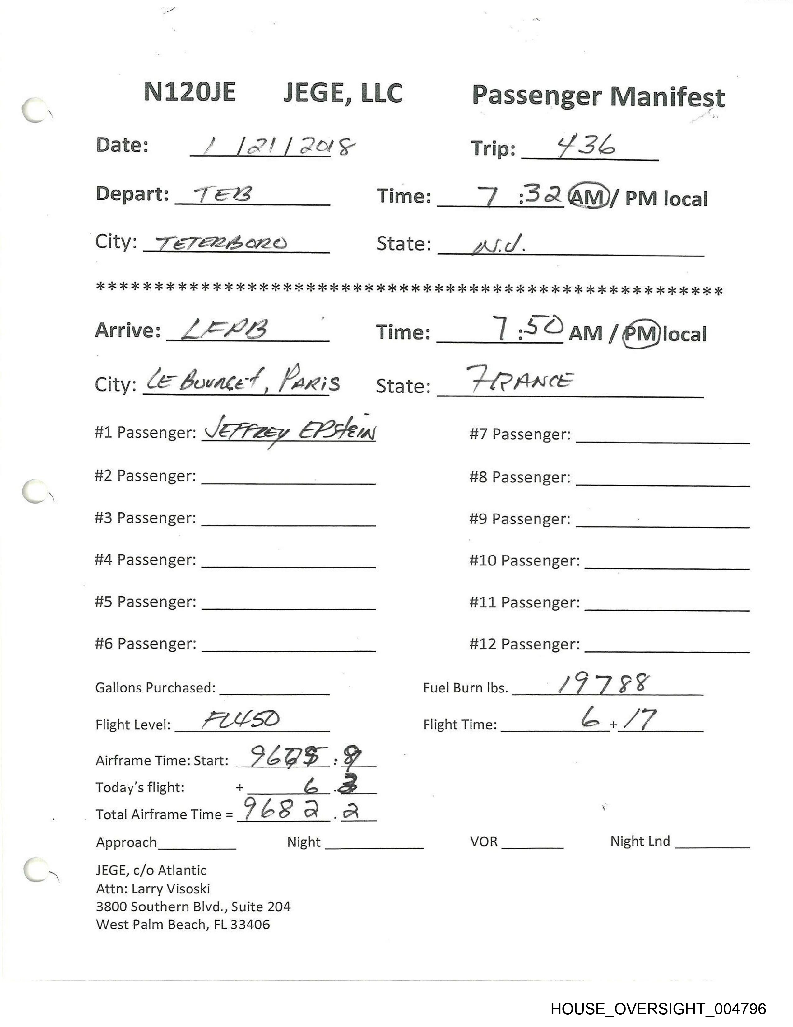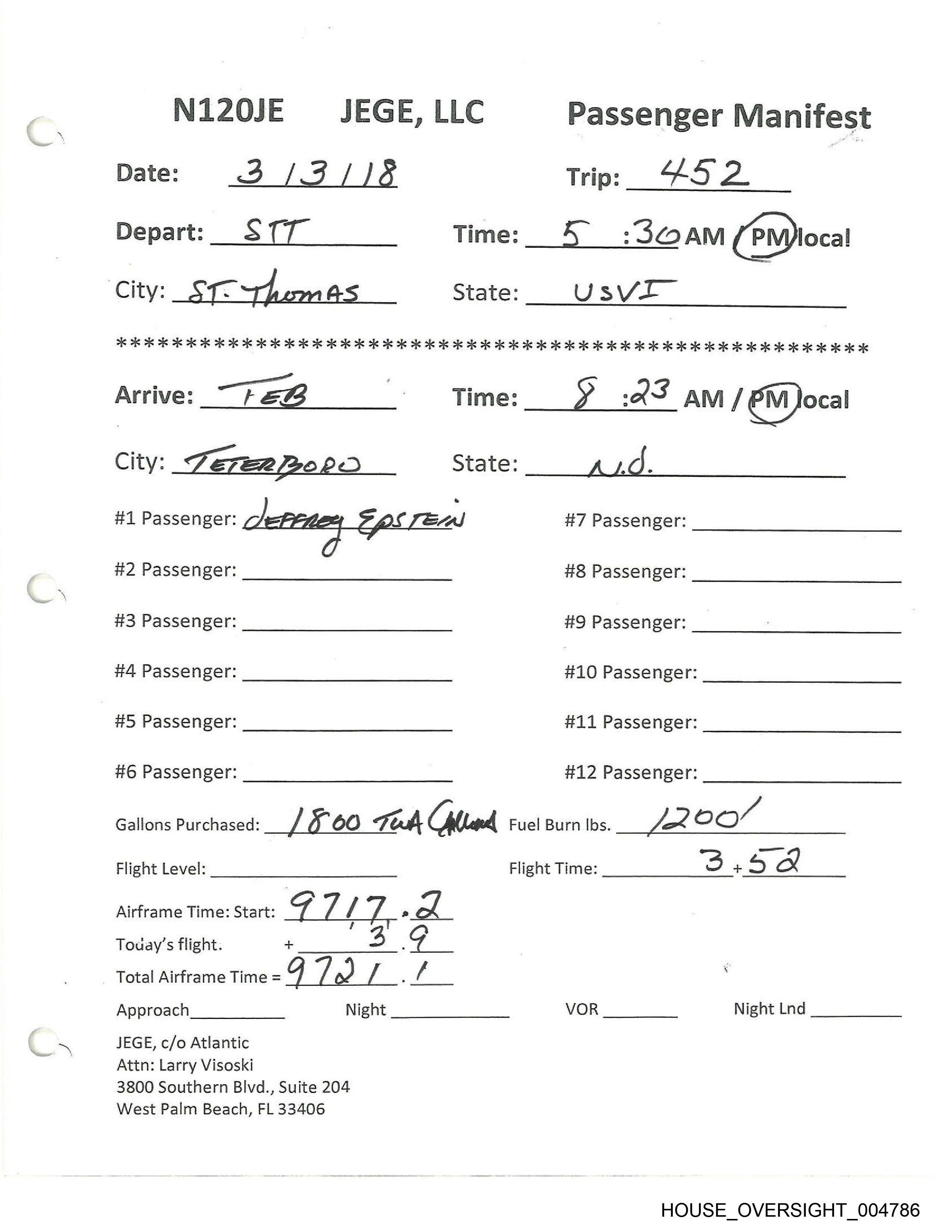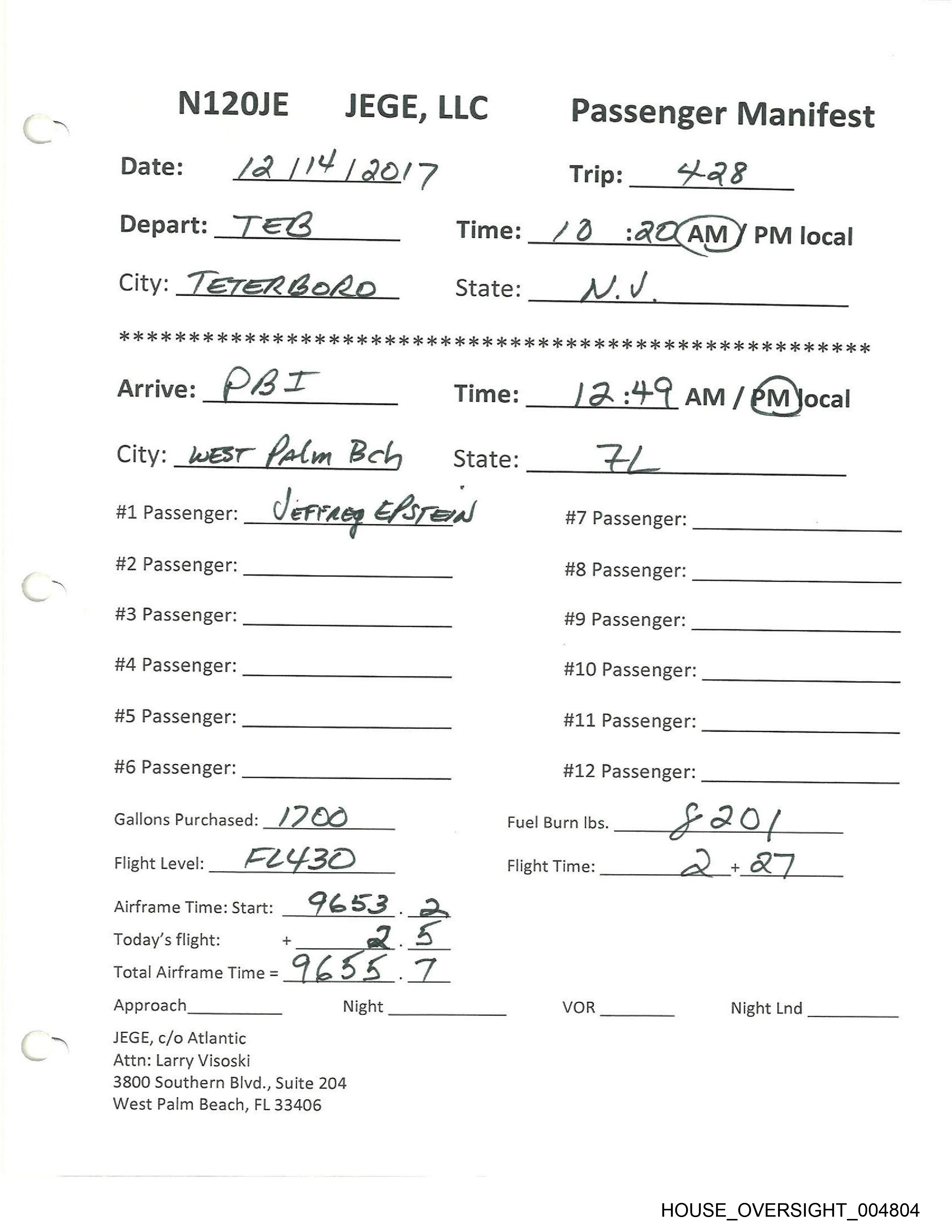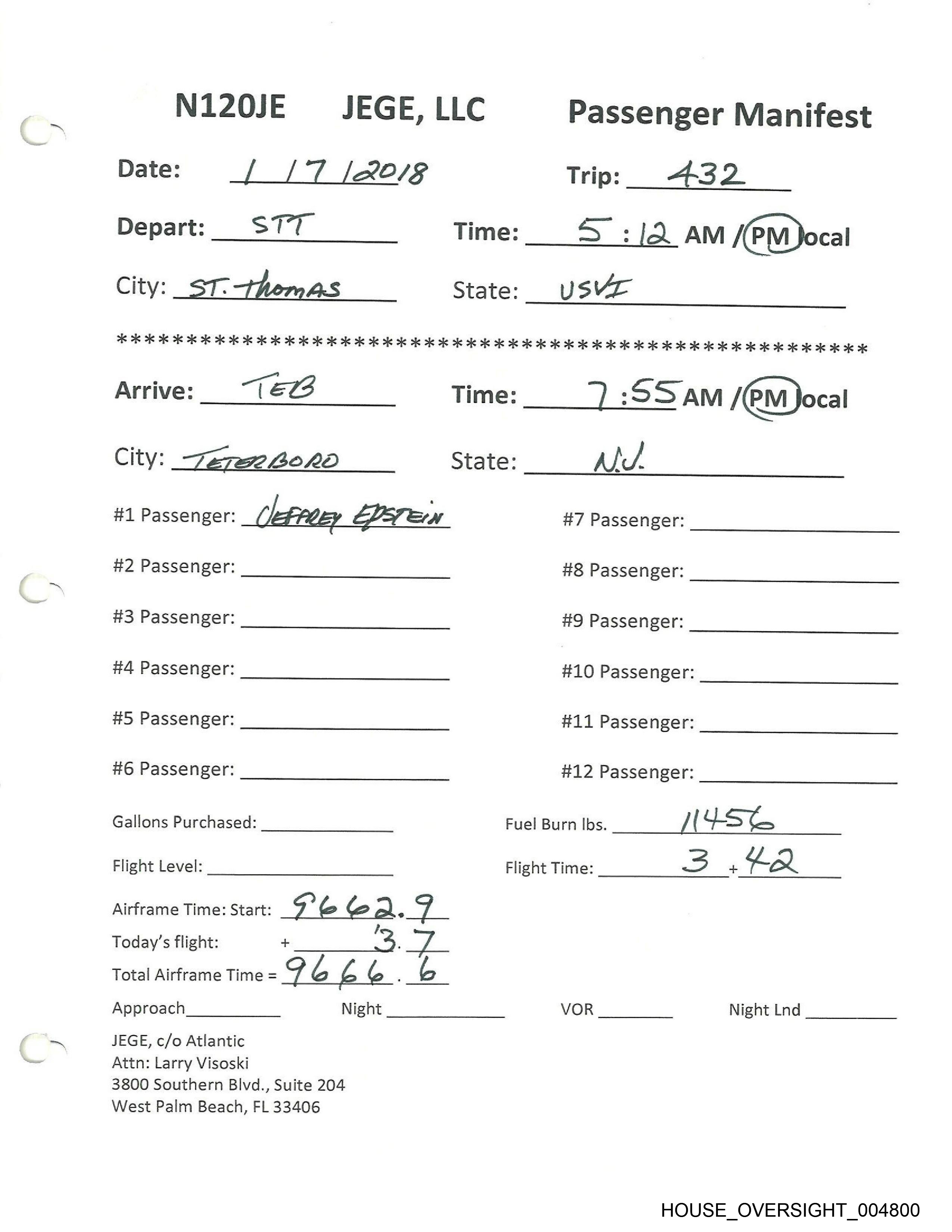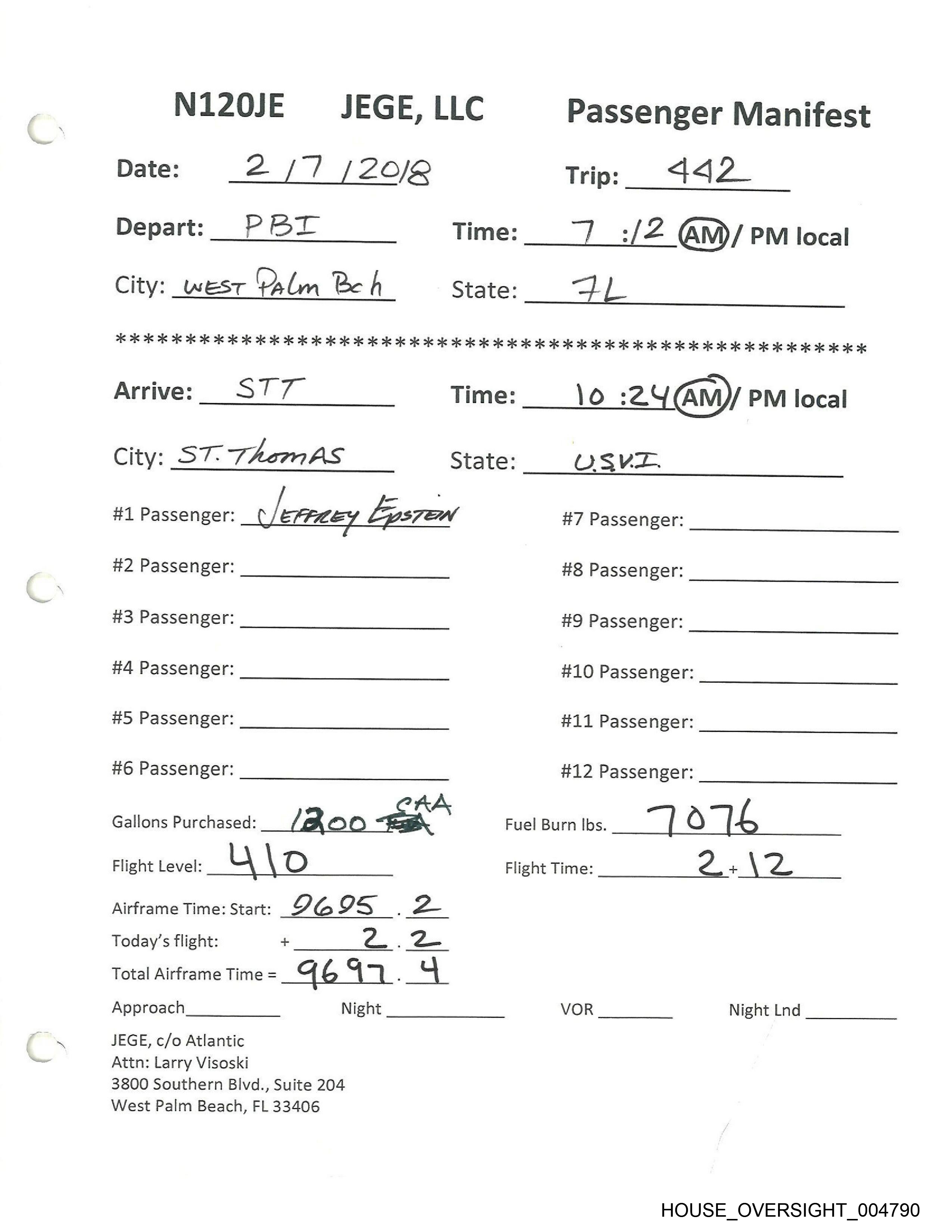 #1 Passenger: JEFFREY EPSTELN #7 Passenger: