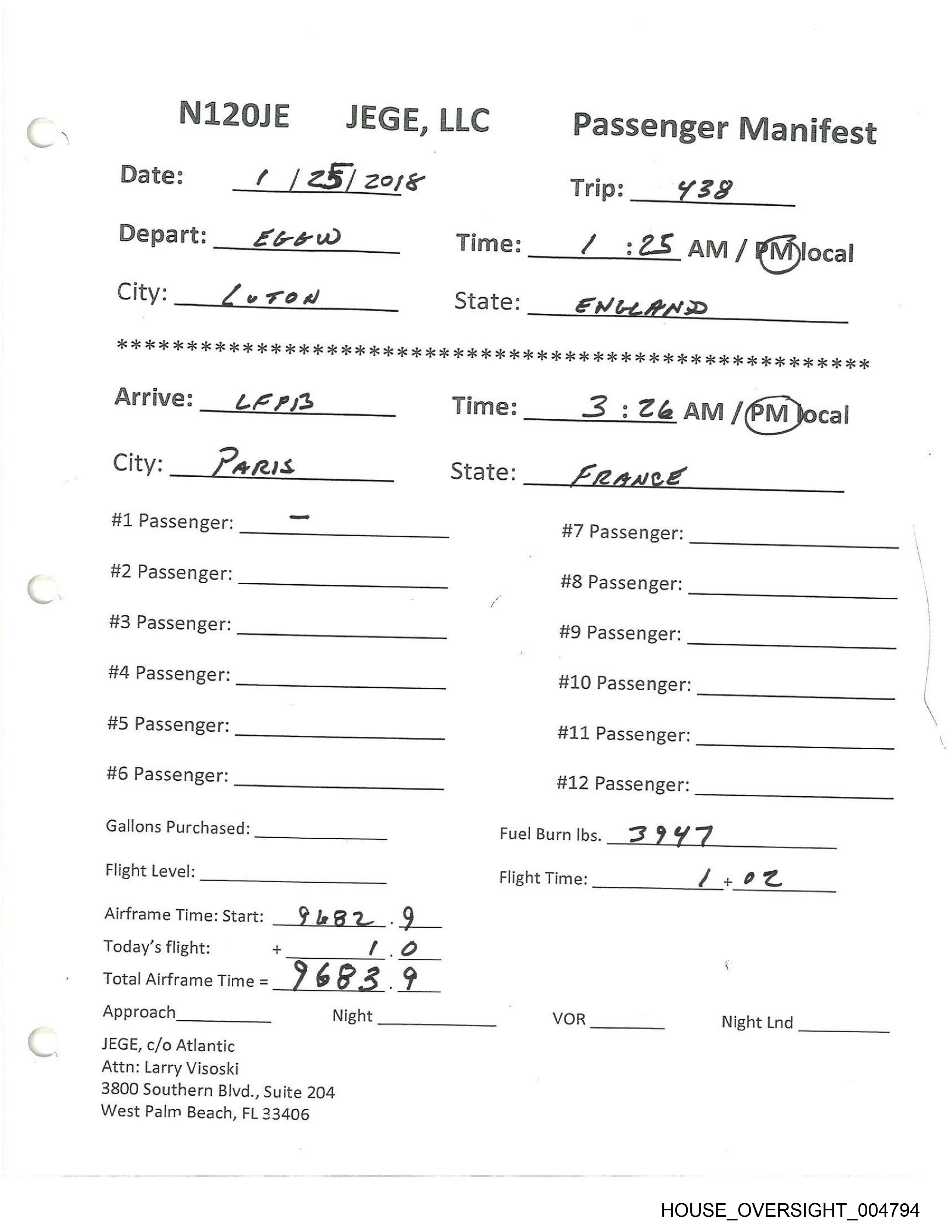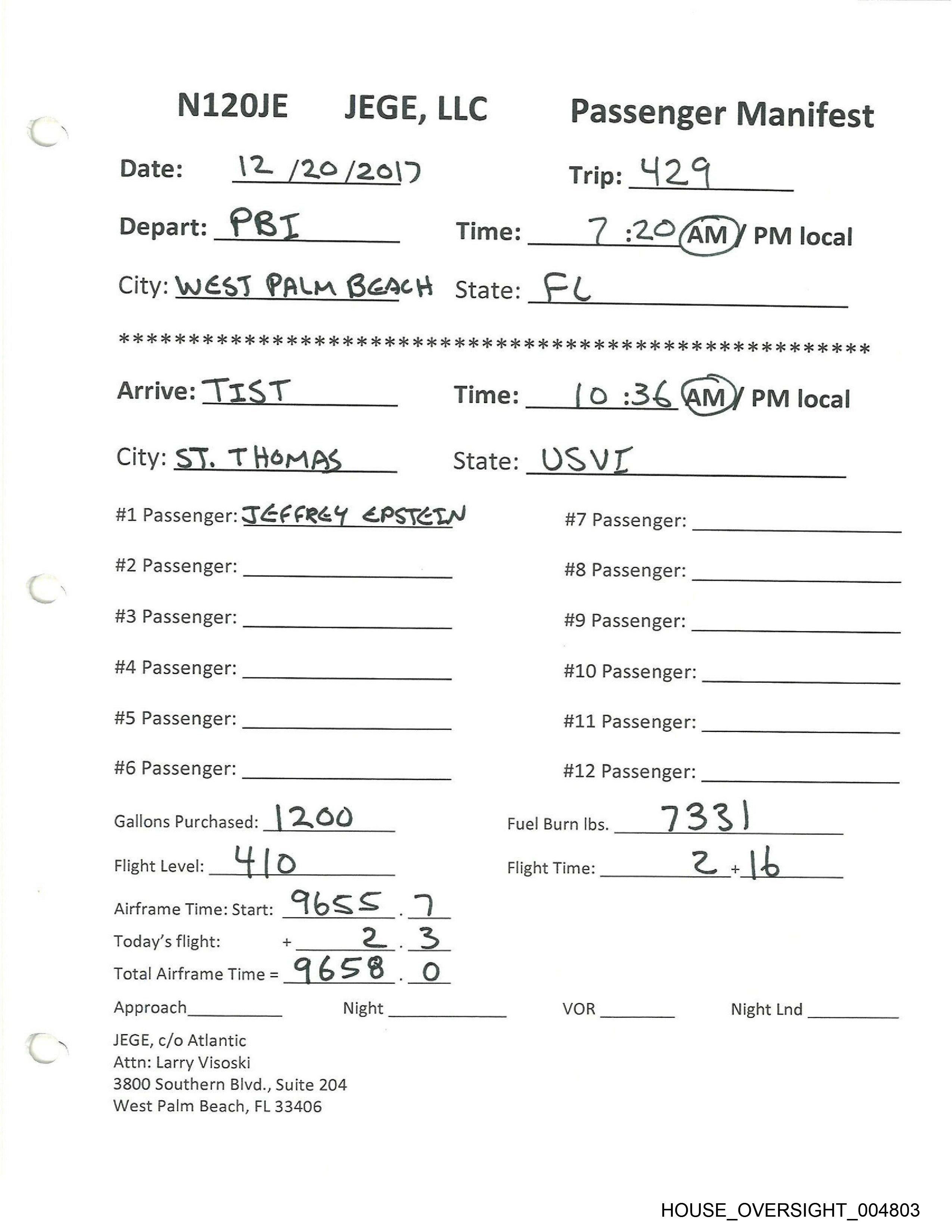 N120JE $JEGE, LLC Passenger Manifest