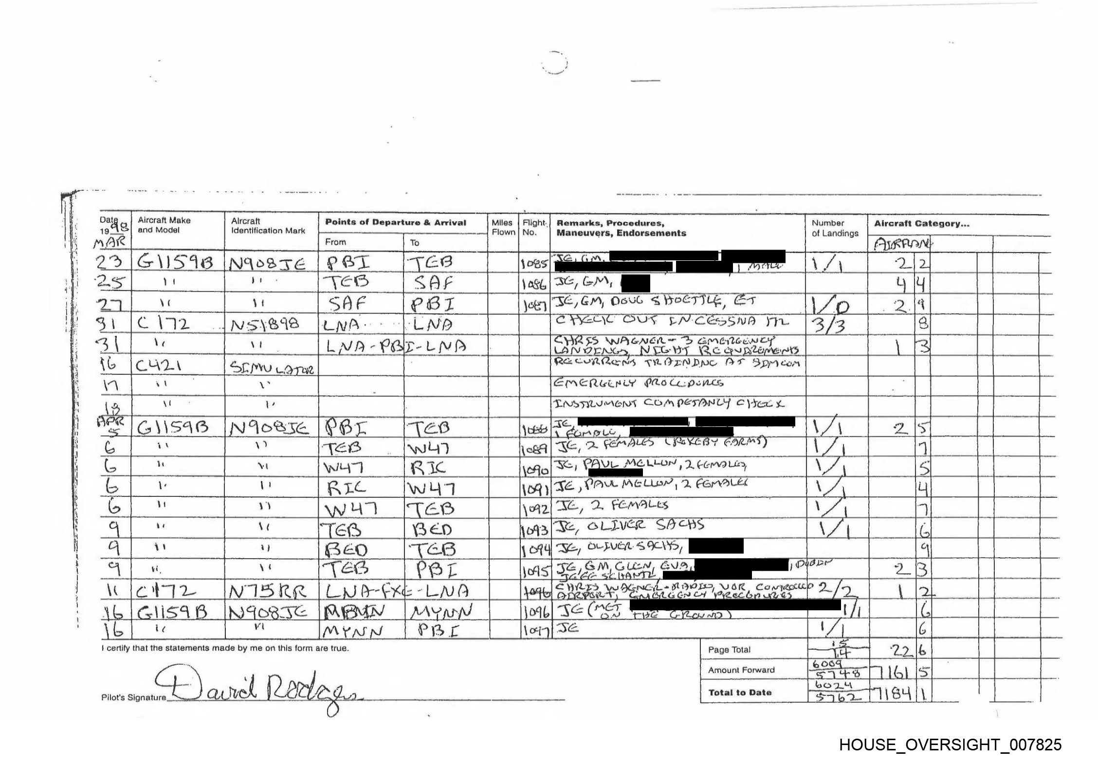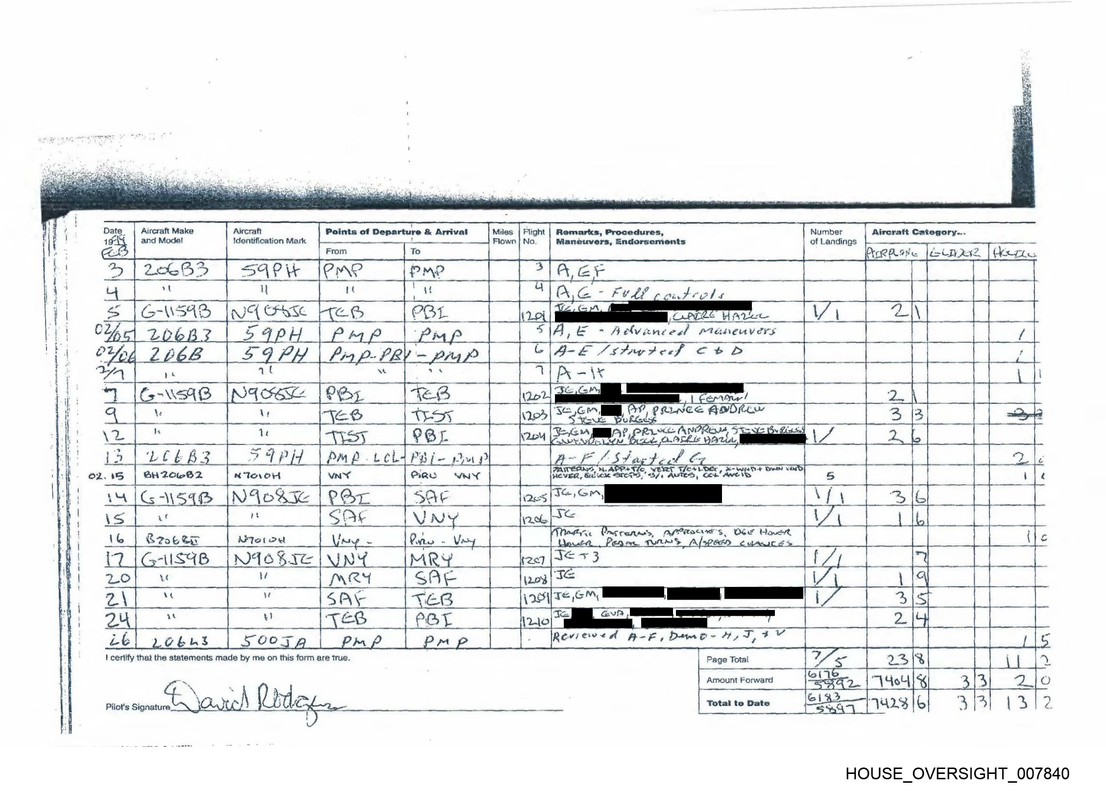= and Model Identification Mark Flown | No. Maneuvers, Endorsements of Landings