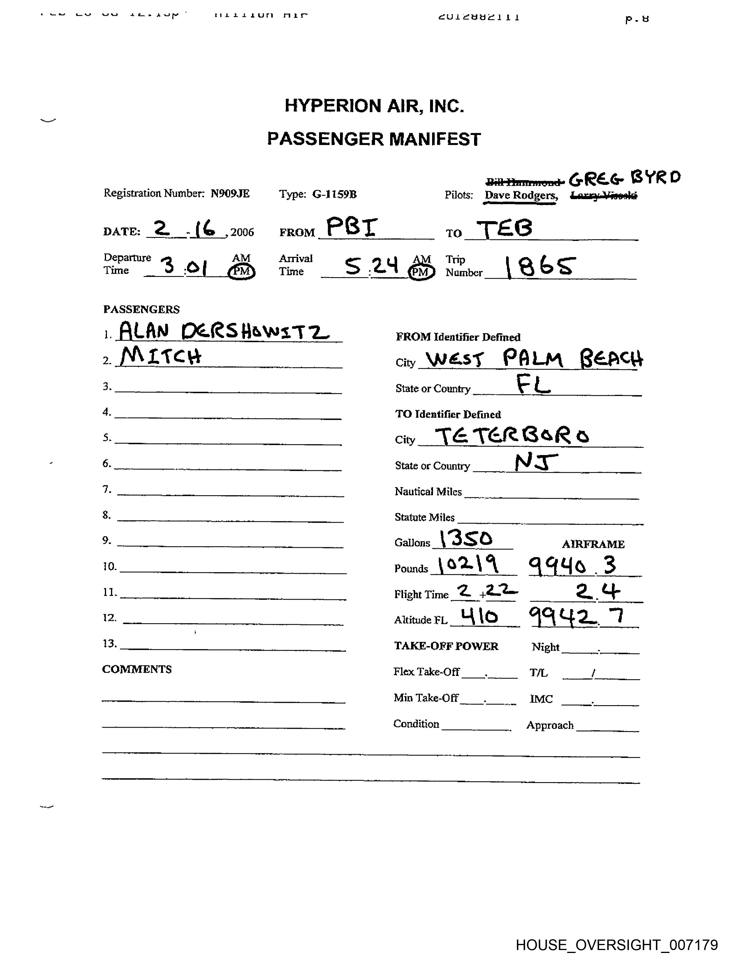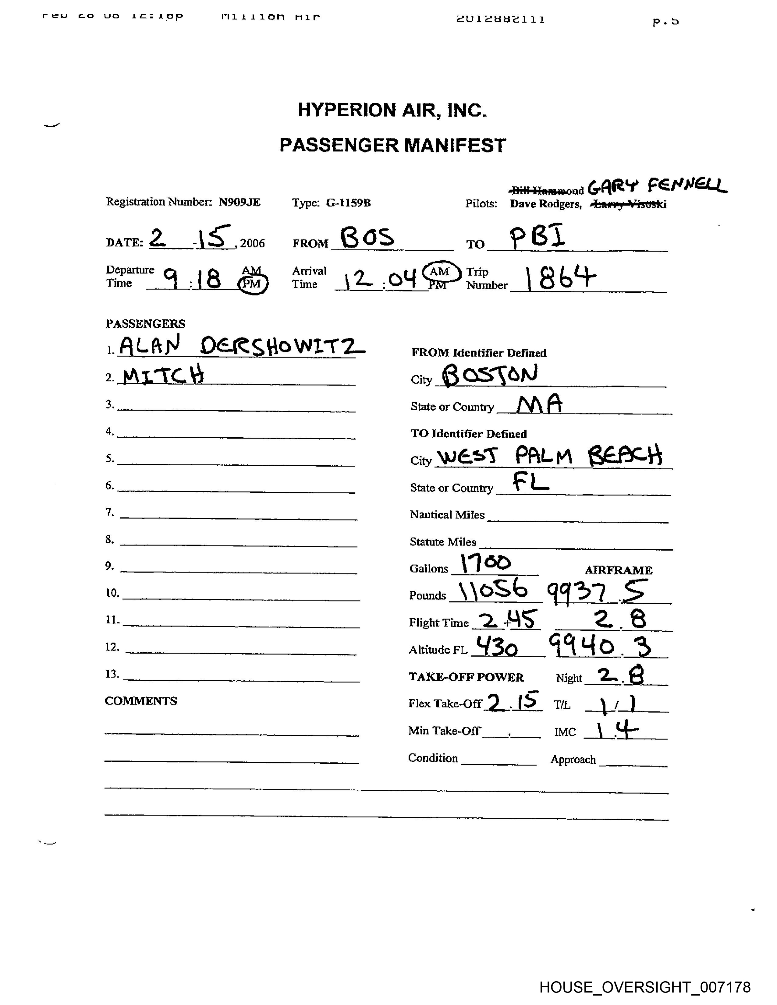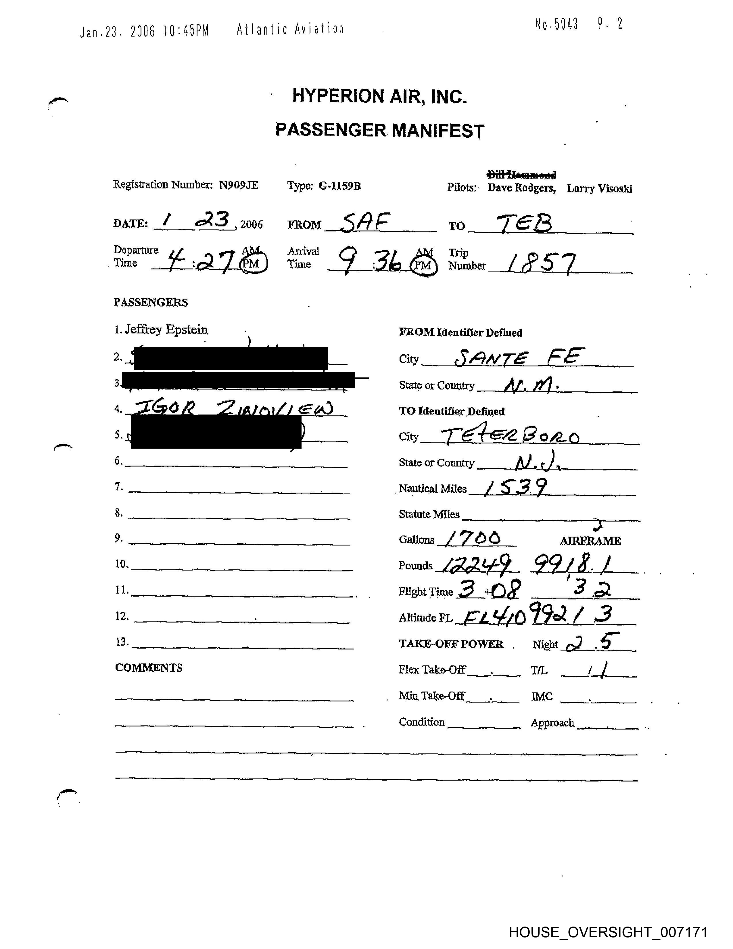oan ll sd AO. hup Fatih id Lith rele @ULeHdaelil Pp.2 HYPERION AIR, INC. PASSENGER MANIFEST Bili Hammond Registration Number: NSO9JE . ‘Type: G-1159B =. ' Pilots: Daye Rodgers, Larry Visoski DATE: 2 - 2006 FROM (¢¢ TO. 7 / fF Departure ap Arrival A Trip Time ox? : 3 S pm Time { : Zf , Number lex bs ou PASSENGERS 1. Jeffrey Epstein ” FROM Identifier Defined 2, City C /eve / o>” Se. 3, frwOow?s Eww 7a Dod. State or Country oe 4 /O TO Identifier Defined | 4. 5. City S 7: 7 Ao n- A 5 “ 6. . State or Country Lacs i’ f ts . Nautical Miles / 2 ls 8. Statute Miles 2 [ 9? 7 eo 9. Gallons {EOD AIRFRAME 10. Pounds “3 232. 2925 4 il. |. Flight Time <5 IS 3 Aan (2 | Altitude FL Yo 7 7? 3 oe _ 13. | ot | TAKE-OFF POWER, Night. COMMENTS sot : FlexTake-Off_ TH AIA Min Take-Off. Ss Condition Approach HOUSE_OVERSIGHT_007176
