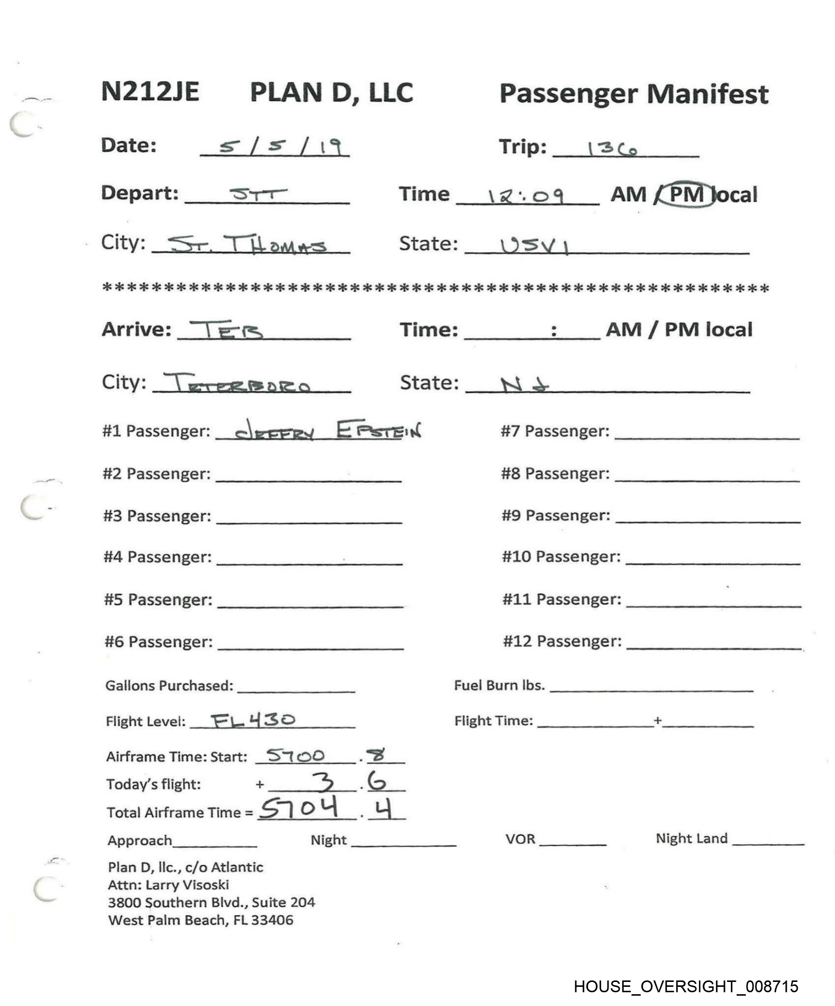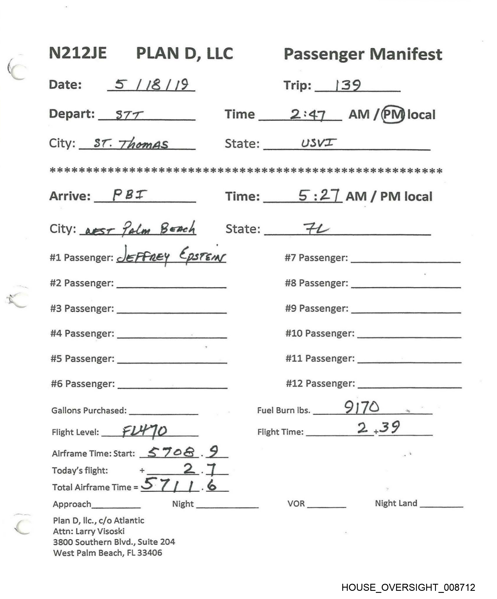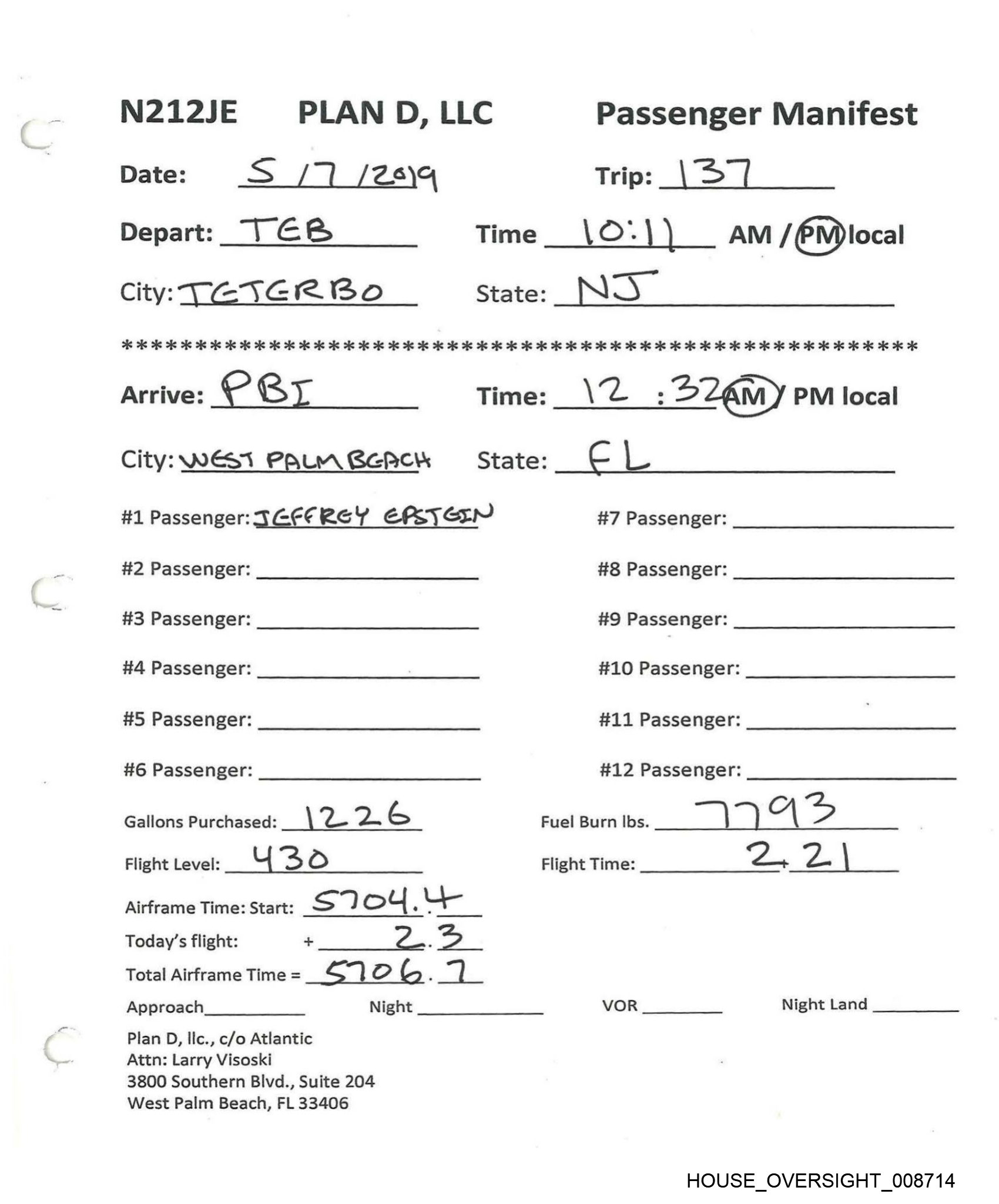 N212JE PLAN D, LLC Passenger Manifest Date: Ss /12 / 2019 Trip: «1138 Depart: PA Time___ 2:58 AM /(PM)local City: west Aun Bes State: ZL 26 AR As os 28 28 oe is ie ee ee ie is 2k 2S he 2 2 ie fe ee ie he 2 oie oie he 2 2 2 oie oe oe ie oo 3 OK oe oe KKK eK Arrive: STT Time: SS’ :O8 AM {PD local City: 8ST thewas State: USVZ #1 Passenger: Jerfeey Ehs Tein’ #7 Passenger: #2 Passenger: #8 Passenger: #3 Passenger: #9 Passenger: #4 Passenger: #10 Passenger: #5 Passenger: #11 Passenger: #6 Passenger: #12 Passenger: Gallons Purchased: Fuel Burn Ibs. LE8 / _ Flight Level: FL ¥/0 Flight Time: 2. + LO Airframe Time: Start: 6 7O G_. ] Today’s flight: + a Total Airframe Time = 5-7 & § : G Approach Night VOR Night Land Plan D, Ilc., c/o Atlantic Attn: Larry Visoski 3800 Southern Blvd., Suite 204 West Palm Beach, FL 33406 HOUSE _OVERSIGHT_008713