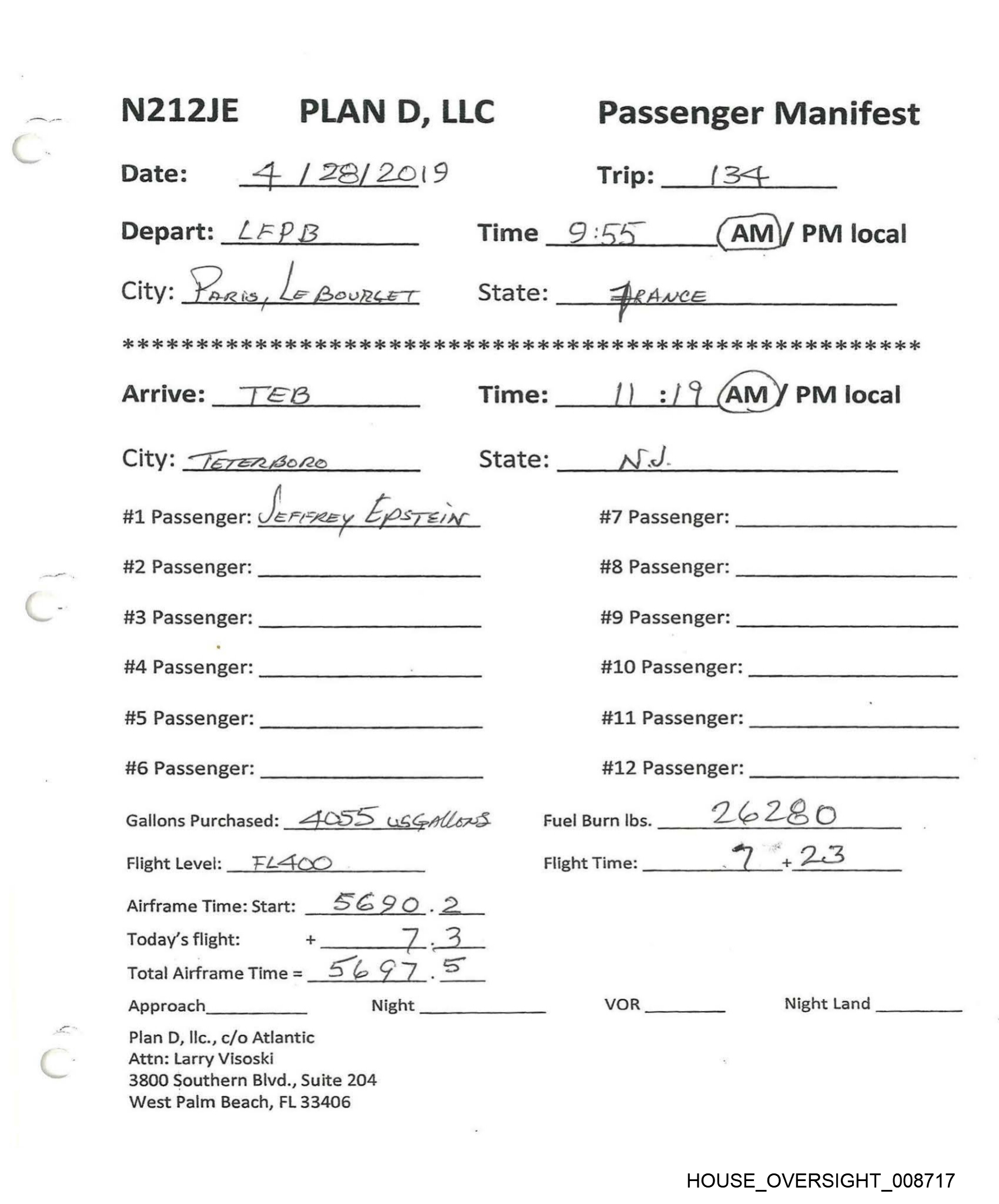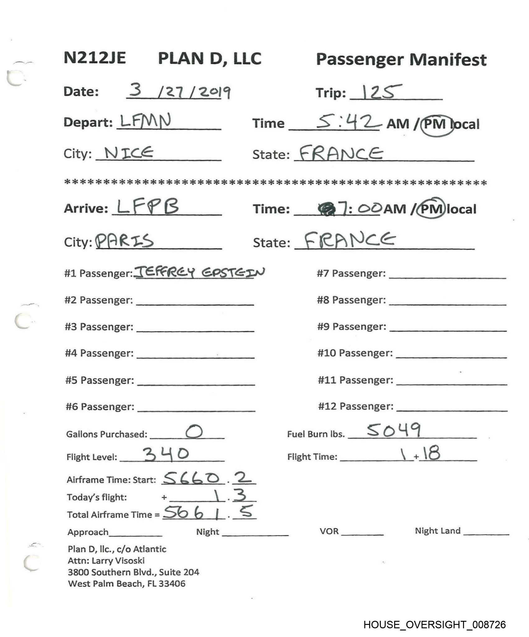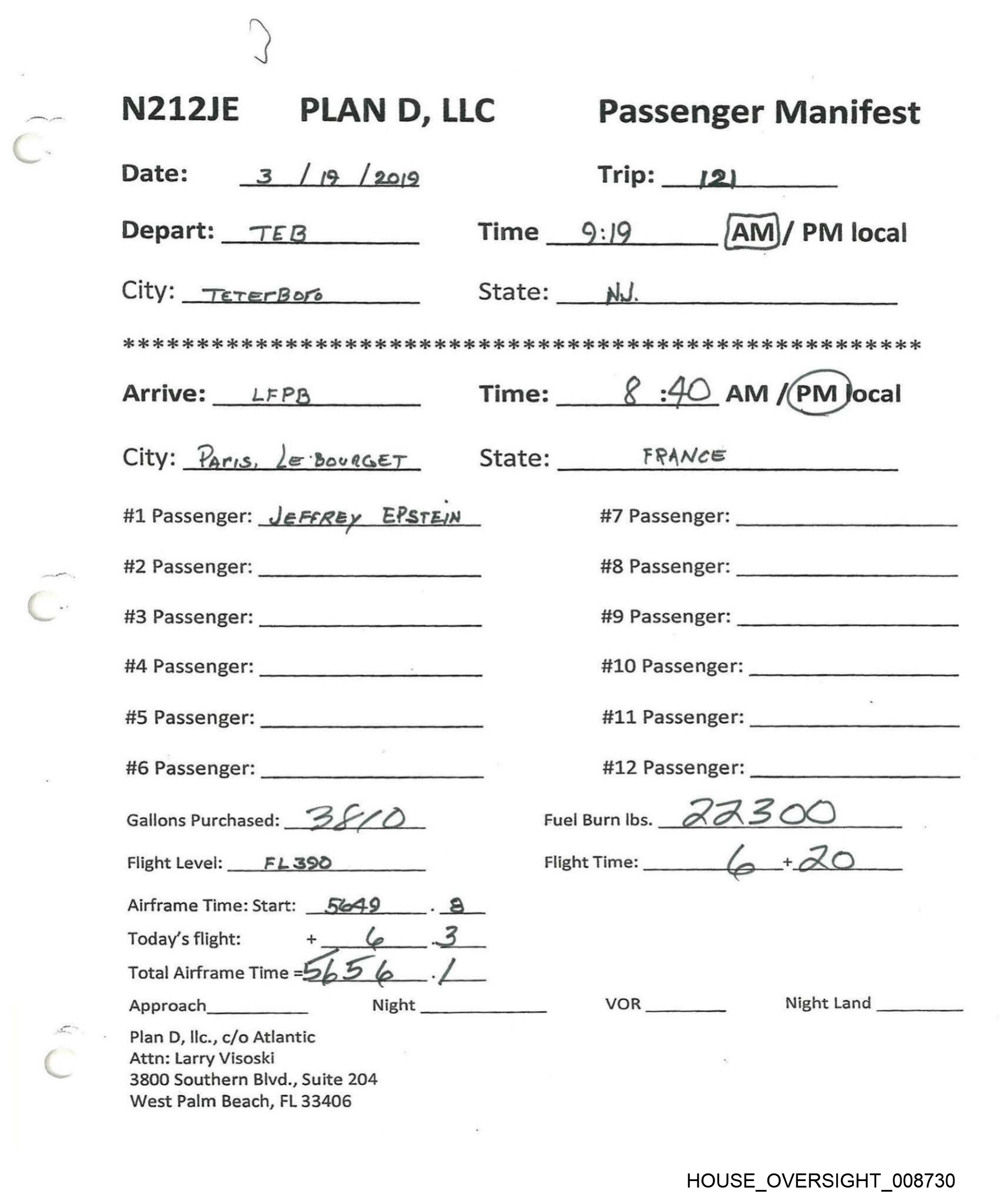 f N212JE PLAN D, LLC Passenger Manifest Date: 3 / 19 /20:9 Trip: 12) Depart: TEB Time _9:/9 fam)/ PM local City: —7ererBore State: NJ. oe 6 OK 6 oe 6 os eo ee eK OK ie 2 i OR OR Ke i ie 2 i 2 ok ok oe 2 Ok KK OK OK ok OK OK OK OK Kk OK Arrive: LF PB Time: k :4O AM {PM Jocal City: Yaris, de ‘Bow RET State: FRANCE #1 Passenger: JeFFREy EPSTEIN #7 Passenger: #2 Passenger: #8 Passenger: #3 Passenger: #9 Passenger: #4 Passenger: . #10 Passenger: #5 Passenger: #11 Passenger: #6 Passenger: #12 Passenger: Gallons Purchased: BE DO Fuel Burn lbs. oa aA s ox) Flight Level: FL396 Flight Time: ts Ps A ile Airframe Time: Start: __ 5@<4-9 a —| Today's flight: + 7 3 Total Airframe Time = . / Approach Night VOR Night Land Plan D, Ilc., c/o Atlantic Attn: Larry Visoski 3800 Southern Blvd., Suite 204 West Palm Beach, FL 33406 HOUSE _OVERSIGHT_008730