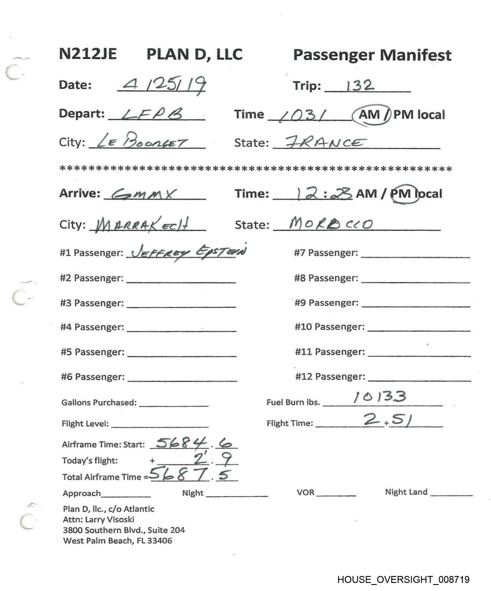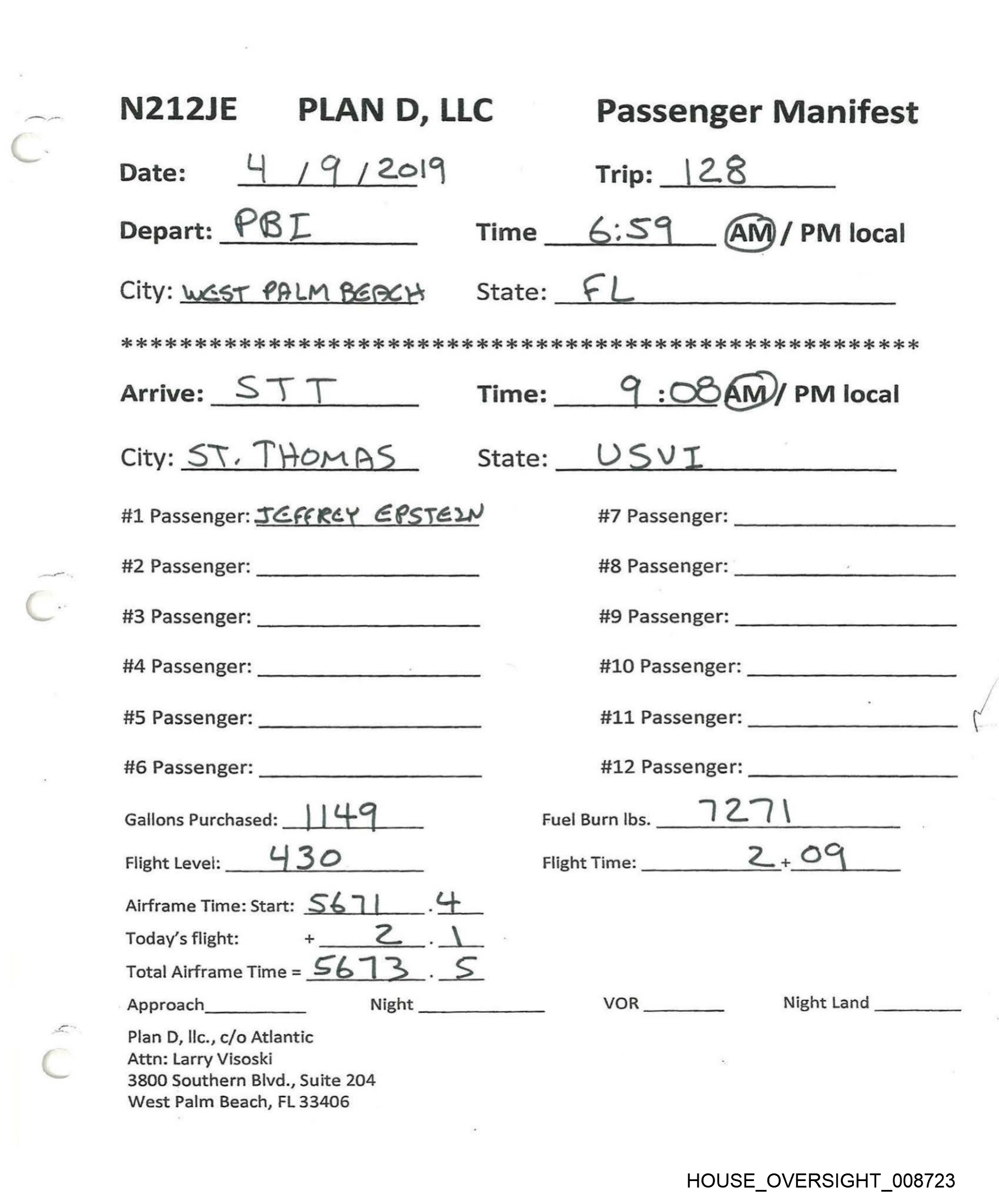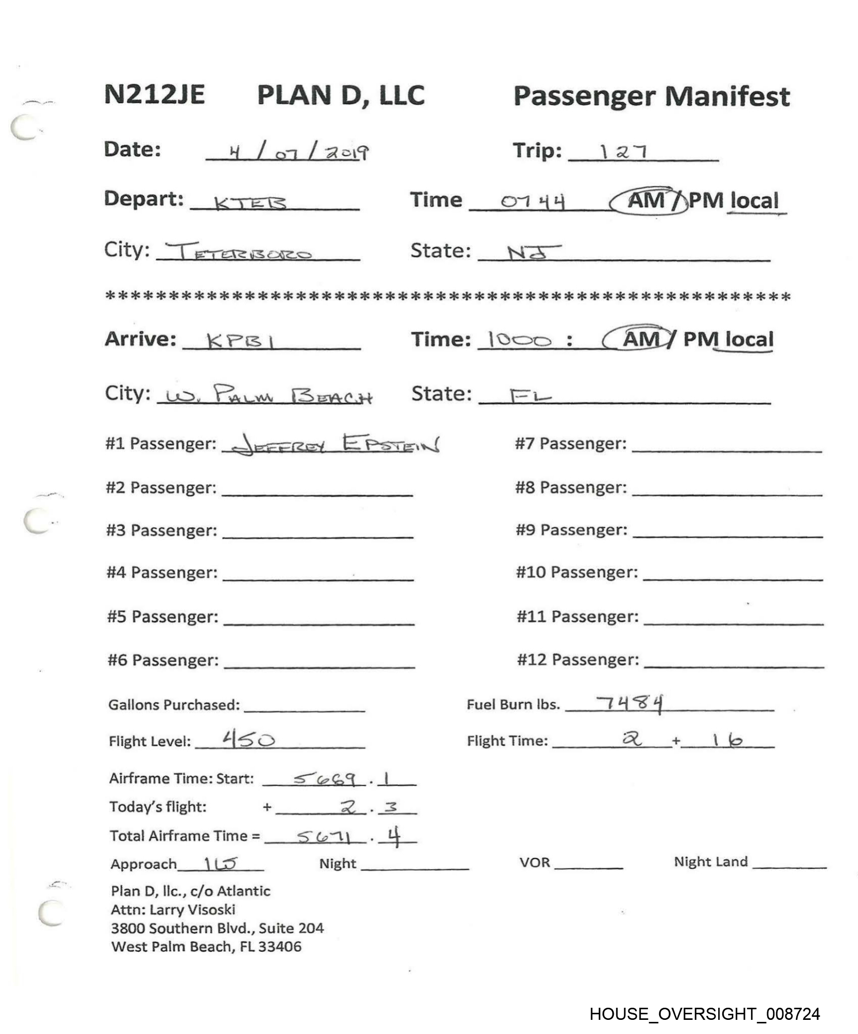 f N212JE PLAN D, LLC Passenger Manifest Date: 3 / 19 /20:9 Trip: 12) Depart: TEB Time _9:/9 fam)/ PM local City: —7ererBore State: NJ. oe 6 OK 6 oe 6 os eo ee eK OK ie 2 i OR OR Ke i ie 2 i 2 ok ok oe 2 Ok KK OK OK ok OK OK OK OK Kk OK Arrive: LF PB Time: k :4O AM {PM Jocal City: Yaris, de ‘Bow RET State: FRANCE #1 Passenger: JeFFREy EPSTEIN #7 Passenger: #2 Passenger: #8 Passenger: #3 Passenger: #9 Passenger: #4 Passenger: . #10 Passenger: #5 Passenger: #11 Passenger: #6 Passenger: #12 Passenger: Gallons Purchased: BE DO Fuel Burn lbs. oa aA s ox) Flight Level: FL396 Flight Time: ts Ps A ile Airframe Time: Start: __ 5@<4-9 a —| Today's flight: + 7 3 Total Airframe Time = . / Approach Night VOR Night Land Plan D, Ilc., c/o Atlantic Attn: Larry Visoski 3800 Southern Blvd., Suite 204 West Palm Beach, FL 33406 HOUSE _OVERSIGHT_008730