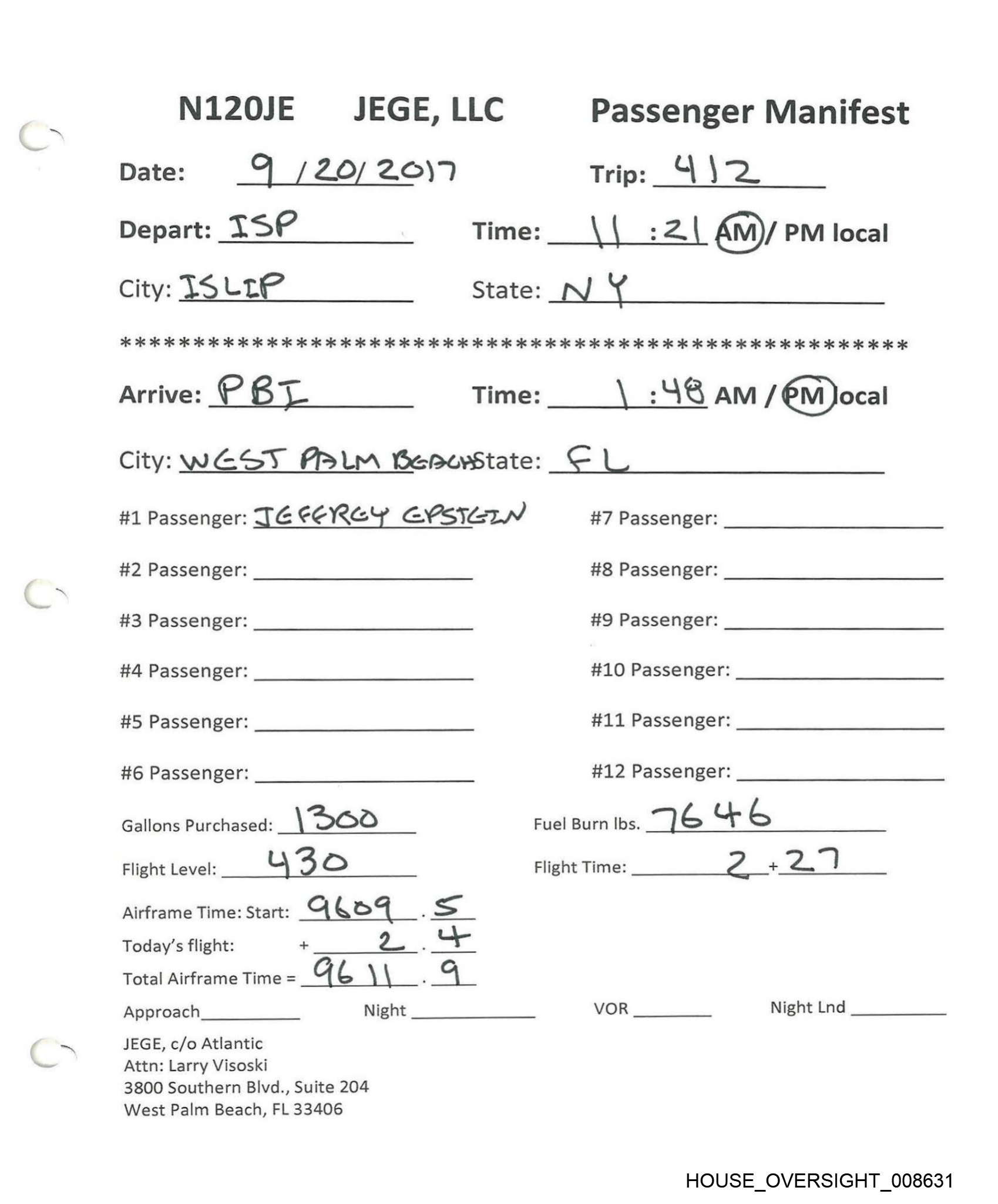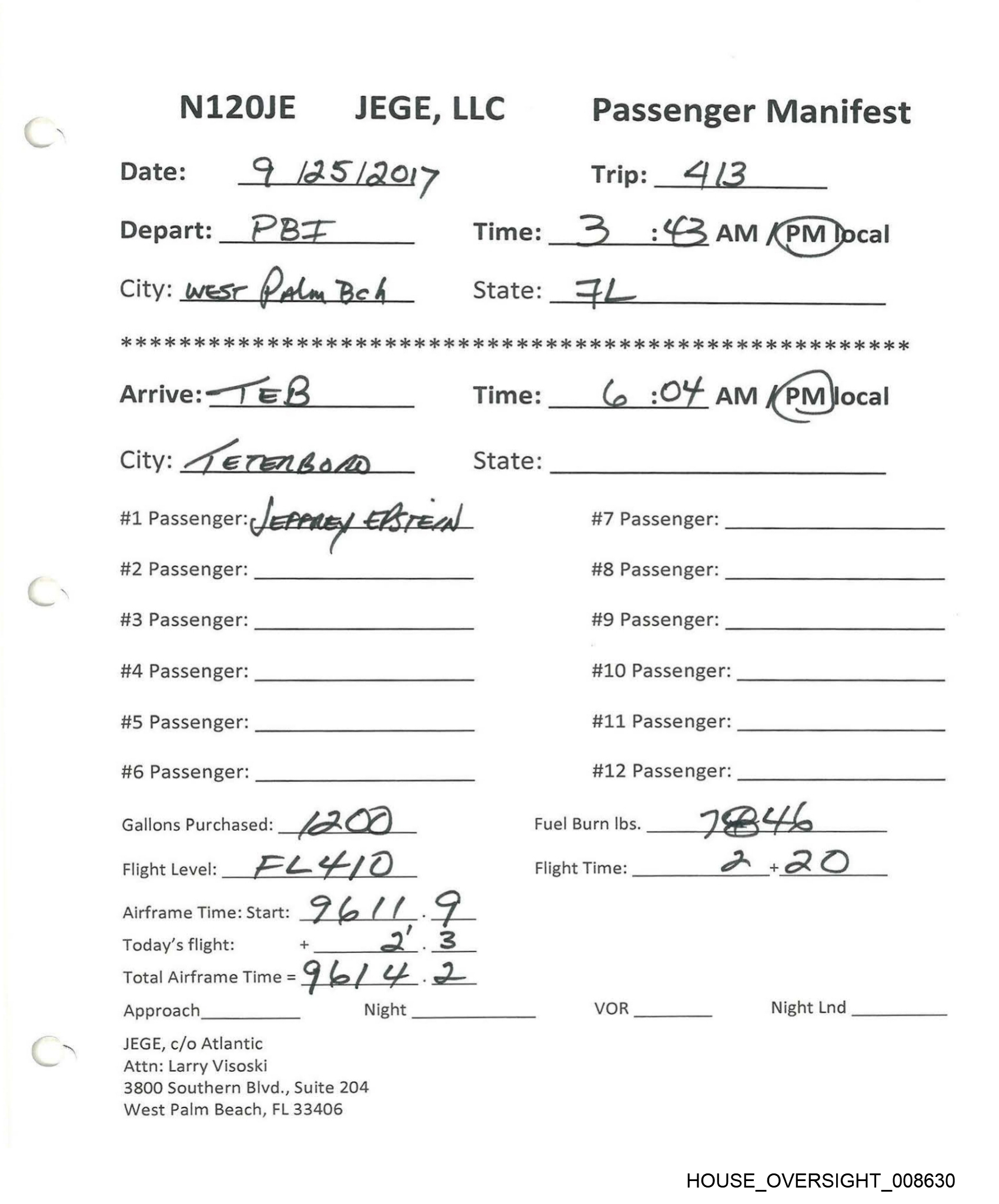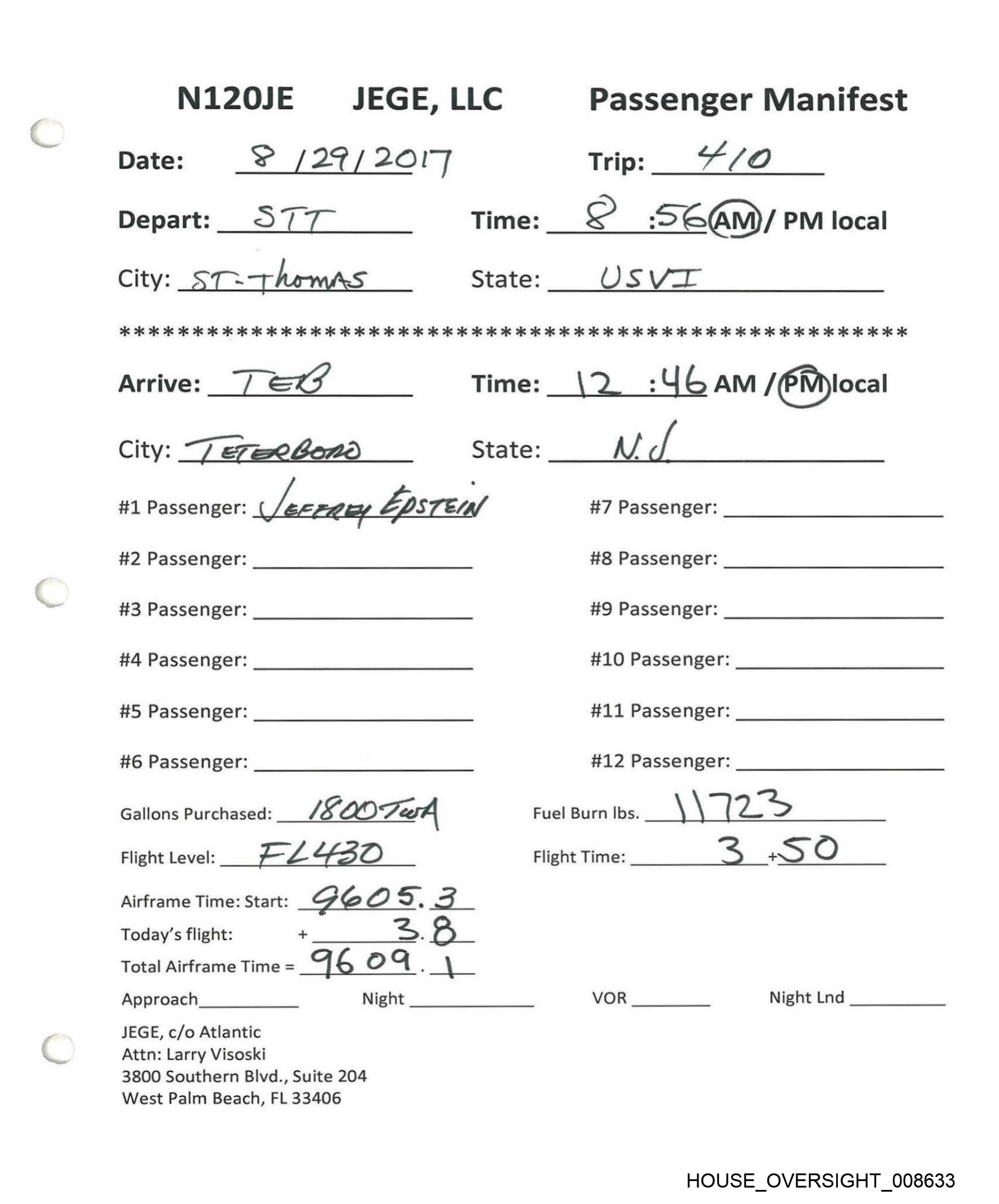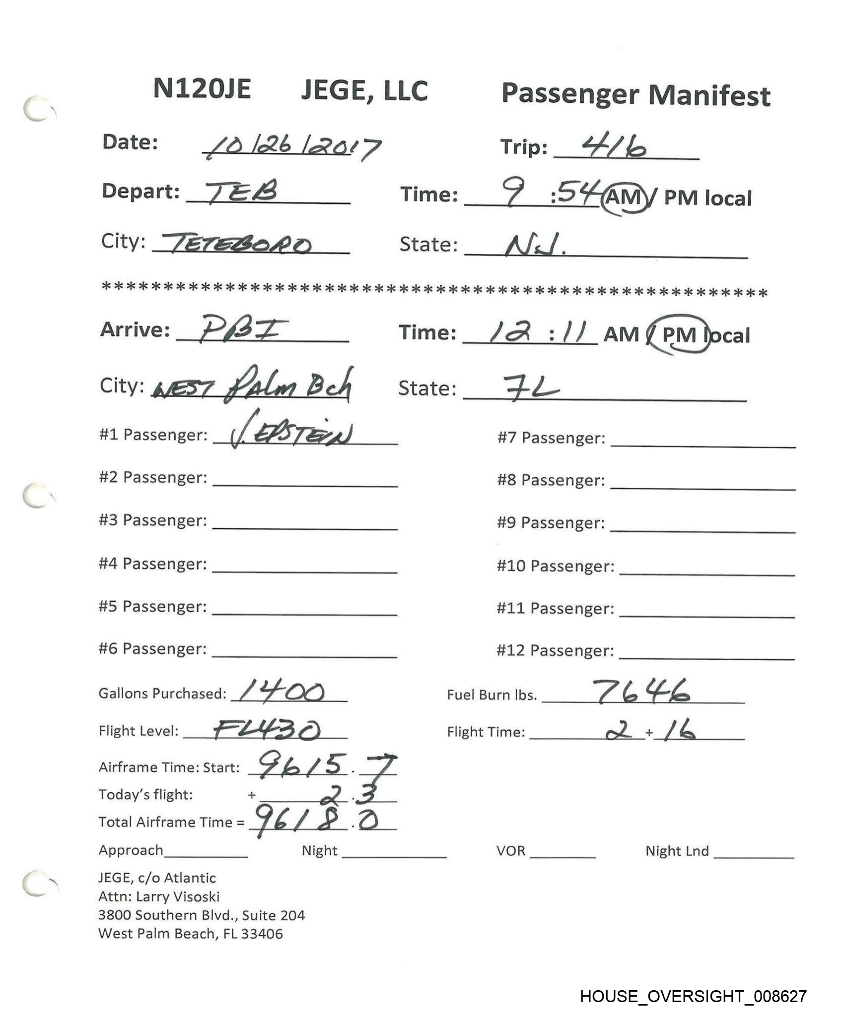 NI20JE §JEGE, LLC Passenger Manifest