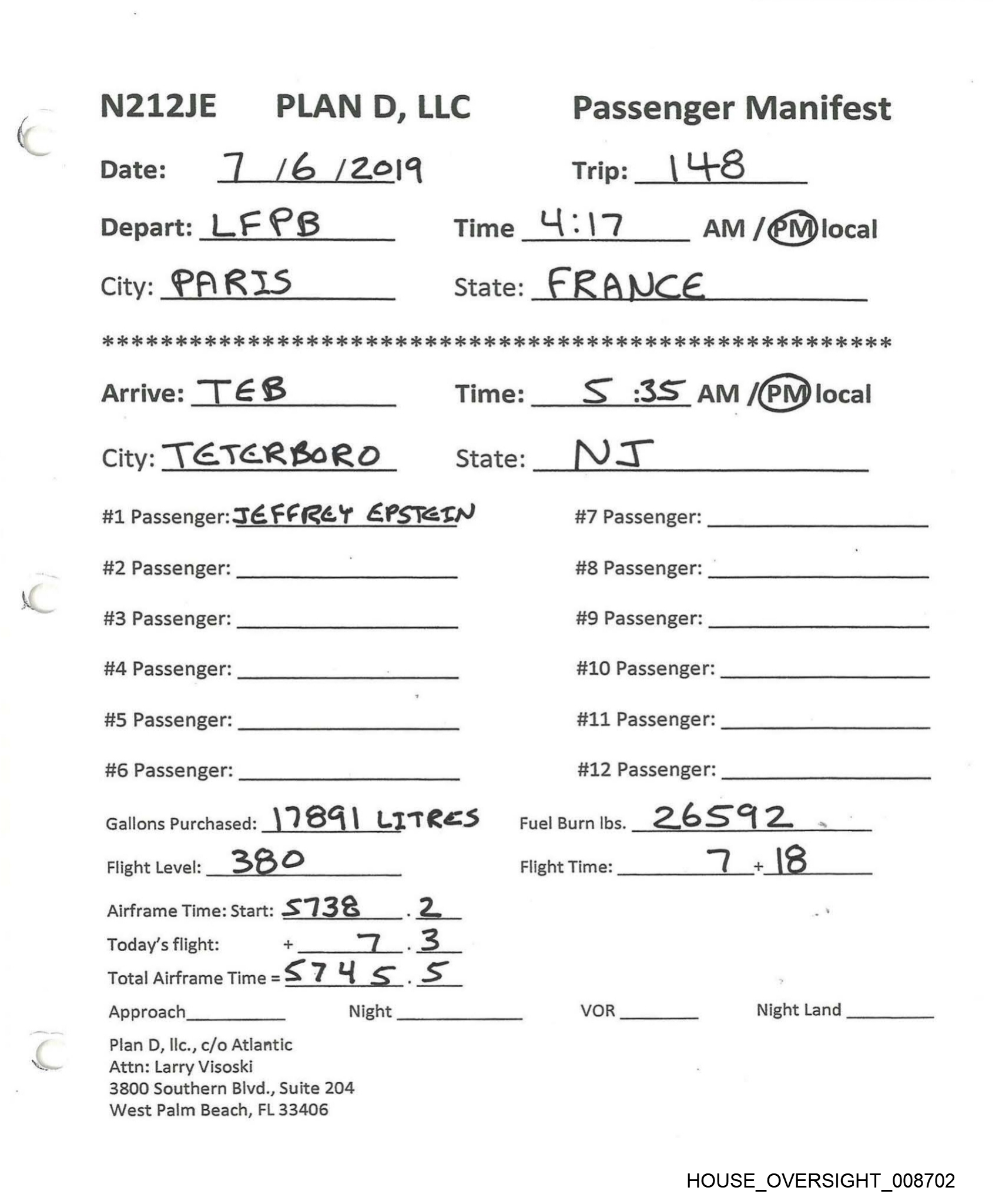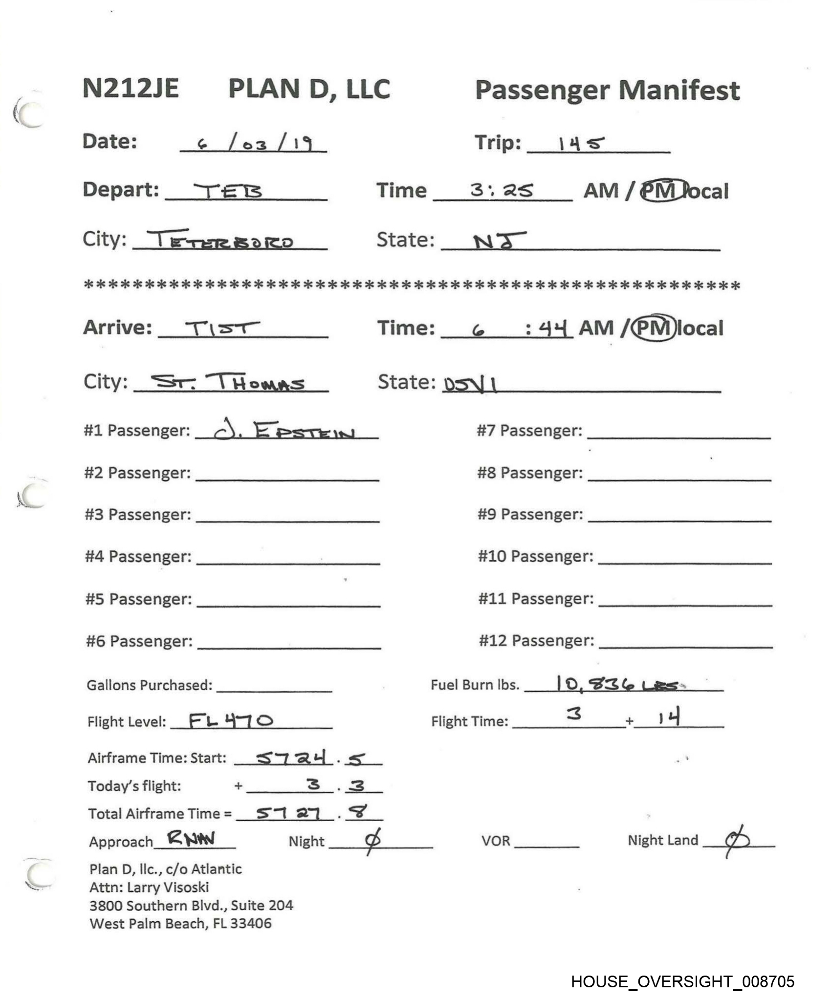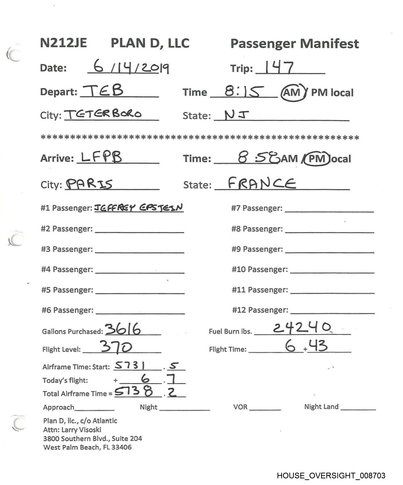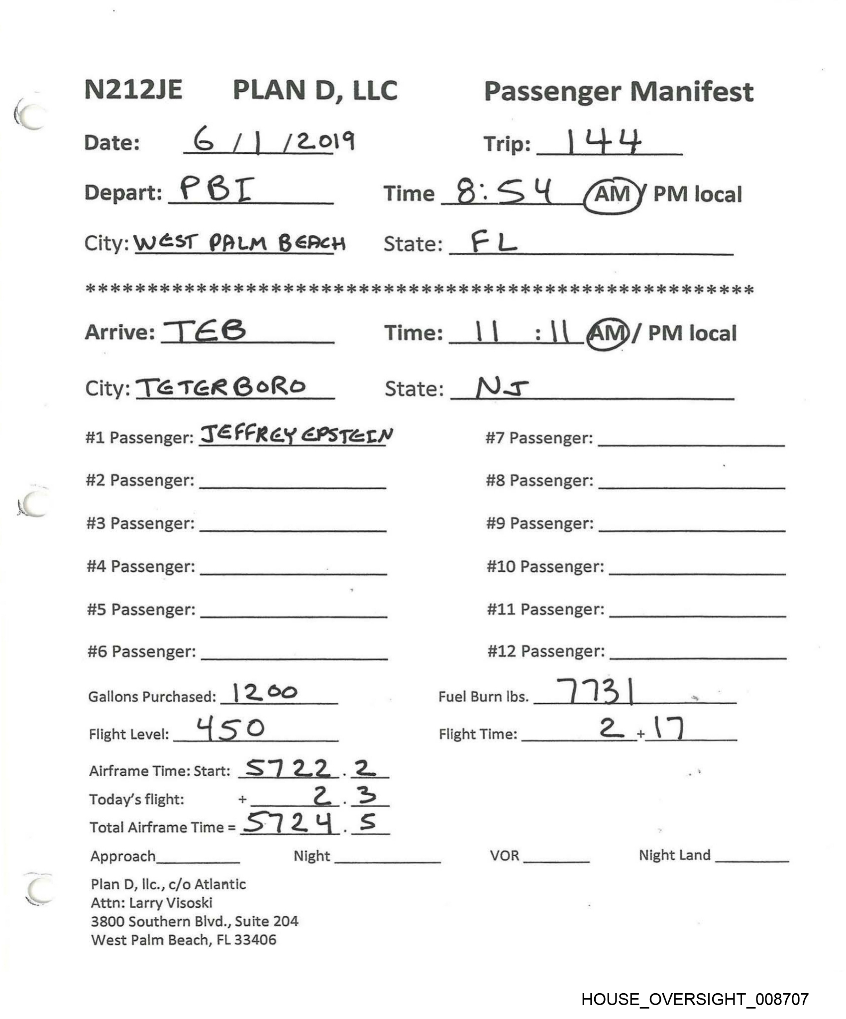 N212JE PLAN D, LLC Passenger Manifest