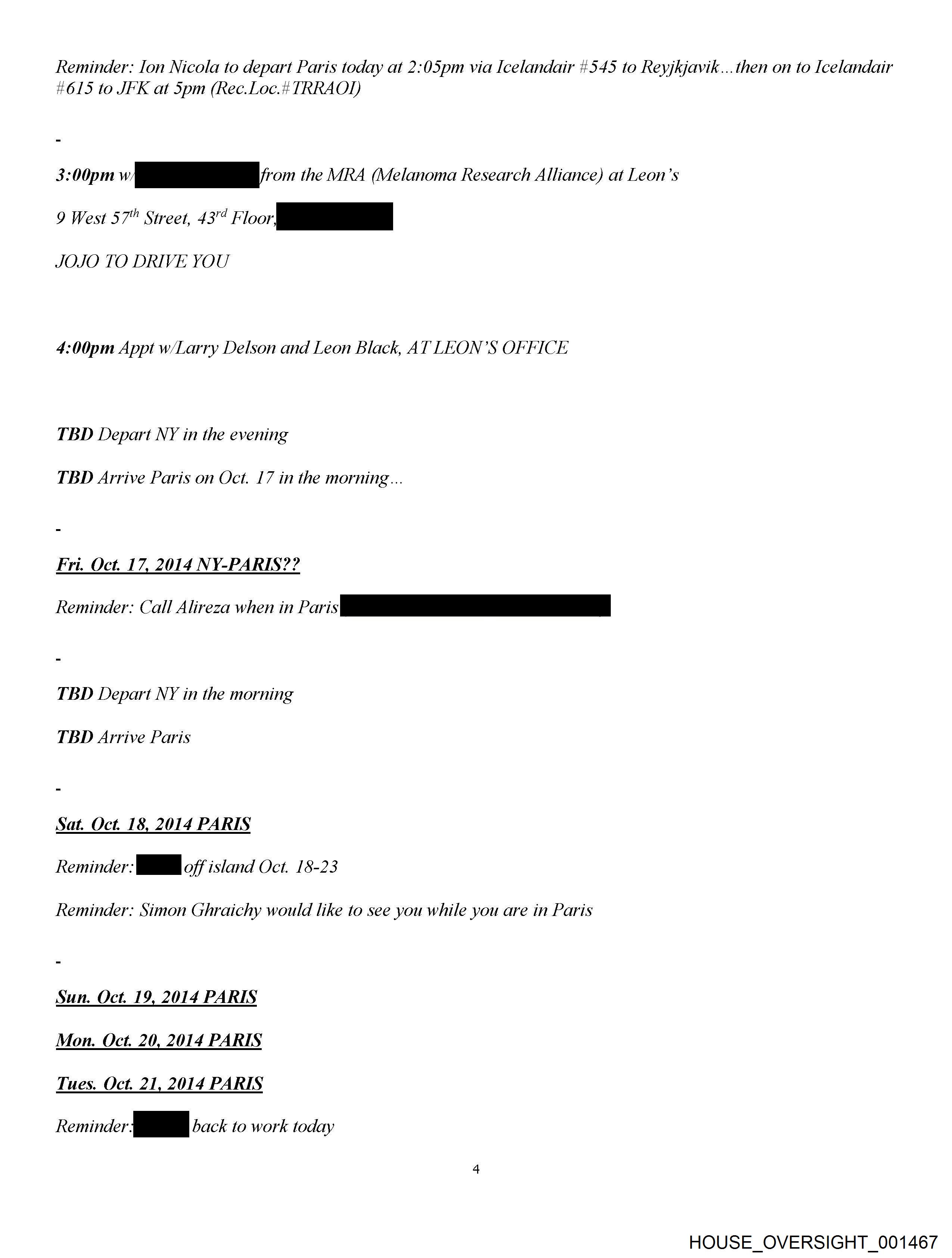 Reminder: Ion Nicola to depart Paris today at 2:05pm via Icelandair #545 to Reyjkjavik...then on to Icelandair #615 to JFK at 5pm (Rec.Loc.# TRRAOT) 3:00pm v TE jon the MRA (Melanoma Research Alliance) at Leon’s 9 West 57" Street, 43’¢ nf _- JOJO TO DRIVE YOU 4:00pm Appt w/Larry Delson and Leon Black, AT LEON’S OFFICE TBD Depart NY in the evening TBD Arrive Paris on Oct. 17 in the morning... Fri. Oct. 17, 2014 NY-PARIS?? Reminder: Call Alireza when in i( me le TBD Depart NY in the morning TBD Arrive Paris Sat. Oct. 18, 2014 PARIS Reminder: aa off island Oct. 18-23 Reminder: Simon Ghraichy would like to see you while you are in Paris Sun. Oct. 19, 2014 PARIS Mon. Oct. 20,2014 PARIS Tues. Oct. 21, 2014 PARIS Reminder ae back to work today HOUSE_OVERSIGHT_001467