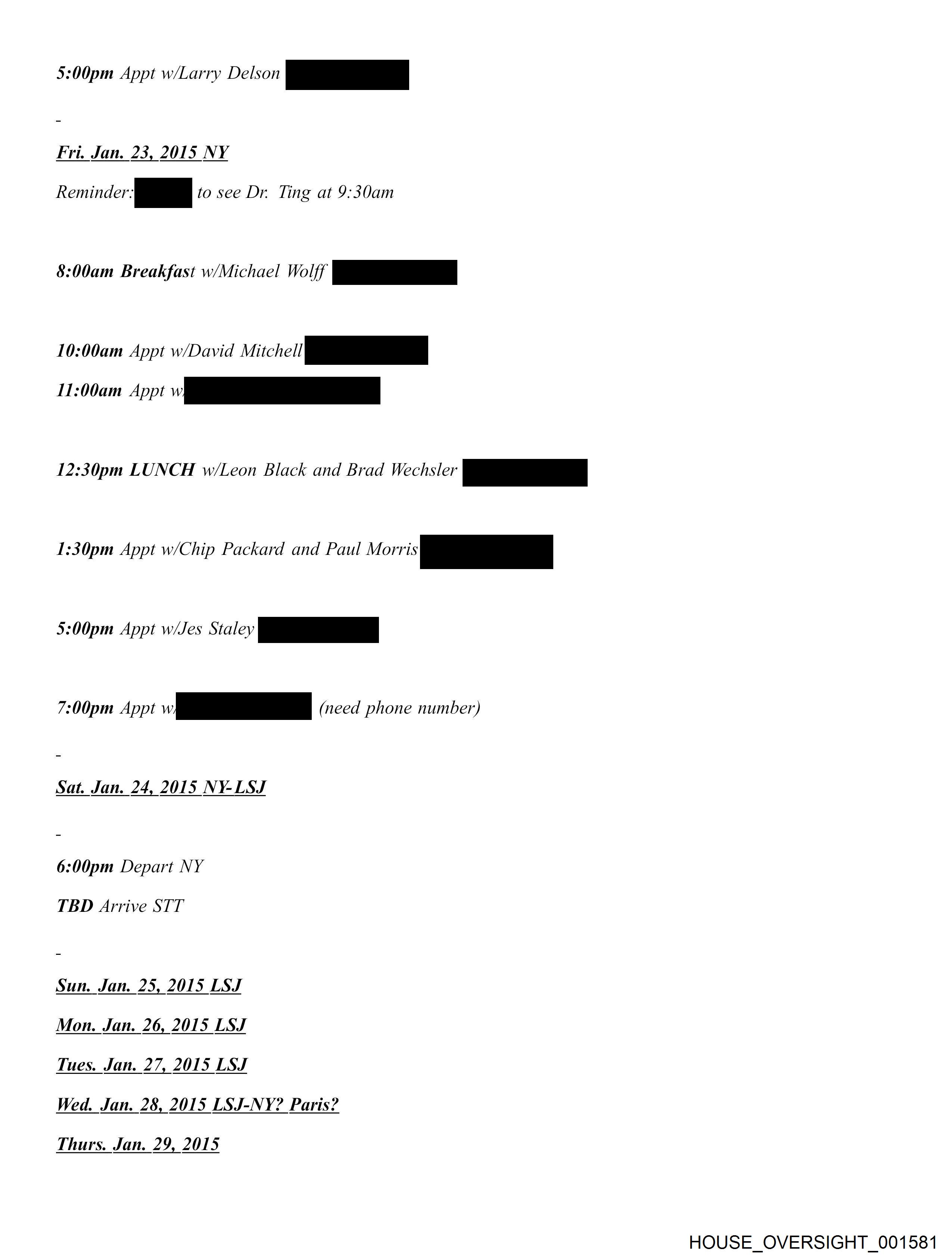 5:00pm Appt w/Larry Delson pe Fri. Jan. 23, 2015 NY Reminder to see Dr. Ting at 9:30am 8:00am Breakfast w/Michael Wolff pe 10:00am Appt w/David Mitchell pe 12:30pm LUNCH w/Leon Black and Brad Wechsler pe 1:30pm Appt w/Chip Packard and Paul oni -_ 5:00pm Appt w/Jes We 7:00pm Appt LLL (need phone number) Sat. Jan. 24, 2015 NY-LSJ 6:00pm Depart NY TBD Arrive STT Sun. Jan. 25, 2015 LSJ Mon. Jan. 26, 2015 LSJ Tues. Jan. 27, 2015 LSJ Wed. Jan. 28, 2015 LSJ-NY? Paris? Thurs. Jan. 29, 2015 HOUSE_OVERSIGHT_001581