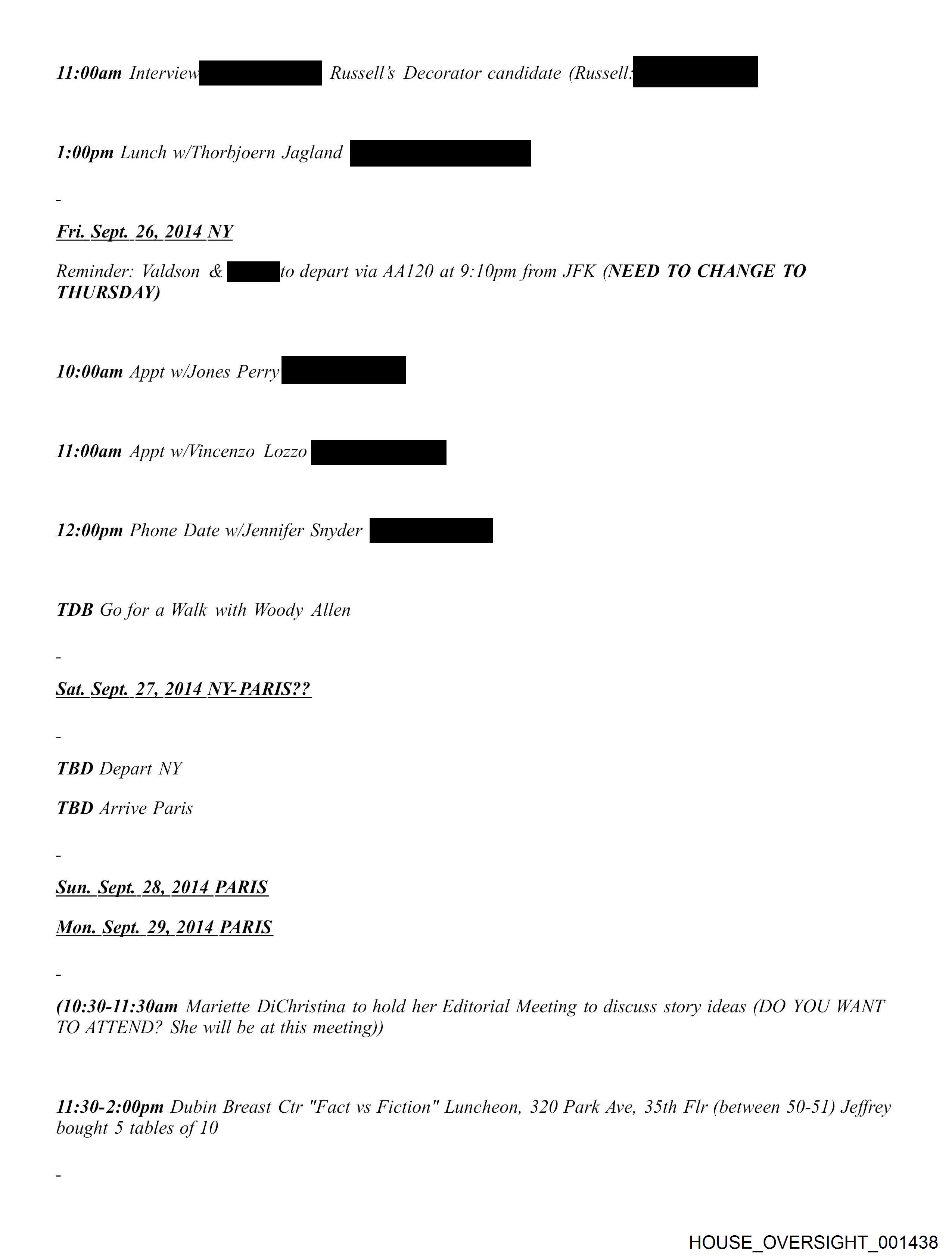 11:00am oma | Russells Decorator candidate wi _ 1:00pm Lunch w/Thorbjoern Jagland pt Fri. Sept. 26, 2014 NY Reminder: Valdson & Q@#@to depart via AA120 at 9:10pm from JFK (NEED TO CHANGE TO THURSDAY) 10:00am Appt w/Jones Penh 11:00am Appt w/Vincenzo Lozzo Be 12:00pm Phone Date w/Jennifer Snyder pe TDB Go for a Walk with Woody Allen Sat. Sept. 27, 2014 NY-PARIS?? TBD Depart NY TBD Arrive Paris Sun. Sept. 28, 2014 PARIS Mon. Sept. 29, 2014 PARIS (10:30-11:30am Mariette DiChristina to hold her Editorial Meeting to discuss story ideas (DO YOU WANT TO ATTEND? She will be at this meeting)) 11:30-2:00pm Dubin Breast Ctr "Fact vs Fiction" Luncheon, 320 Park Ave, 35th Flr (between 50-51) Jeffrey bought 5 tables of 10 HOUSE_OVERSIGHT_001438
