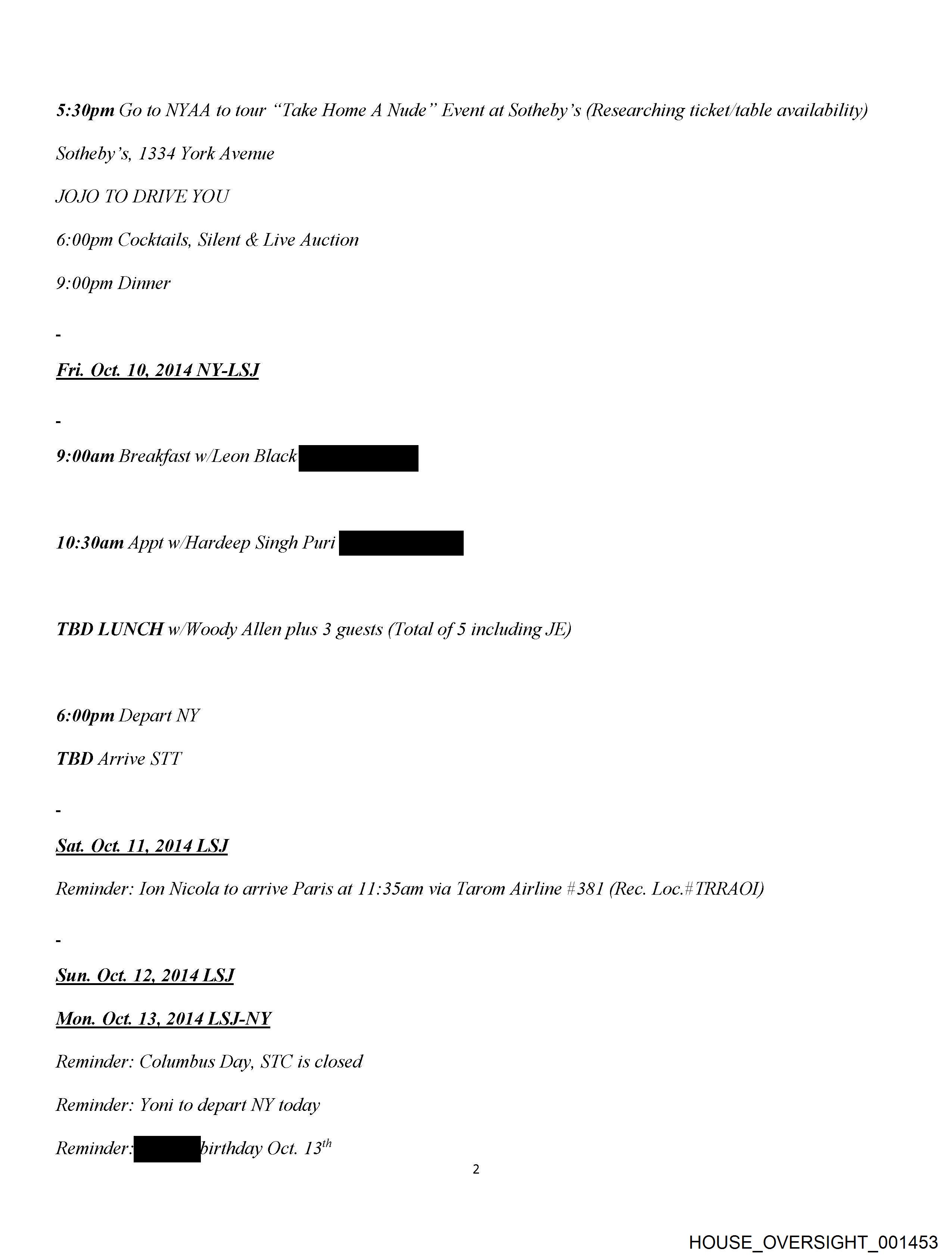 5:30pm Go to NYAA to tour “Take Home A Nude” Event at Sotheby’s (Researching ticket/table availability) Sotheby's, 1334 York Avenue JOJO TO DRIVE YOU 6:00pm Cocktails, Silent & Live Auction 9:00pm Dinner Fri. Oct. 10,2014 NY-LSJ 9:00am Breakfast w/Leon hn _—_-, 10:30am Appt w/Hardeep Singh Puri PY TBD LUNCH w/Woody Allen plus 3 guests (Total of 5 including JE) 6:00pm Depart NY TBD Arrive STT Sat. Oct. 11, 2014 LSJ Reminder: Ion Nicola to arrive Paris at 11:35am via Tarom Airline #381 (Rec. Loc.¢ TRRAOD) Sun. Oct. 12, 2014 LSJ Mon. Oct. 13, 2014 LSJ-NY Reminder: Columbus Day, STC is closed Reminder: Yoni to depart NY today Reminder AM) irthday Oct. 13” HOUSE_OVERSIGHT_001453