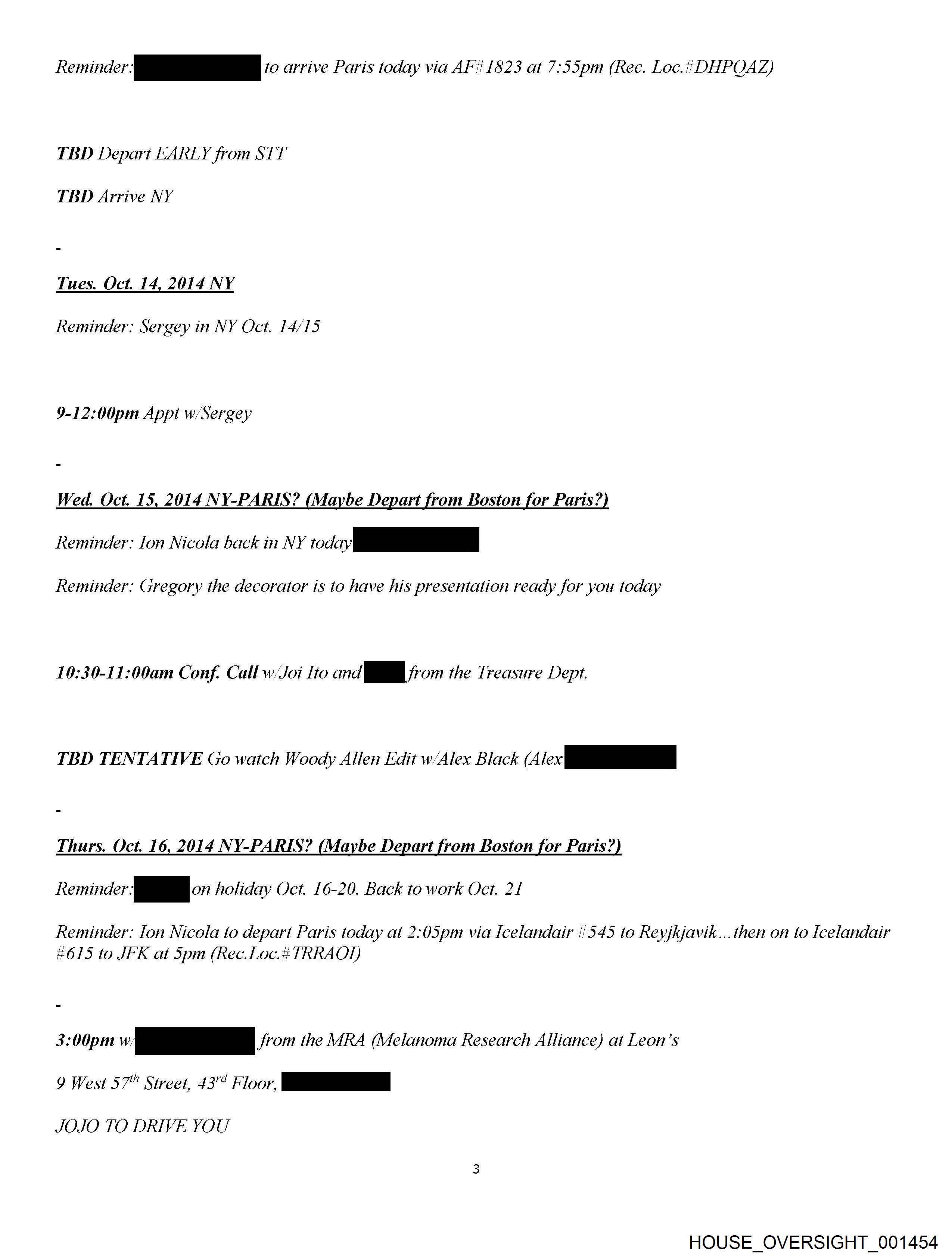 10:30-11:00am Conf. Call w/Joi Ito ani from the Treasure Dept. TBD TENTATIVE Go watch Woody Allen Edit w/Alex Black ou Thurs. Oct. 16, 2014 NY-PARIS? (Maybe Depart from Boston for Paris?) Reminder. iin holiday Oct. 16-20. Back to work Oct. 21 Reminder: Ion Nicola to depart Paris today at 2:05pm via Icelandair #545 to Reyjkjavik...then on to Icelandair #615 to JFK at 5pm (Rec.Loc.# TRRAOTD) 3:00pm w/ RR 5:01 the MRA (Melanoma Research Alliance) at Leon’s 9 West 57" Street, 43"¢ tos JOJO TO DRIVE YOU 4:00pm Appt w/Larry Delson and Leon Black, AT LEON’S OFFICE TBD Depart NY in the evening TBD Arrive Paris on Oct. 17 in the morning... Fri. Oct. 17, 2014 NY-PARIS?? Reminder: Call Alireza when in ih TBD Depart NY in the morning TBD Arrive Paris Sat. Oct. 18, 2014 PARIS HOUSE_OVERSIGHT_001460