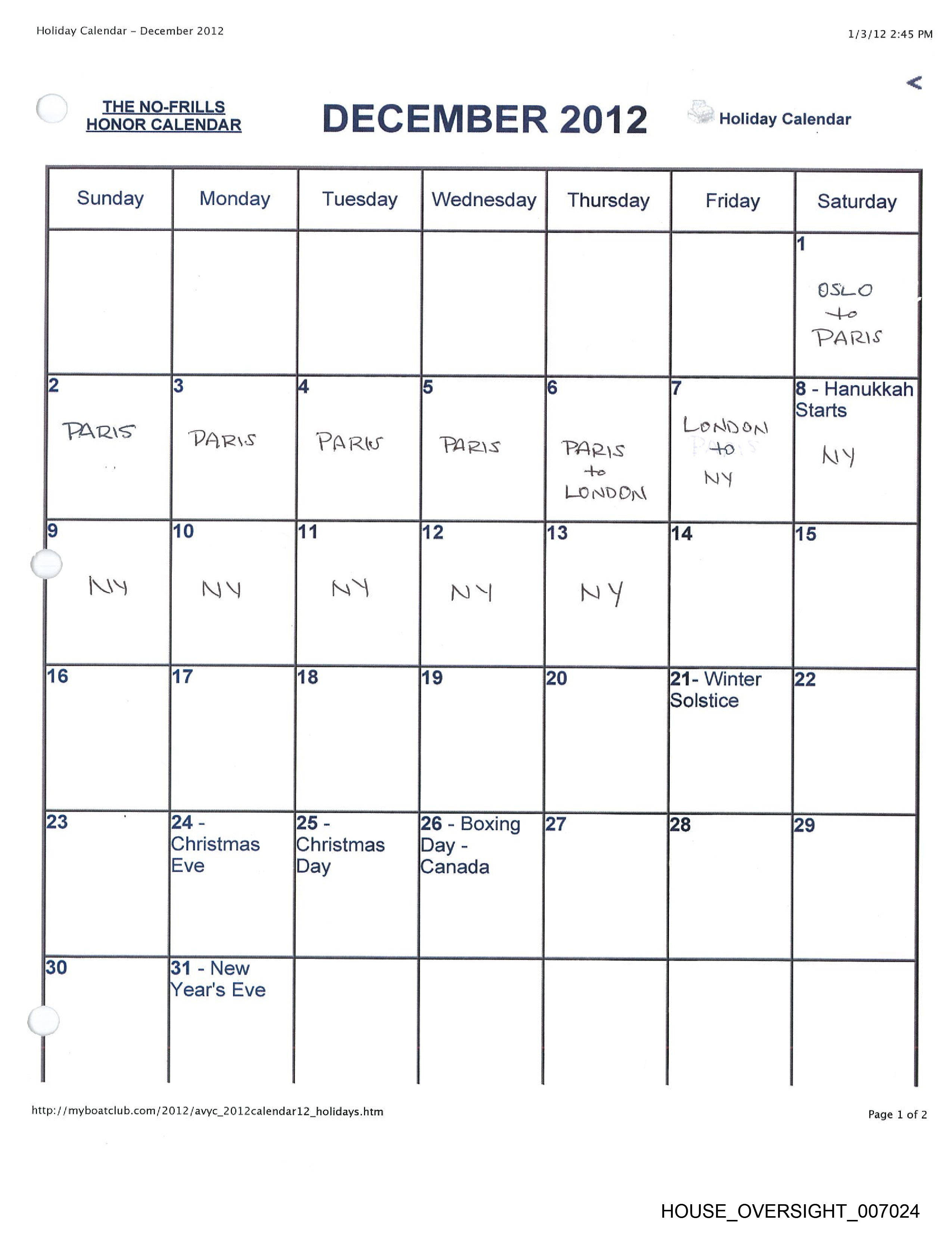 HONOR CALENDAR JULY 2012 Holiday Calendar