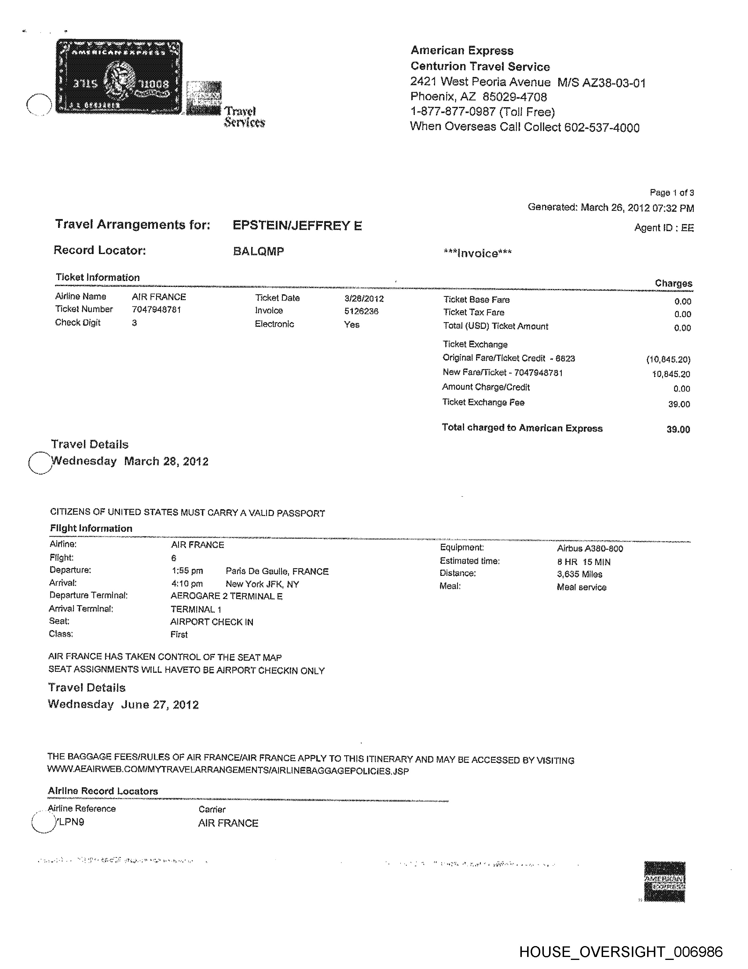 Thank you for choosing American Express Centurion Travel Service and have a pleasant trip.