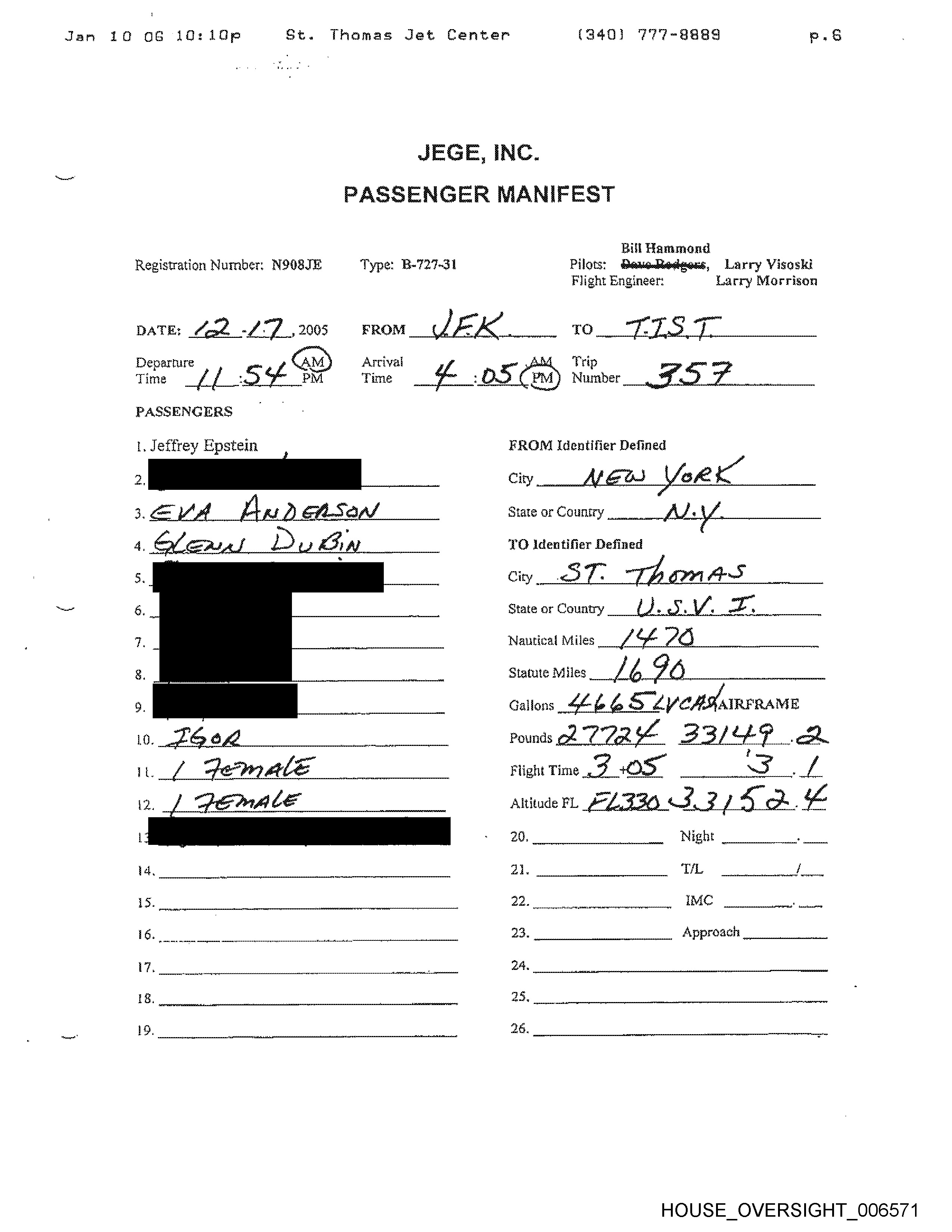 Jam 10 06 10: 10¢ St. Thomas Jet Center (340) 77 -8aas P. So JEGE, INC. Registration Number, NOOQ&TE Type: B-727-31 FROM Arrival Time PASSENGERS |. Jeffrey Epstein ie, is. Pe re ol at _—— IANIFEST Ball Hammond Pilots: Giailae megeenk, Larry Visaski Flight Engineer: Larry Morrison _ Prip ) Number State or Country TO identifier Defined City, State or Country Nautical Miles 7” Statute Miles re IMC ee 23 Approach 24. i HOUSE_OVERSIGHT_0065/7 1