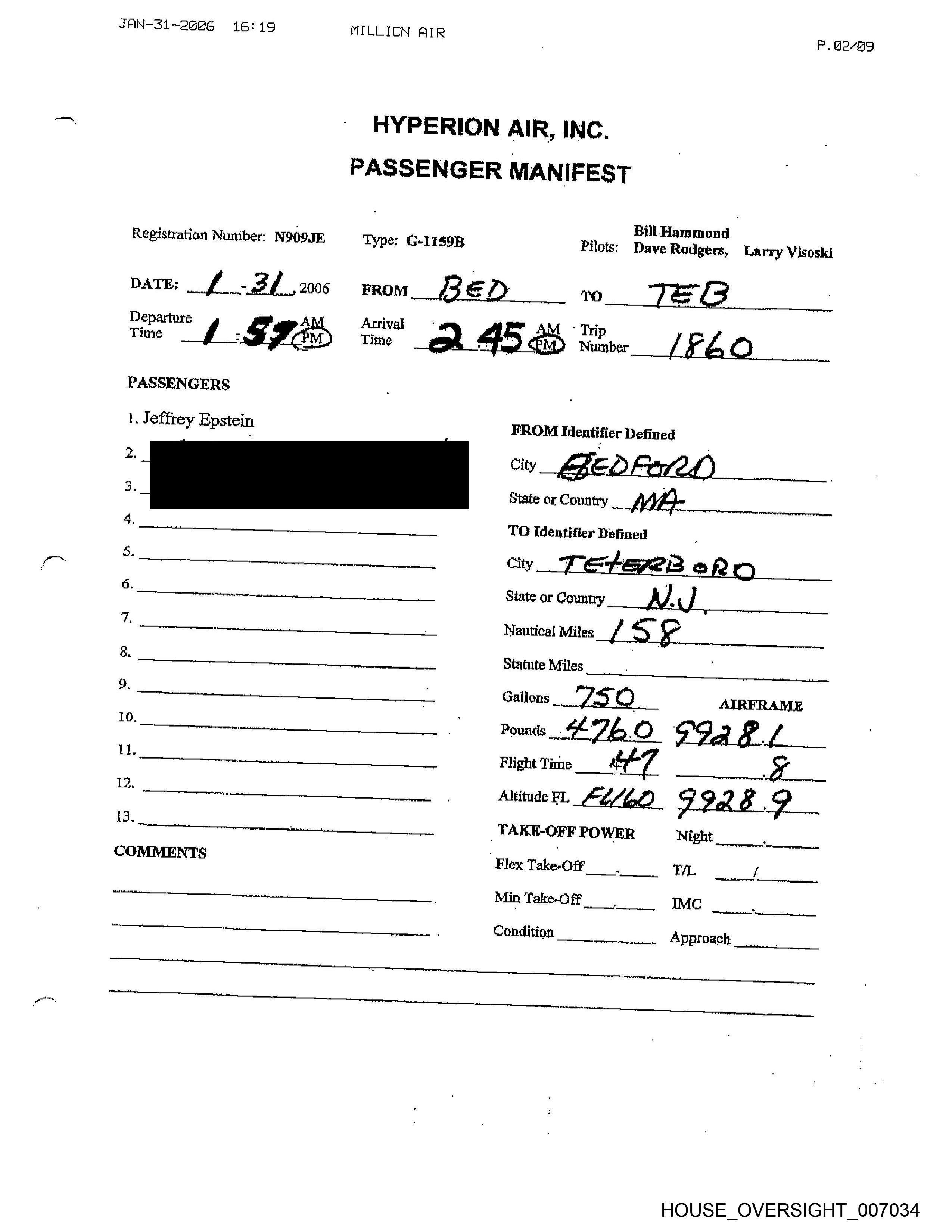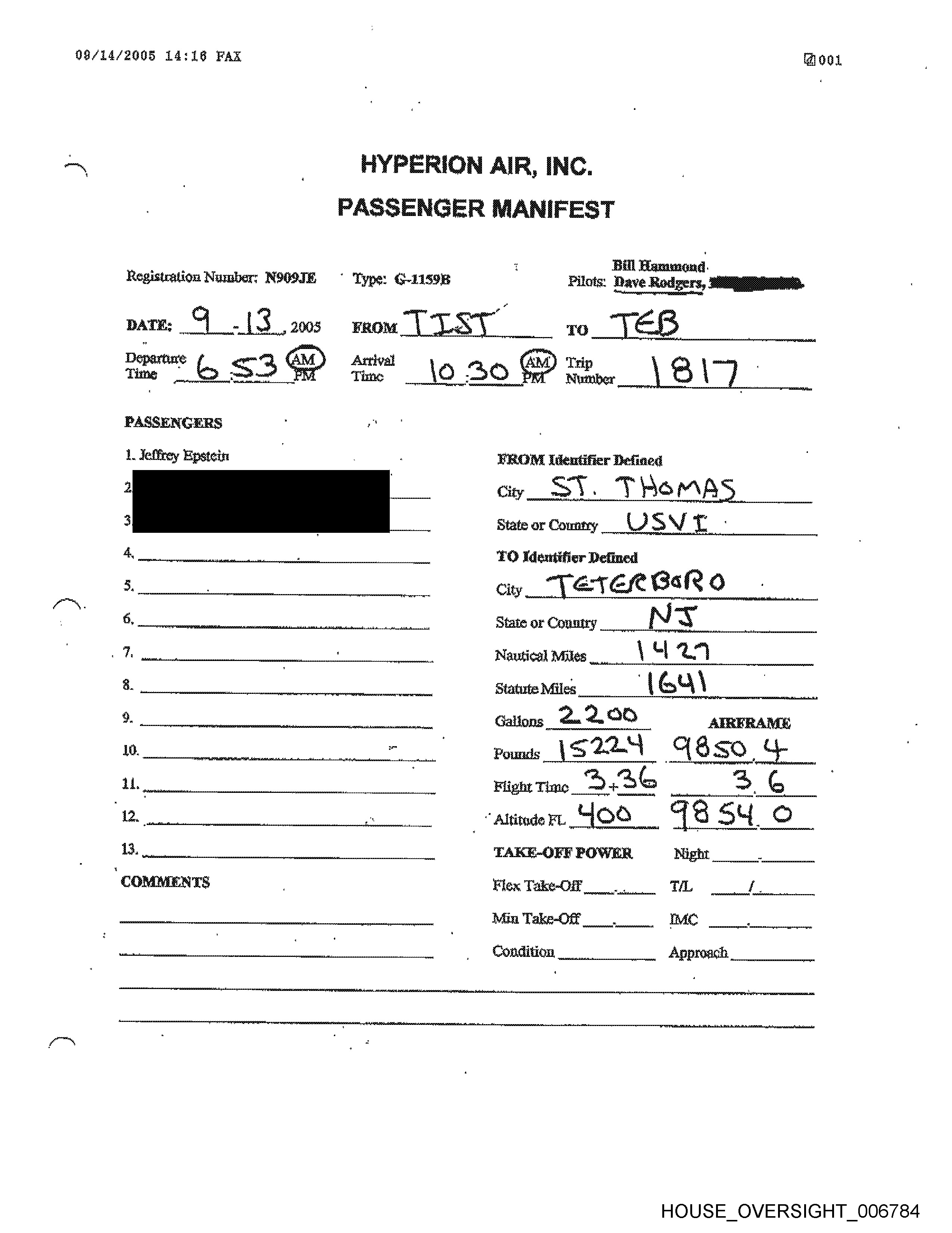 JAN-31-2496 16:19 MILLION AIR P. 43-89 HYPERION AIR, INC. PASSENGER MANIFEST | «Bill Hammond Registration Number: N9O9JE Type: G-tIS9B Pilots: es Rodgers, Larry Visoski pate: / -/ ,2006 FROM TS ‘a BED Departure Qy> _ Arrival Trip PASSENGERS |, Jetfrey Epstein FROM Hentifier Defined , 2 City acy) ay State or Country 4, | YO Identifier — . i. a City BED ECLD , 6. State or Country ppc paps pons opens ep cee * | Nautical Miles EEO 8. _* Statute Miles a, _ | Callonigg? LOC) | AIRFRAME 10. Pounds (Ghee & BS - FILES lt. Flight Time 3 Bh _ 3! & De Altitude FI. LLEED 792.1 13, ee _ TAKE-OFF POWER Night — COMMENTS Flex Take-Off CTL . . Min Take-Off) IMG smitgincnesctscampanamieas aus. | Canditina Arnon HOUSE_OVERSIGHT_007033