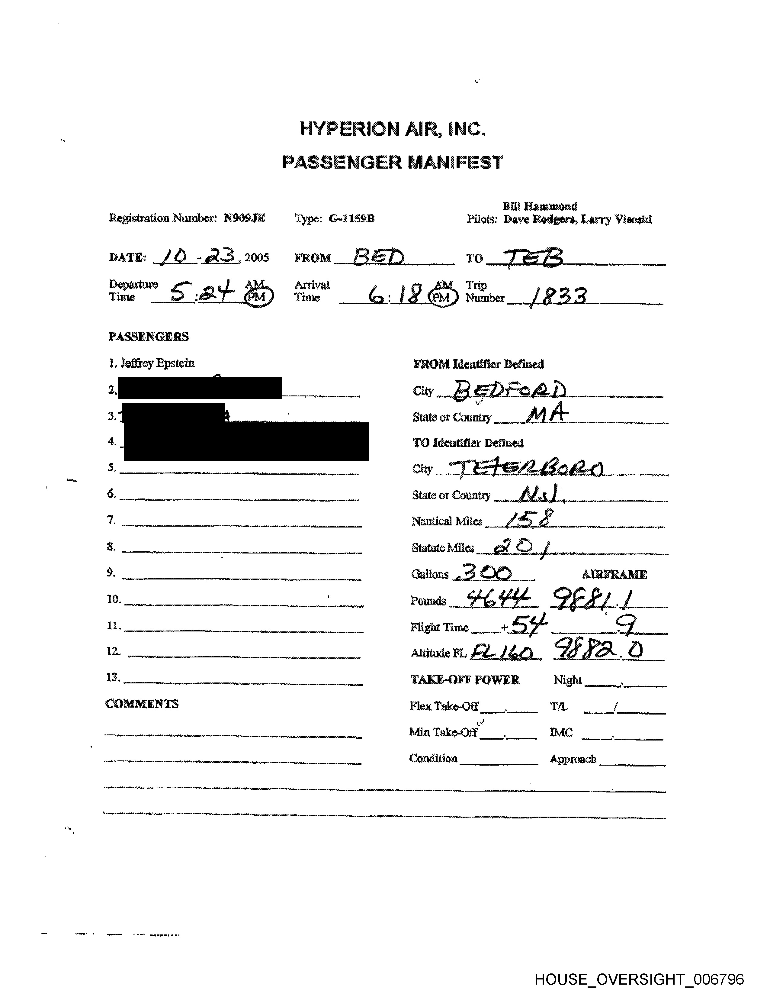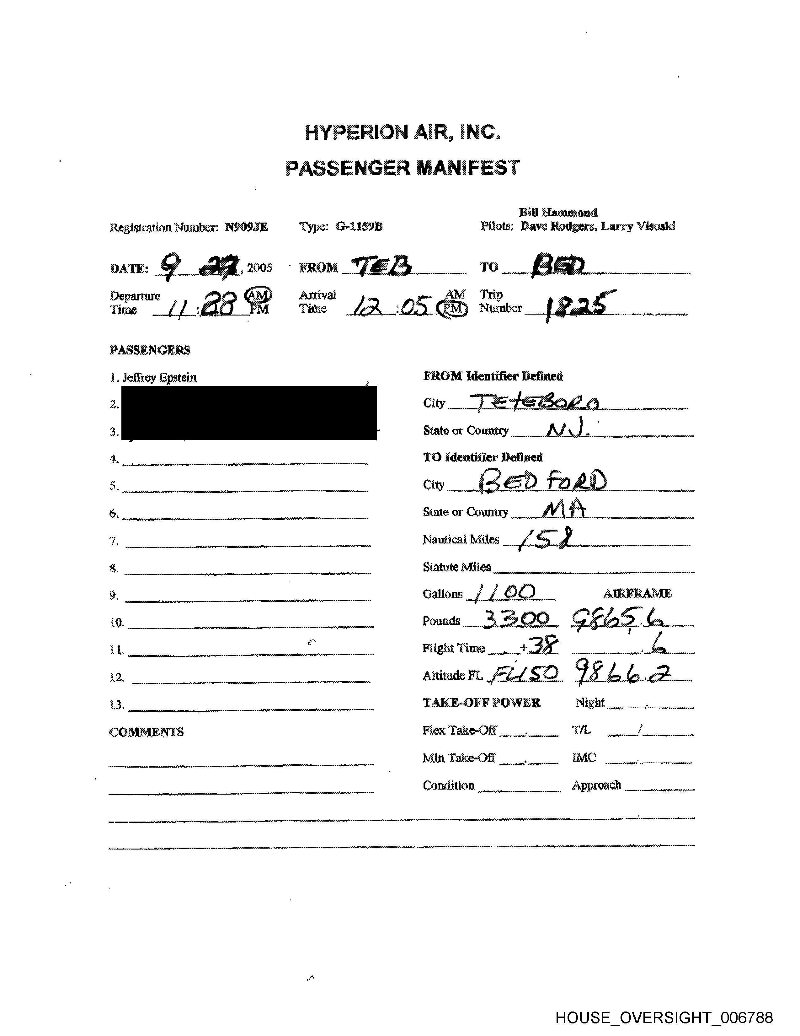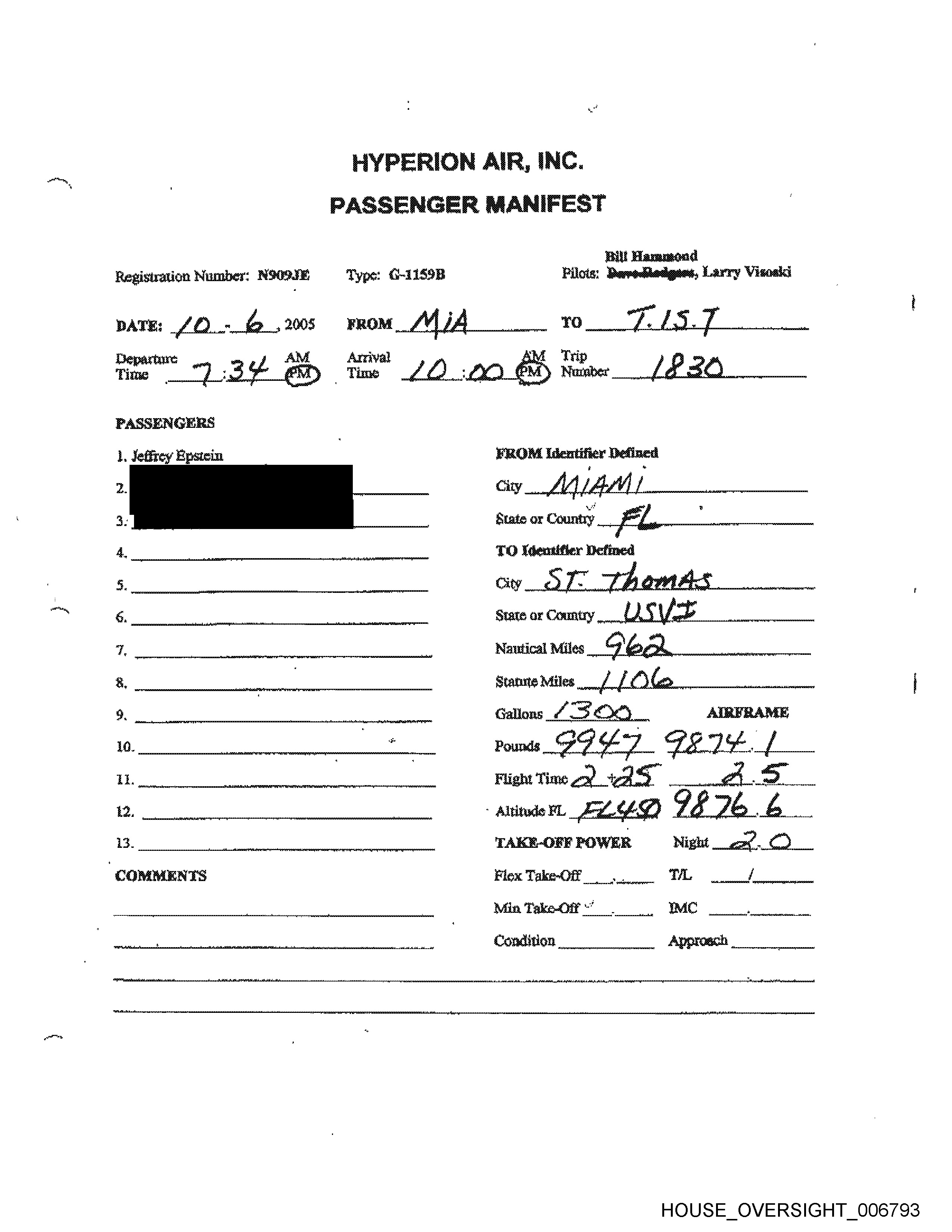 Jan.23. 2006 10:49PM Atlantic Aviation Ho. 5943 =P. 6 HYPERION AIR, INC. PASSENGER MANIFEST | Bil Hammond Registration Number: N9OQ9JE Type: G-1159B Pilots: Dave Rodgers, Larry Visoski DATE: / -Jb, 2006 =FROM BED TO “2 E13 : The ” 1: SGM Tin Tine ae BYdM) ma Number A SS PASSENGERS \. Jeffrey Epstein FROM Identifier Defined City iE ED Foe RD state or Country A lA 4. TO Identifier Defined 5, | City _“F SEL Sole 6. State or Country A/ € ) . 7, Nautical Miles / 5 Ff g, . Statute Miles 9, Galloos GOOD _ AIRFRAME 10. Pounds ". O/ 5S PE LB.O li. , Flight Time at) ae § 12. AlttudeFL F-Z/GOD S 7 43. 3. _ TAKE-OFF FOWER Night — COMMENTS Flex Take-Off , TL / Min Take-Off _ IMC » TO ST Condition Approach HOUSE _OVERSIGHT_007029