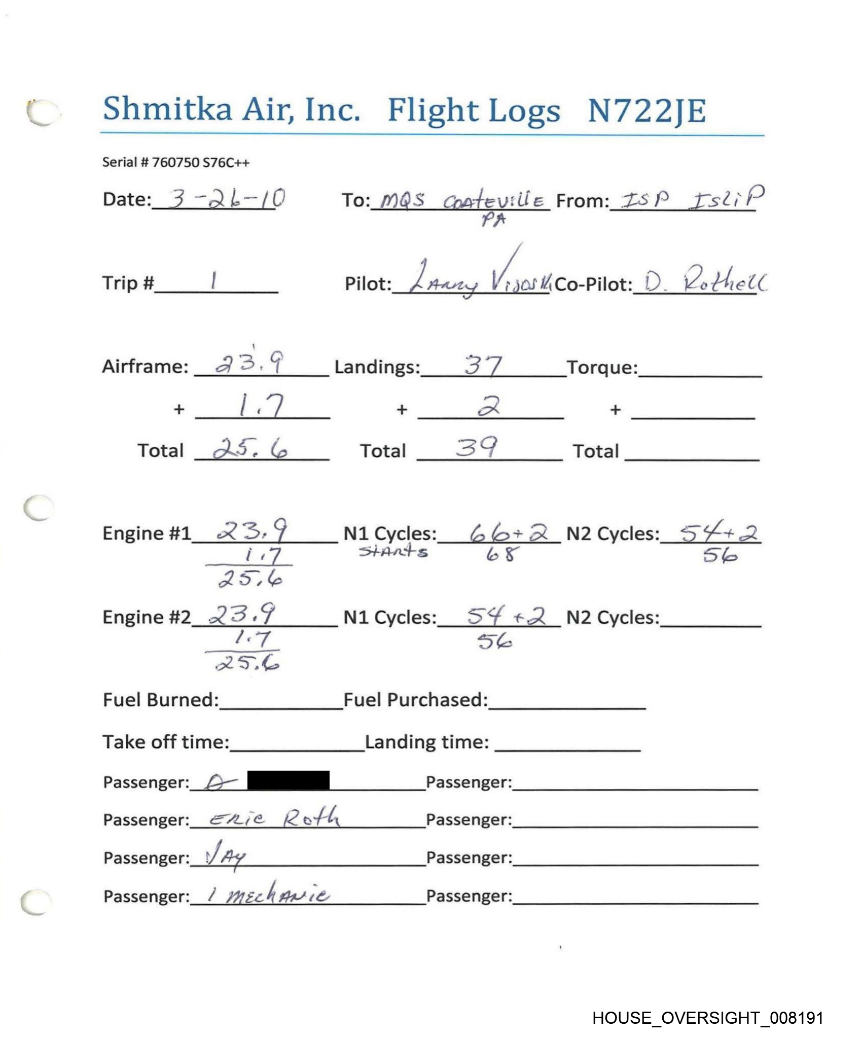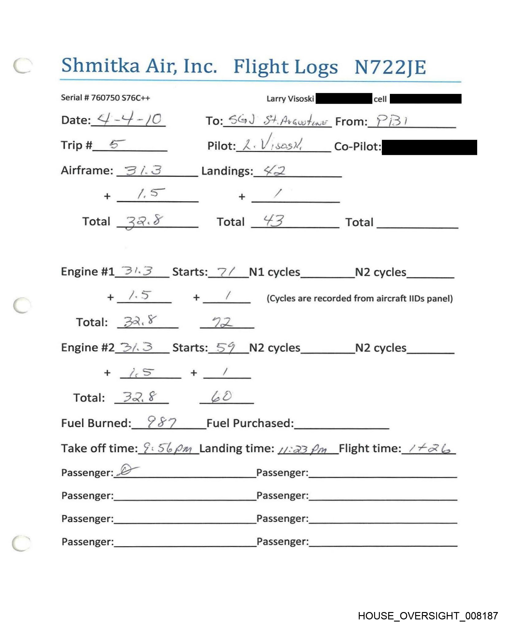 Shmitka Air, Inc. Flight Logs N722JE