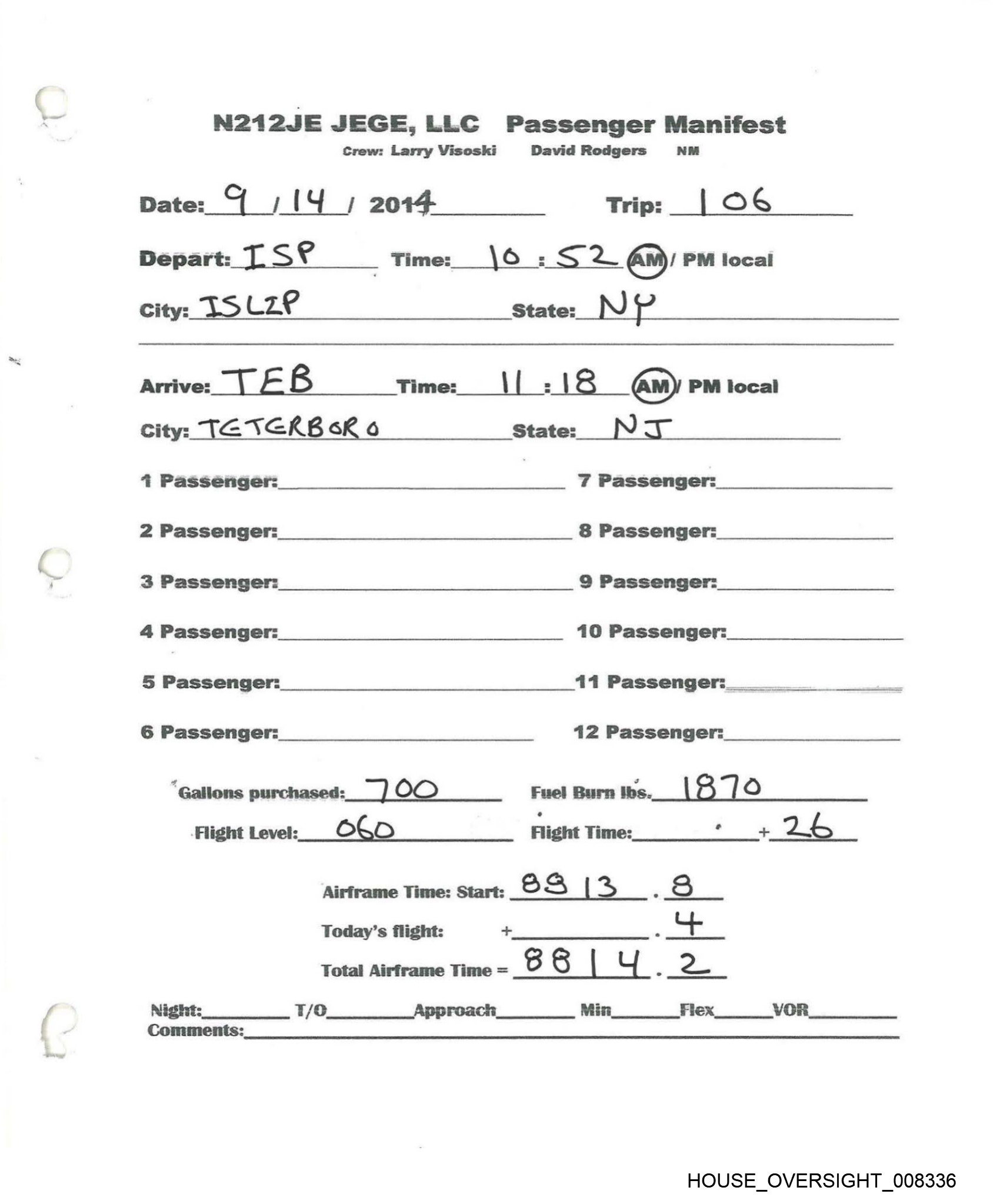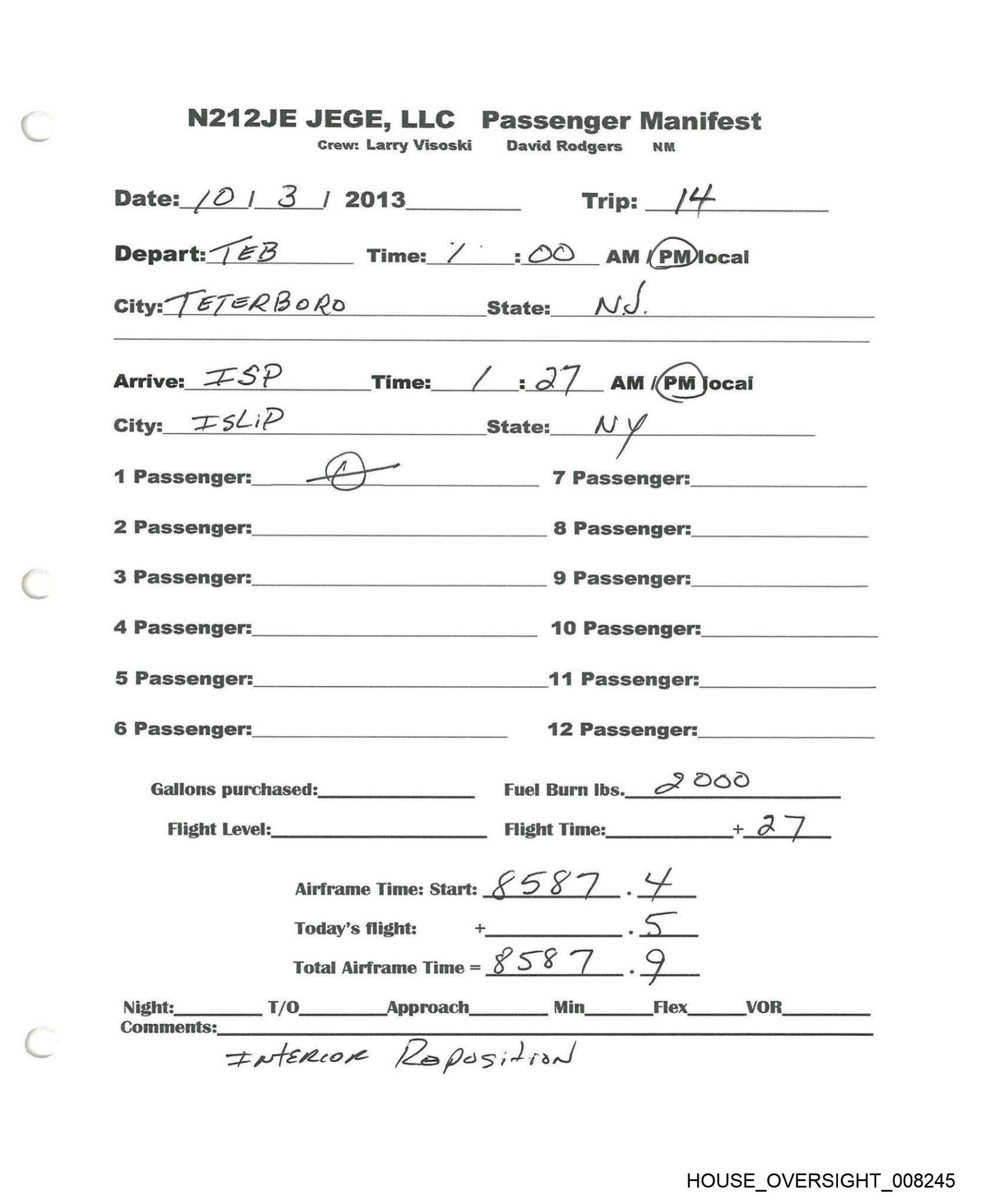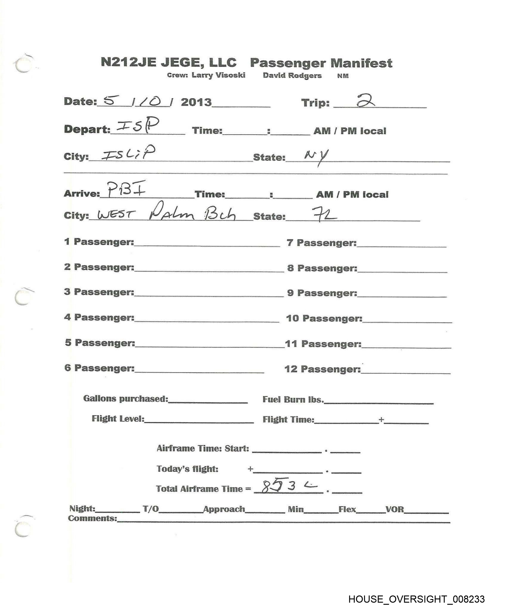 NI20JE JEGE, LLC Passenger Manifest