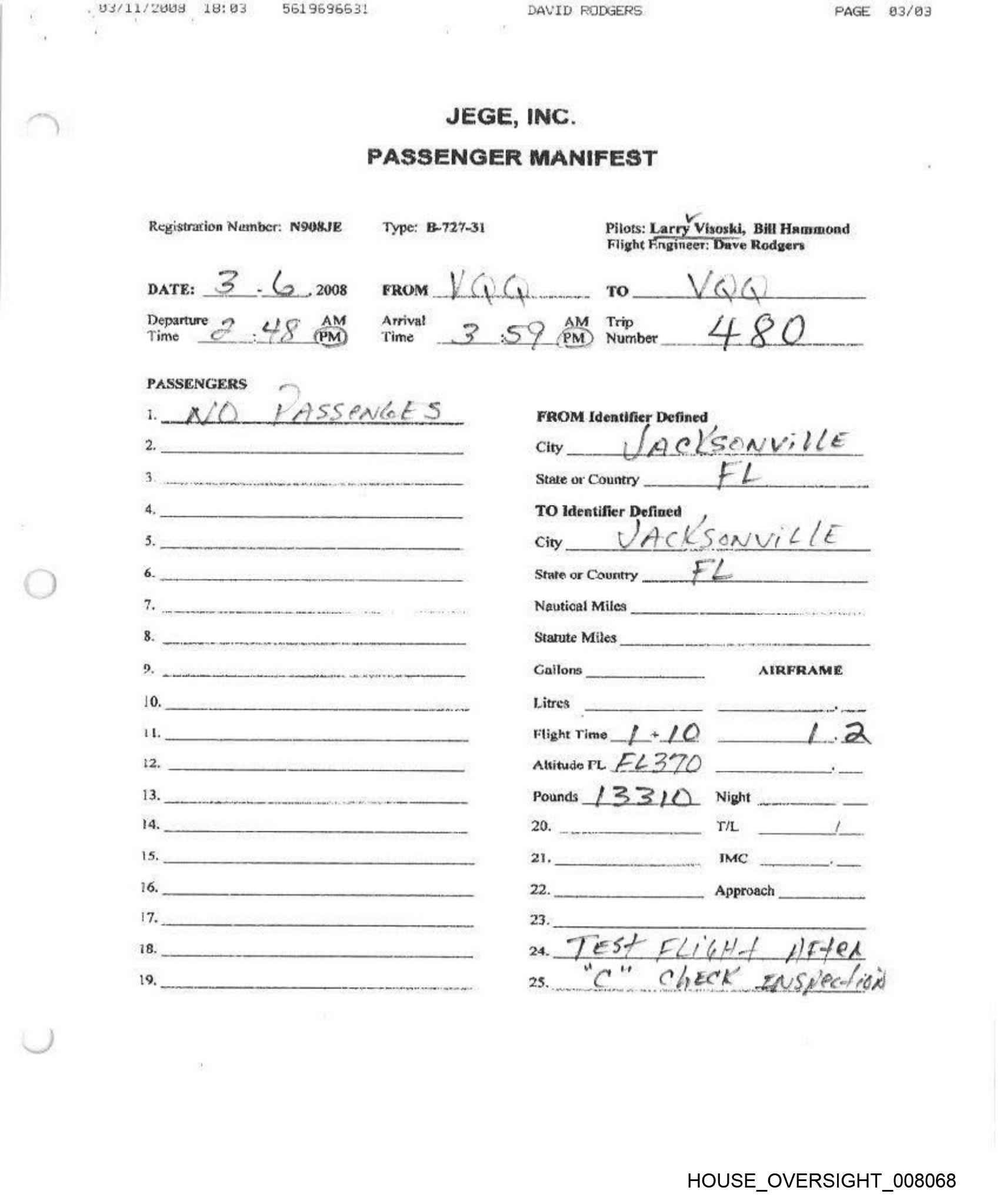 Registration Number: N908JE Type: B-727-31 Pilots: Larry Visoski, Bitt-Hrrmmend