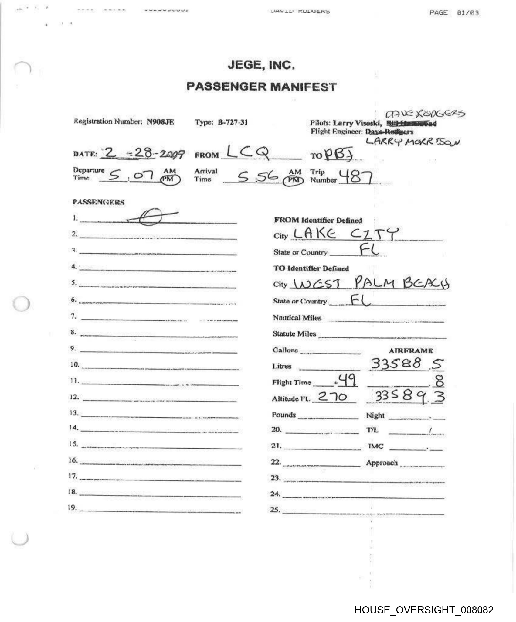 Registration Number: N908JE Type: B-727 Pilots: Larry Visoski,