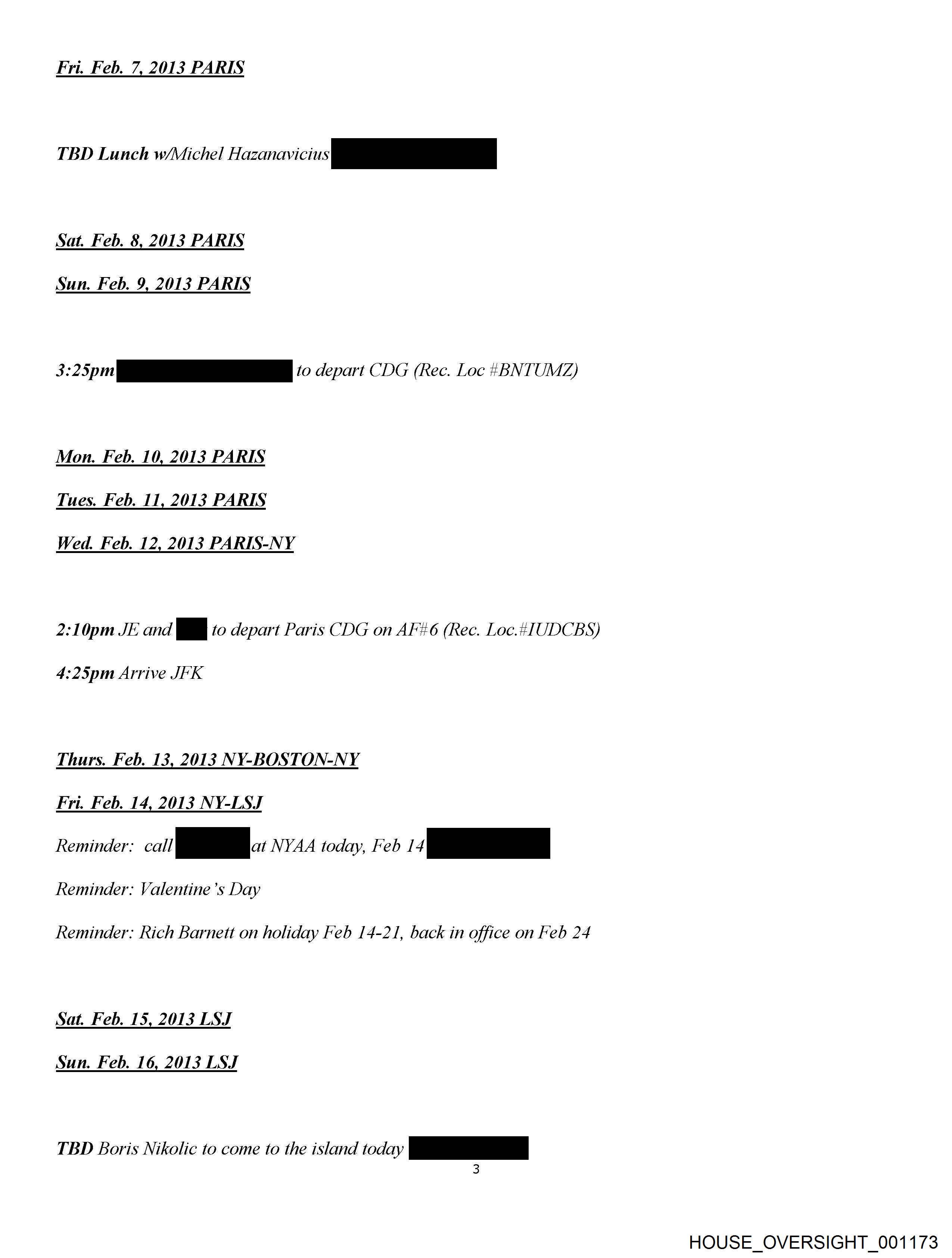 Fri. Feb. 7, 2013 PARIS TBD Lunch w/Michel Hazanavicius|ii——— Sat. Feb. 8, 2013 PARIS Sun. Feb. 9, 2013 PARIS 325 i to depart CDG (Rec. Loc #BNTUMZ) Mon. Feb. 10, 2013 PARIS Tues. Feb. 11, 2013 PARIS Wed. Feb. 12, 2013 PARIS-NY 2:10pm JE and @ to depart Paris CDG on AF #6 (Rec. Loc.AIUDCBS) 4:25pm Arrive JFK Thurs. Feb. 13, 2013 NY-BOSTON-NY Fri. Feb. 14, 2013 NY-LSJ Reminder: call ae. NYAA today, Feb 14 pe Reminder: Valentine’s Day Reminder: Rich Barnett on holiday Feb 14-21, back in office on Feb 24 Sat. Feb. 15, 2013 LSJ Sun. Feb. 16, 2013 LSJ TBD Boris Nikolic to come to the island today B 3 HOUSE_OVERSIGHT_001173