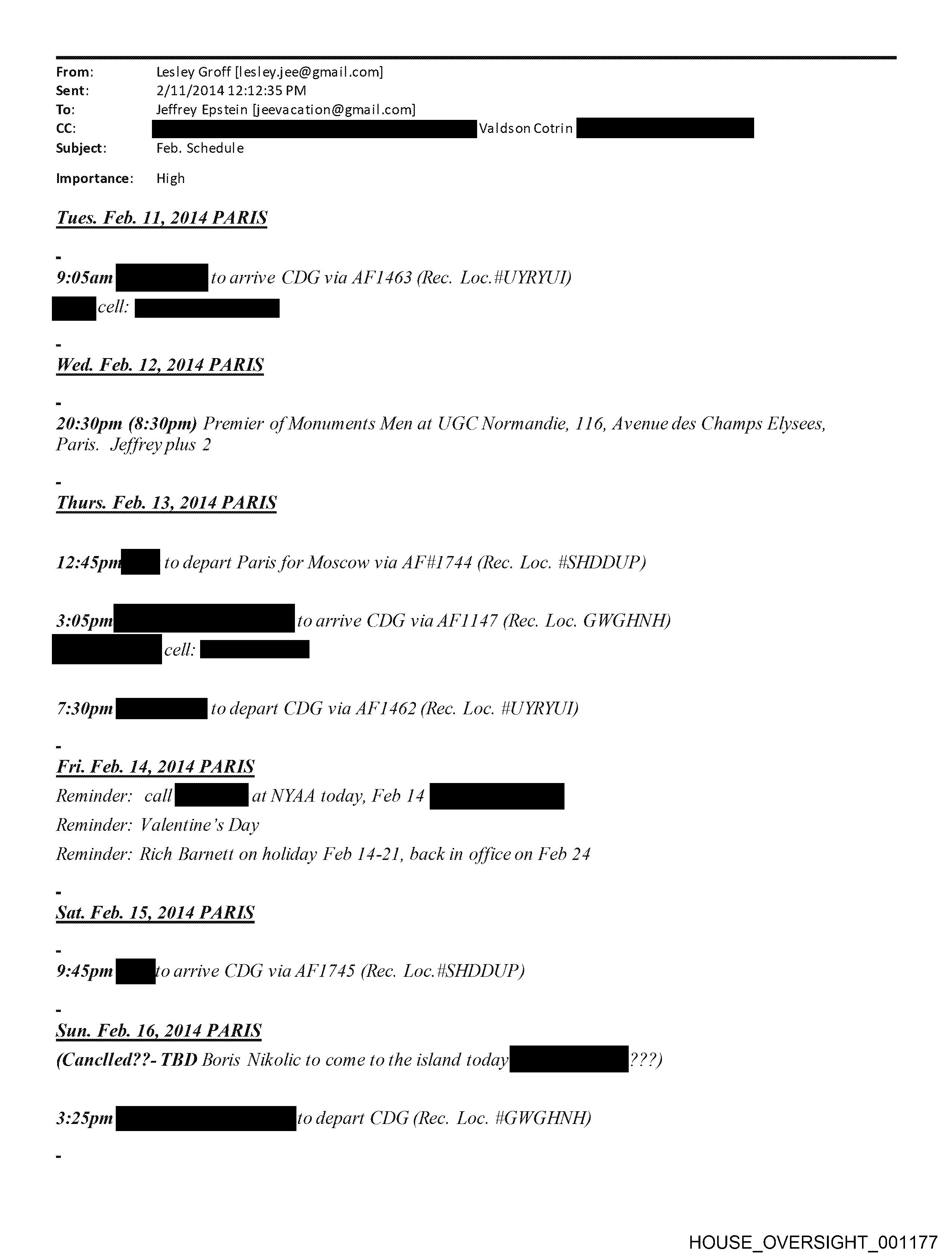 From: Lesley Groff [lesley.jee@ gmail.com] Sent: 2/11/2014 12:12:35 PM To: Jeffrey Epstein [jeevacation@gmail.com] cc. ES V2. ot Subject: Feb. Schedule Importance: High Tues. Feb. 11, 2014 PARIS 9:05am po to arrive CDG via AF 1463 (Rec. Loc. fUYRYUT Wed. Feb. 12, 2014 PARIS 20:30pm (8:30pm) Premier of Monuments Men at UGC Normandie, 116, Avenue des Champs Elysees, Paris. Jeffrey plus 2 Thurs. Feb. 13, 2014 PARIS I 2:45priin to depart Paris for Moscow via AF #1744 (Rec. Loc. #SHDDUP) 3 ni to arrive CDG via AF 1147 (Rec. Loc. GWGHNH) — — 7:30pm (RRR (0. depart CDG via AF 1462 (Rec. Loc. HUYRYUD Fri. Feb. 14, 2014 PARIS Reminder: call Pp at NYAA today, Feb 14 pe Reminder: Valentine’s Day Reminder: Rich Barnett on holiday Feb 14-21, back in office on Feb 24 9:45pm | arrive CDG via AF'1745 (Rec. Loc.4#SHDDUP) Sun. Feb. 16, 2014 PARIS (Canclled??- TBD Boris Nikolic to come to the island ti (<téi‘i‘é‘* ??) 3:25pm ae depart CDG (Rec. Loc. #4WGHNH) HOUSE_OVERSIGHT_001177