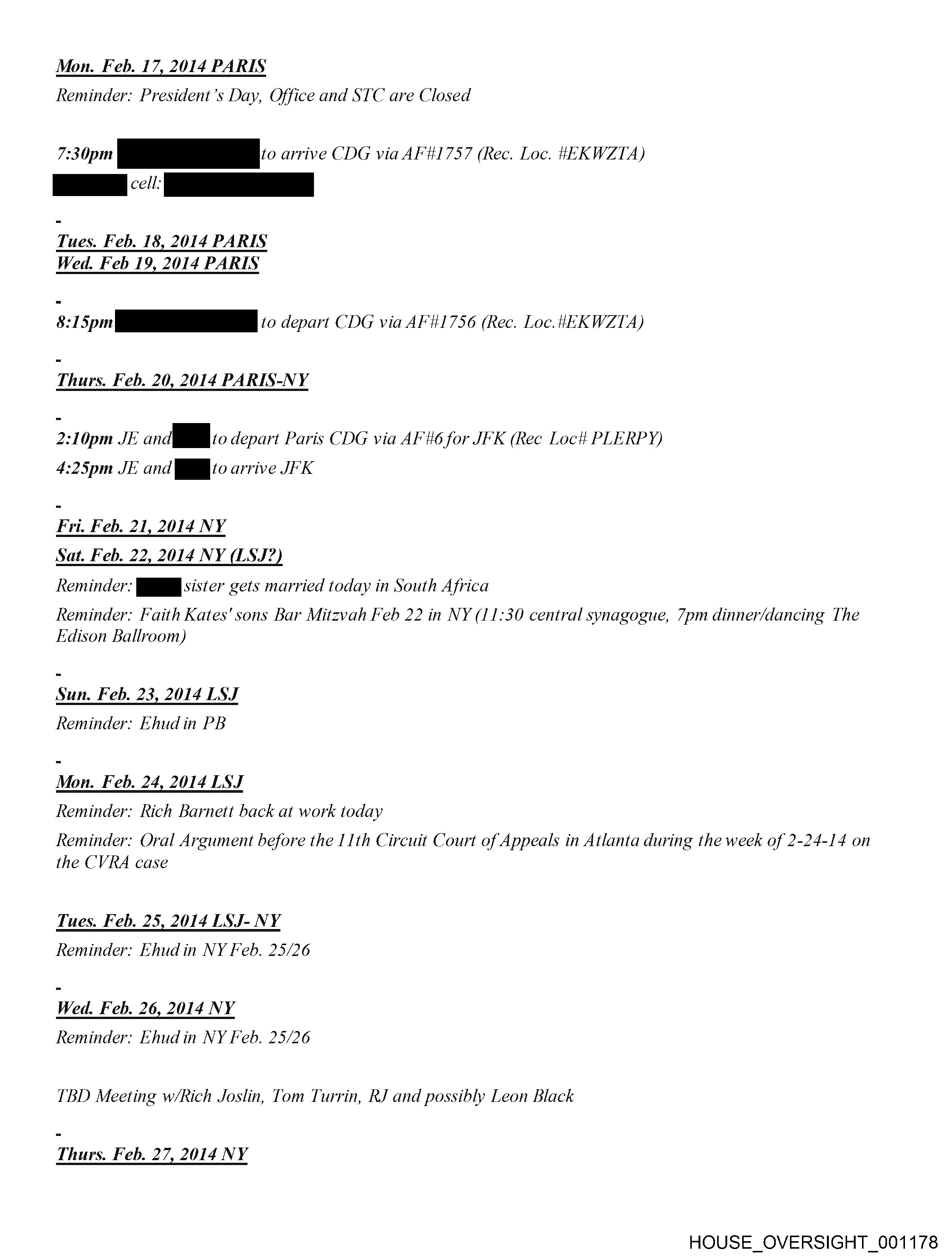 Reminder: President’s Day, Office and STC are Closed 7:30pm ae arrive CDG via AF #1757 (Rec. Loc. #EKWZTA) eS : Tues. Feb. 18, 2014 PARIS 8:1 aw 0Utti(‘OSCSC*™” to depart CDG via AF #1756 (Rec. Loc. 4EKWZTA) Thurs. Feb. 20, 2014 PARIS-NY 2:10pm JE and to depart Paris CDG via AF’ #6 for JFK (Rec Loc# PLERPY) 4:25pm JE and to arrive JFK Fri. Feb. 21, 2014 NY Sat. Feb. 22, 2014 NY (LSJ?) Reminder: 9 sister gets married today in South Africa Reminder: Faith Kates’ sons Bar Mitzvah Feb 22 in NY (11:30 central synagogue, 7pm dinner/dancing The Edison Ballroom) Sun. Feb. 23, 2014 LSJ Reminder: Ehudin PB Reminder: Rich Barnett back at work today Reminder: Oral Argument before the 11th Circuit Court of Appeals in Atlanta during the week of 2-24-14 on the CVRA case Tues. Feb. 25, 2014 LSJ- NY Reminder: Ehudin NY Feb. 25/26 Wed. Feb. 26, 2014 NY Reminder: Ehudin NY Feb. 25/26 TBD Meeting w/Kich Joslin, Tom Turrin, RJ and possibly Leon Black Thurs. Feb. 27, 2014 NY HOUSE_OVERSIGHT_001178