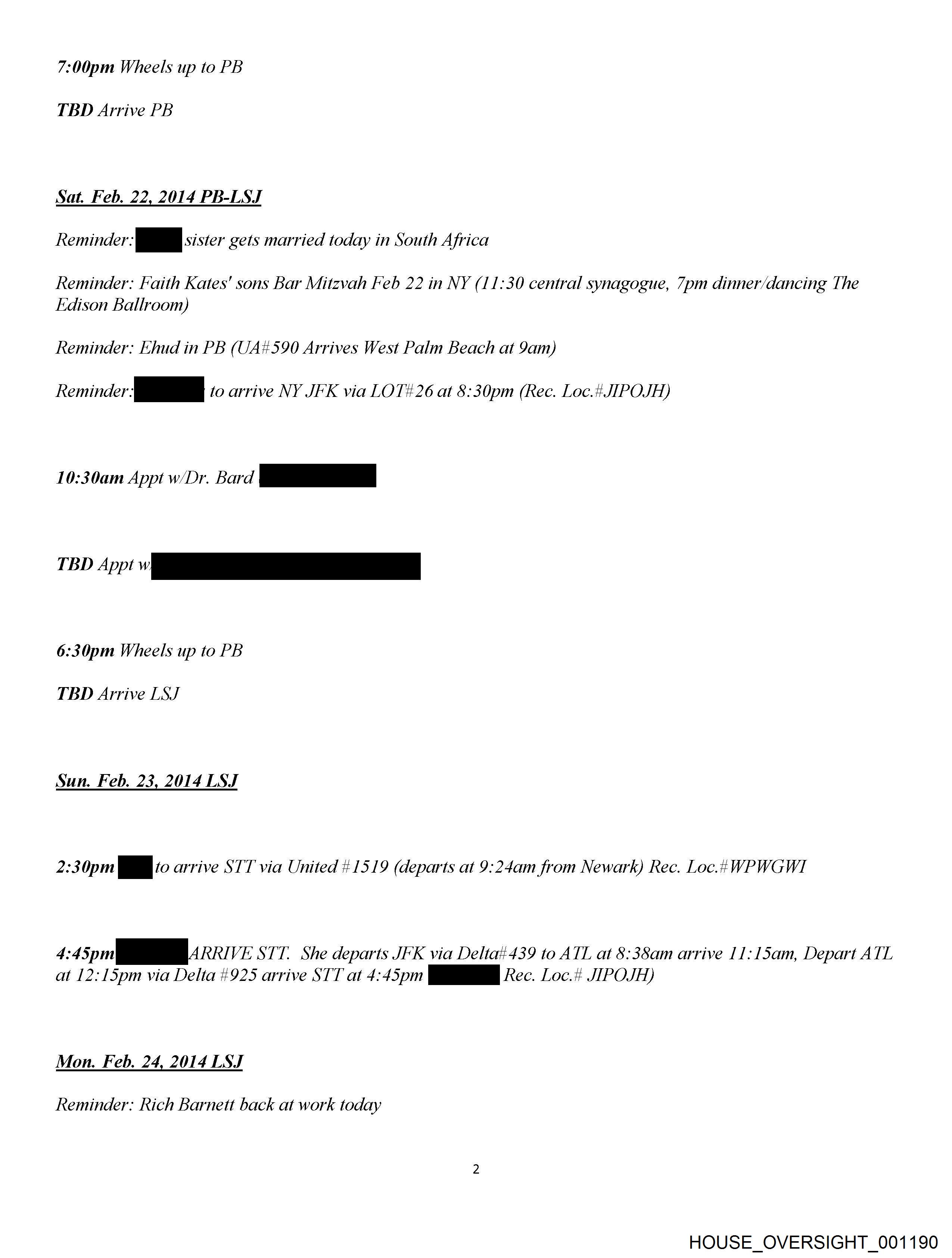 7:00pm Wheels up to PB TBD Arrive PB Sat. Feb. 22, 2014 PB-LSJ Reminder sister gets married today in South Africa Reminder: Faith Kates’ sons Bar Mitzvah Feb 22 in NY (11:30 central synagogue, 7pm dinner/dancing The Edison Ballroom) Reminder: Ehud in PB (UA#590 Arrives West Palm Beach at Yam) Reninde to arrive NY JFK via LOT#26 at 8:30pm (Rec. Loc.¢JIPOJH) 10:30am Appt w/Dr. Bard po 6:30pm Wheels up to PB TBD Arrive LSJ Sun. Feb. 23, 2014 LSJ 2:30pm | arrive STT via United #1519 (departs at 9:24am from Newark) Rec. Loc.# WPWGWI 4:45pm ARRI VE STT. She departs JFK via Delta#439 to ATL at 8:38am arrive 11:15am, Depart ATL at 12:15pm via Delta #925 arrive STT at 4:45pm (MBB Rec. Loc.# JIPOJH) Mon. Feb. 24, 2014 LSJ Reminder: Rich Barnett back at work today HOUSE_OVERSIGHT_001190