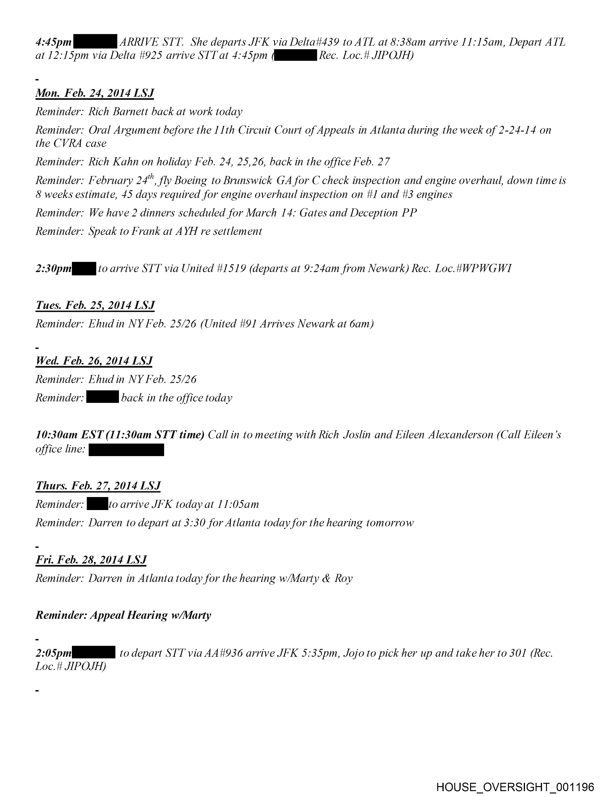 4:45pm RRR 2 rei VE STT. She departs JFK via Delta#439 to ATL at 8:38am arrive 11:l5am, Depart ATL at 12:15pm via Delta #925 arrive STT at 4:45pm (HB Rec. Loc.it JIPOJH) Reminder: Rich Barnett back at work today Reminder: Oral Argument before the 11th Circuit Court of Appeals in Atlanta during the week of 2-24-14 on the CVRA case Reminder: Rich Kahn on holiday Feb. 24, 25,26, back in the office Feb. 27 Reminder: February 24", fly Boeing to Brunswick GA for C check inspection and engine overhaul, down time is 8 weeks estimate, 45 days required for engine overhaul inspection on #1 and #3 engines Reminder: We have 2 dinners scheduled for March 14: Gates and Deception PP Reminder: Speak to Frank at AYH re settlement 2:30pm to arrive STT via United #1519 (departs at 9:24am from Newark) Rec. Loc.t4WPWGWI Reminder: Ehudin NY Feb. 25/26 (United #91 Arrives Newark at 6am) Wed. Feb. 26, 2014 LSJ Reminder: Ehudin NY Feb. 25/26 Reminder: P| back in the office today 10:30am EST (11:30am STT time) Call in to meeting with Rich Joslin and kileen Alexanderson (Call Kileen’s fice in: Thurs. Feb. 27, 2014 LSJ Reminder: to arrive JFK today at 11:05am Reminder: Darren to depart at 3:30 for Atlanta today for the hearing tomorrow Fri. Feb. 28, 2014 ES J Reminder: Darren in Atlanta today for the hearing w/Marty & Roy Reminder: Appeal Hearing w/Marty 2:05pm sto depart STT via AA#936 arrive JFK 5:35pm, Jojo to pick her up and take her to 301 (Rec. Loc.#t JIPOJH) HOUSE_OVERSIGHT_001196