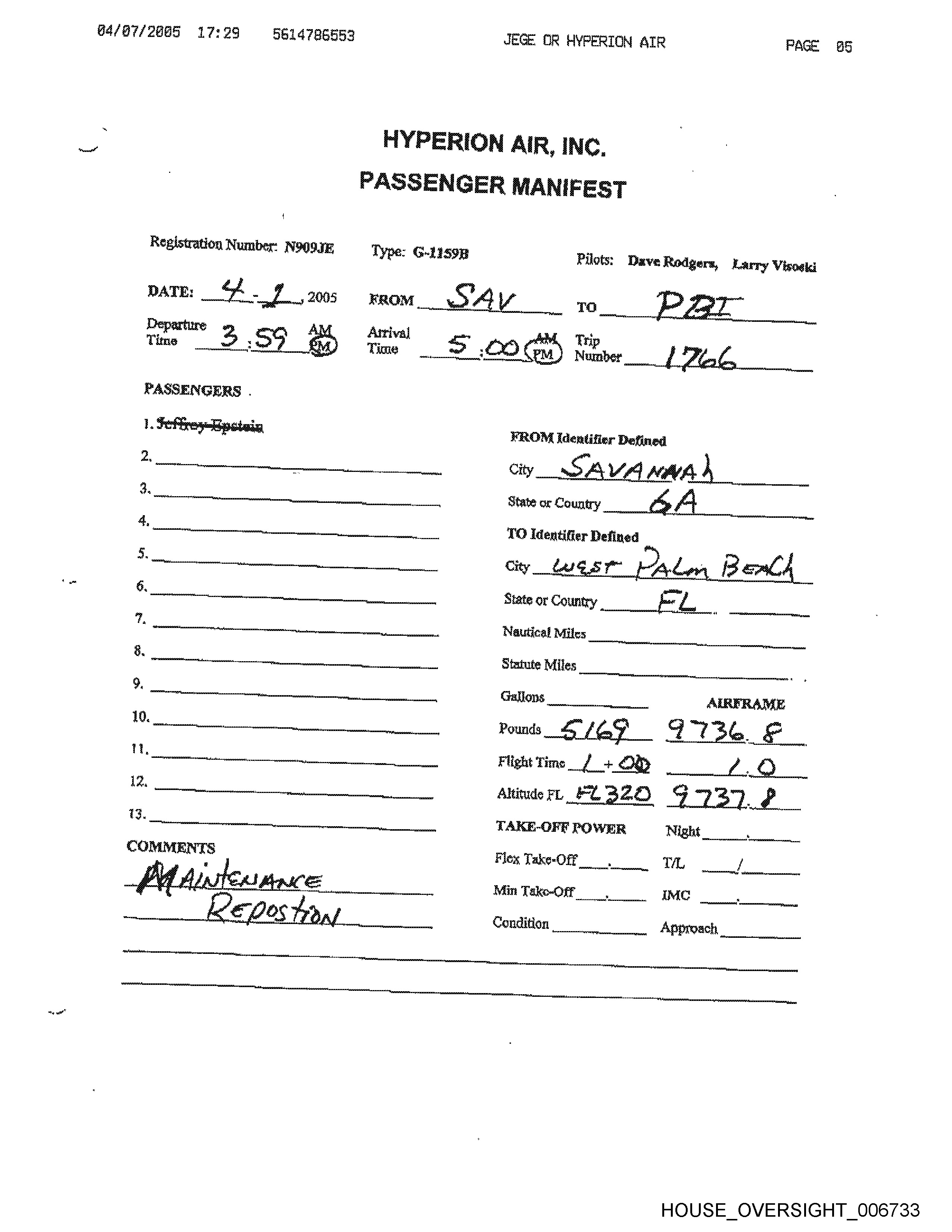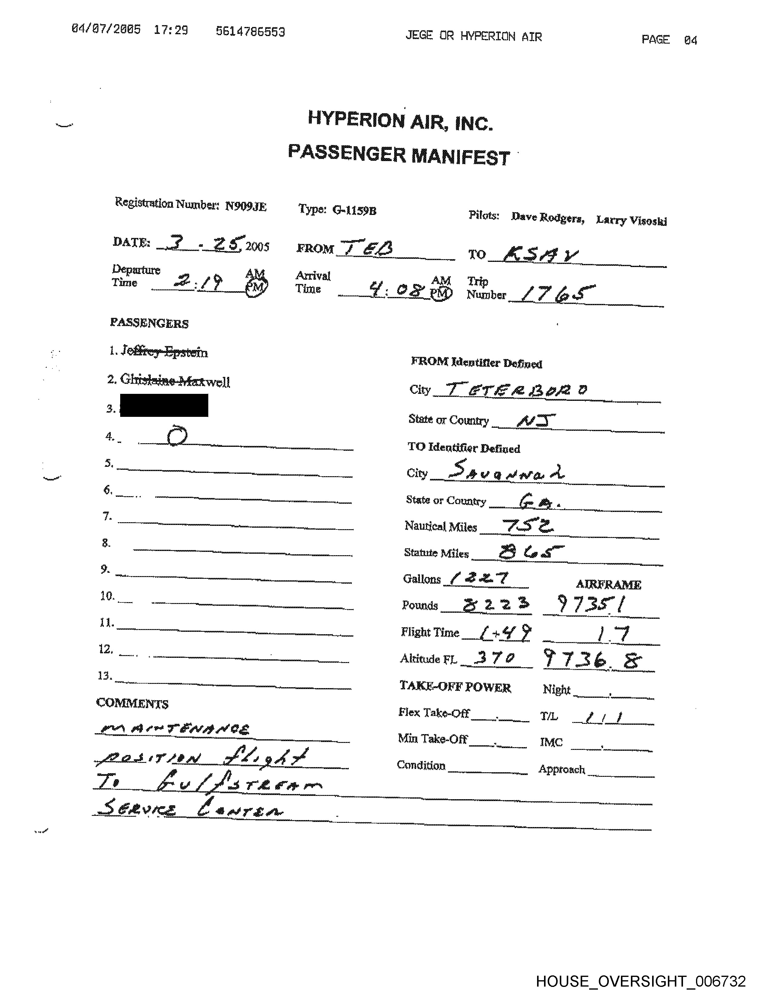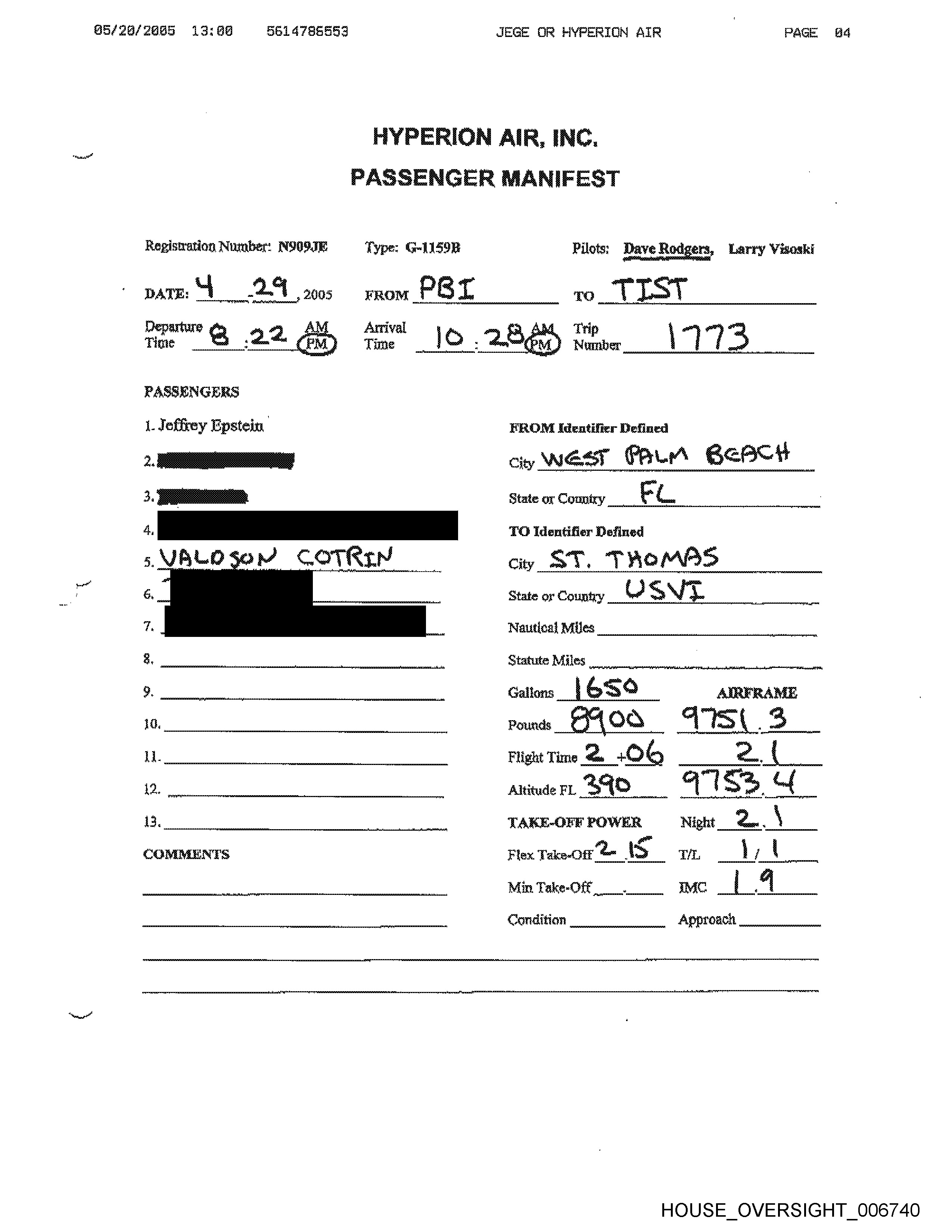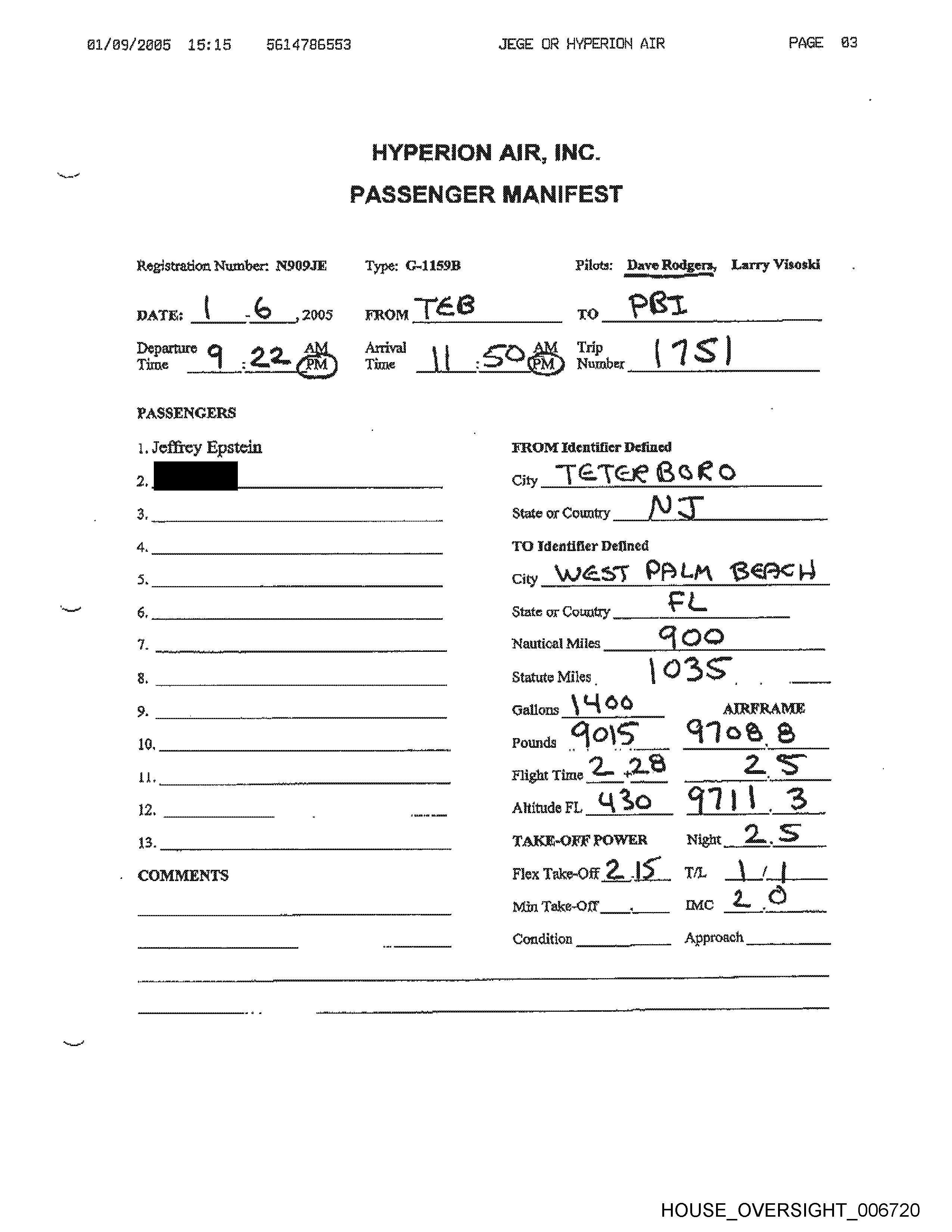 Registration Number: N909JE Type: G-1159B8 Pilots: Dave Rodgers,