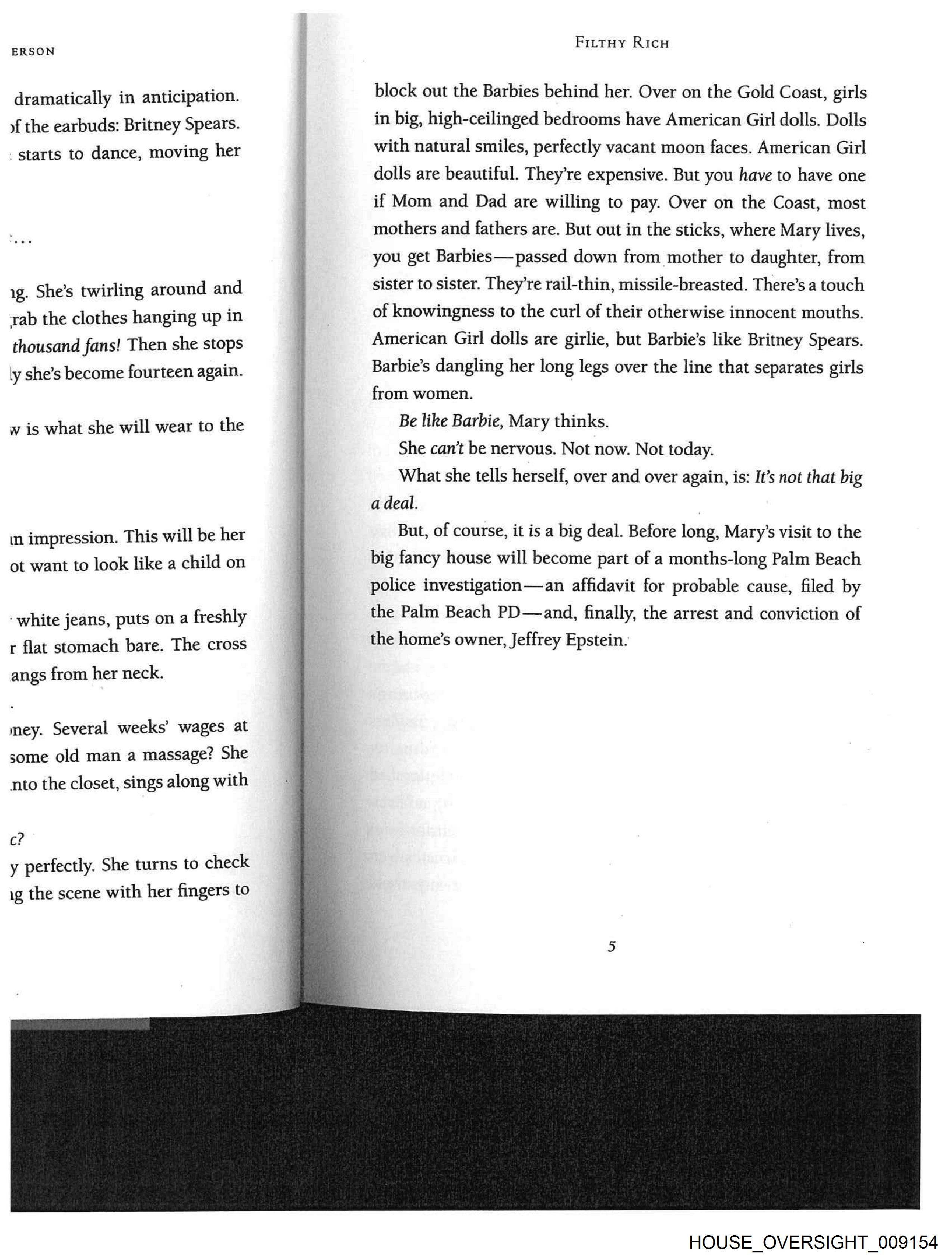Note posing residence had a stone mt door that wouldn't have istle. And, like our neighbor's ram: raised brass letters that _the two women belonged to ul man who was also a regis- ste for underage women. n-year-olds. But younger girls ised dozens of young women, ttled potential lawsuits with ‘ison time for his crimes. A bit in the world again. ing women. ries about Jeffrey Epstein for a Id not have been more differ- oth live, is small and tightly 1e people. idlines in papers all over the -d a scandal that continues to smell. ase in the media and talked I wondered why it had taken o catch up with Epstein. And, 0 little jail time. tions, but there were others: ey, possibly billions? No one AE OO TAG ee Ng I Eate® jock Pee Pee 3 te eT et oo AuTHOR’s Note seemed to know. And while the news media had some details about the underage girls, reporters seemed only to know what had happened at the moment of his arrest. Epstein definitely liked his massages. He got them from two, even three, young women a day, right in his mansion on the island. He’d been operating on an almost industrial scale. But who were these girls? Where had they come from? How did they find their way to his home on a secluded street in Palm Beach? Epstein had powerful friends. He'd flown Bill Clinton around in his private jet and rubbed shoulders with heads of state, Nobel Prize winners, any number of billionaires. Prince Andrew, the man sixth in line to the British throne, had been a cl