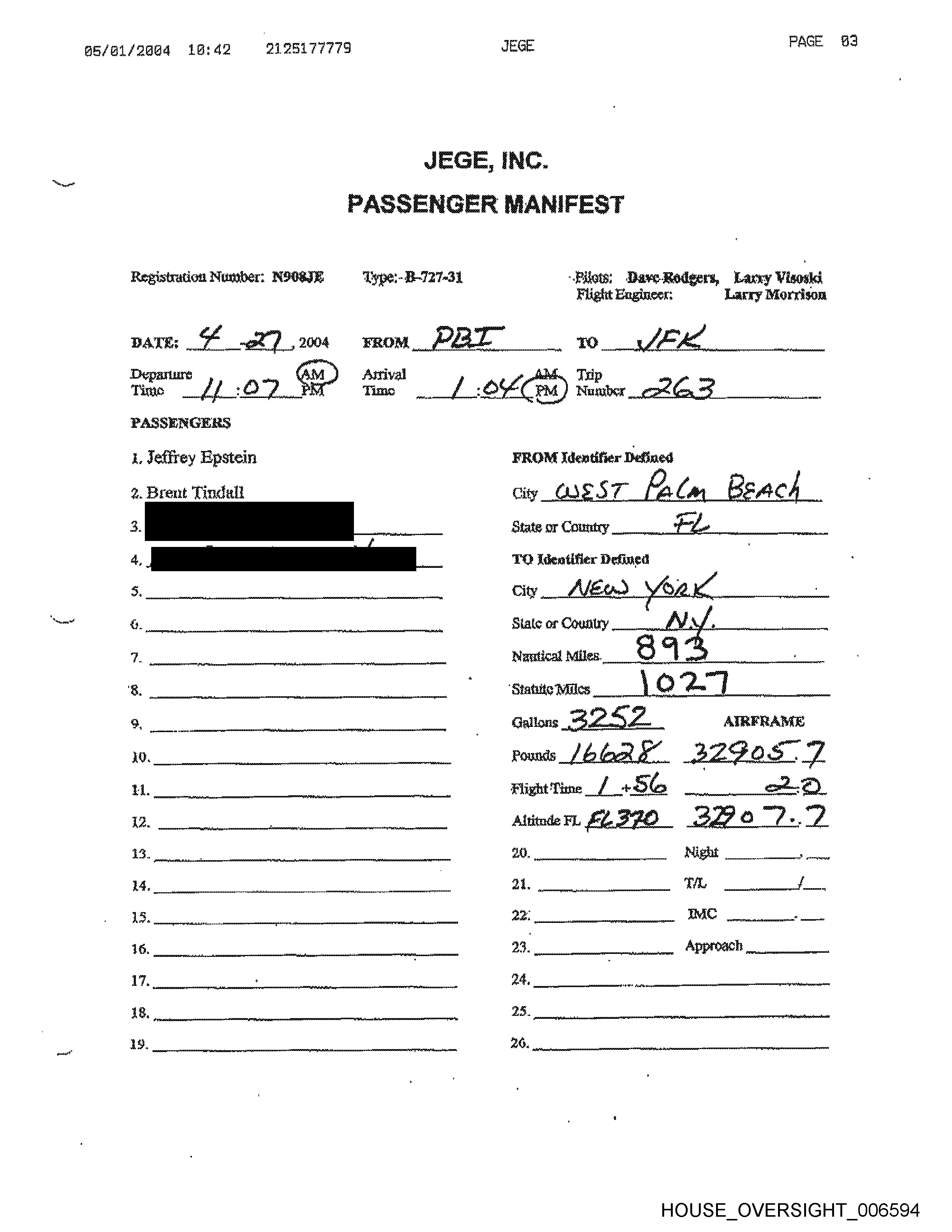 "West + Neeinnset B6/a1/20G4 1ai42 2125177779 JEGE PAGE 3 Laney Morclon PASSENGERS 1, Jedirey Epstein 2. Brent Tindall HOUSE OVERSIGHT _006594