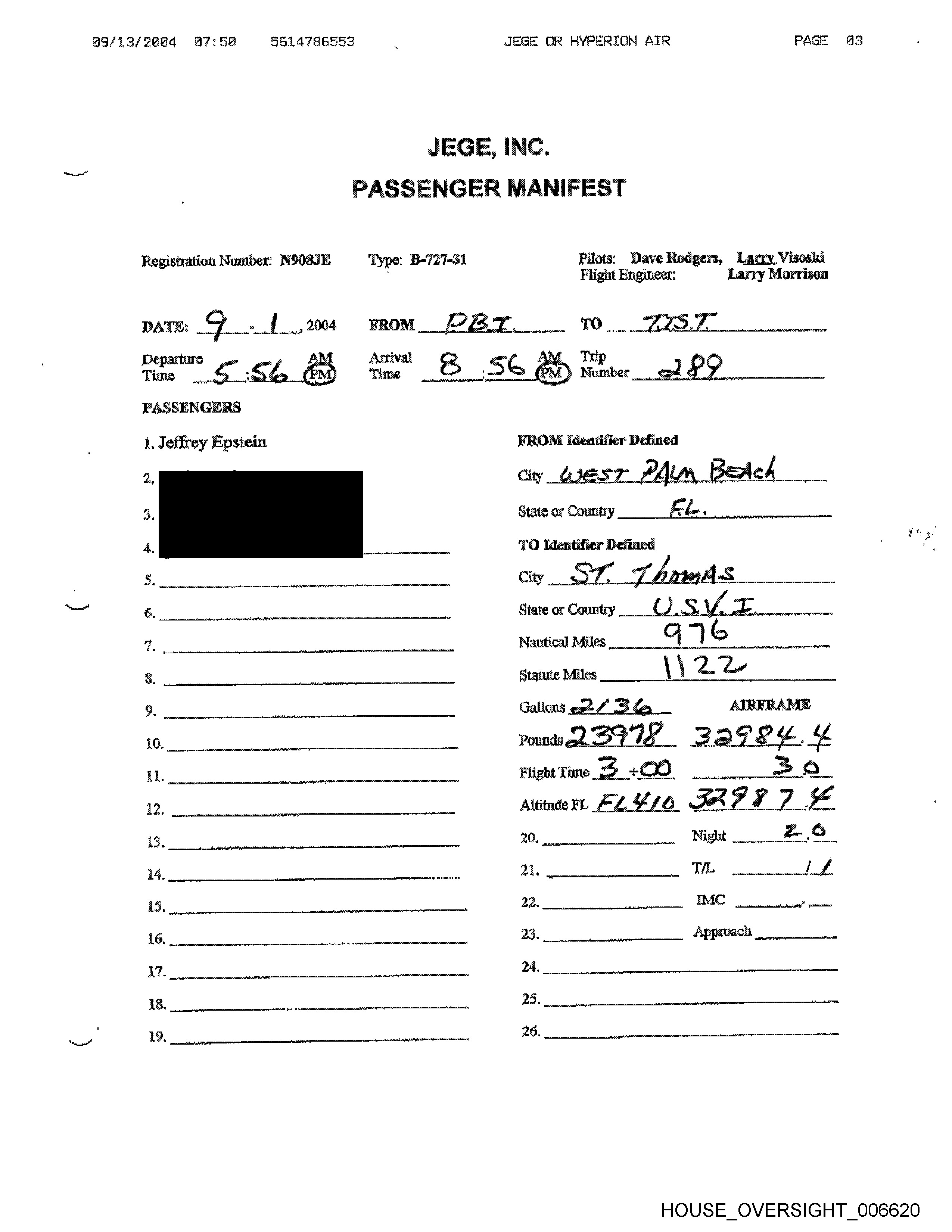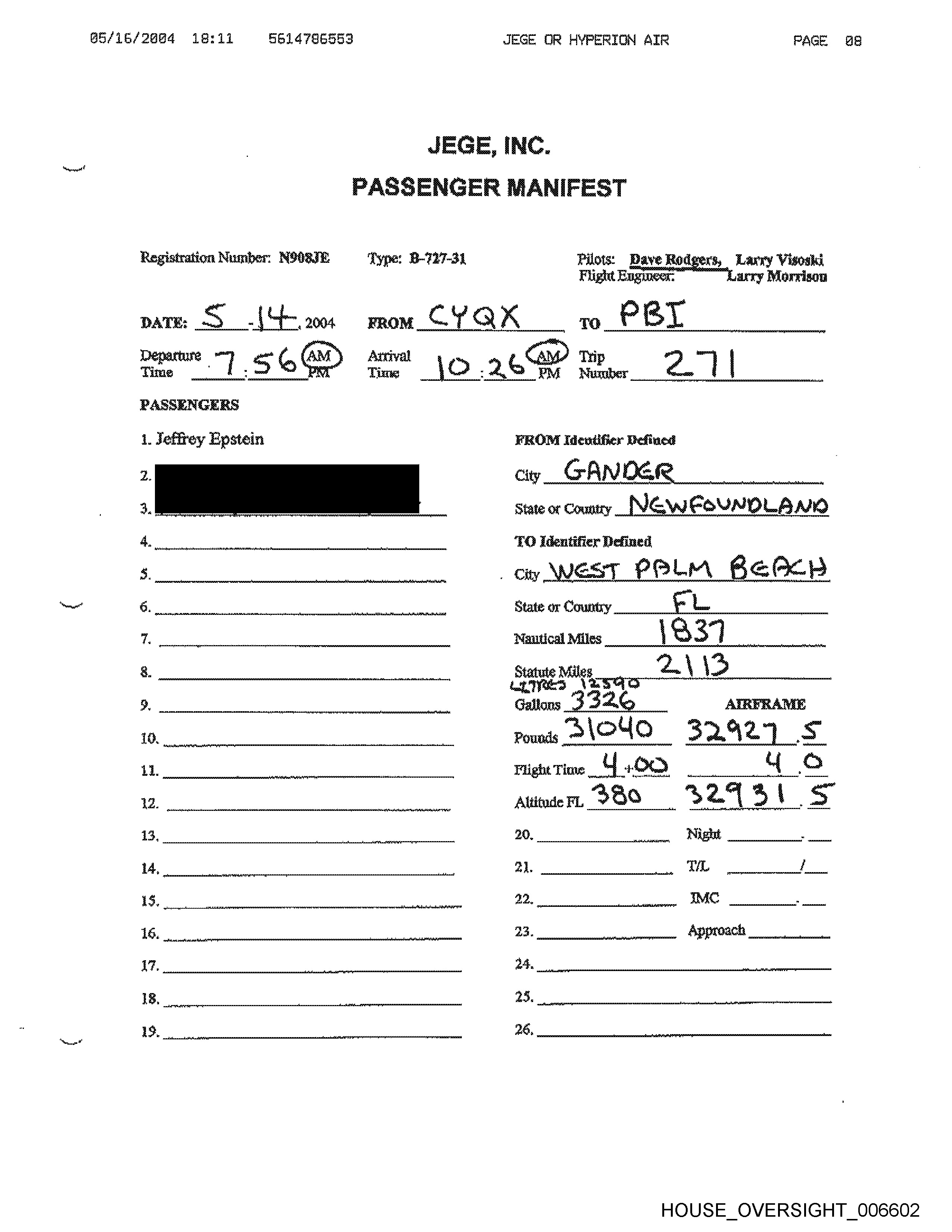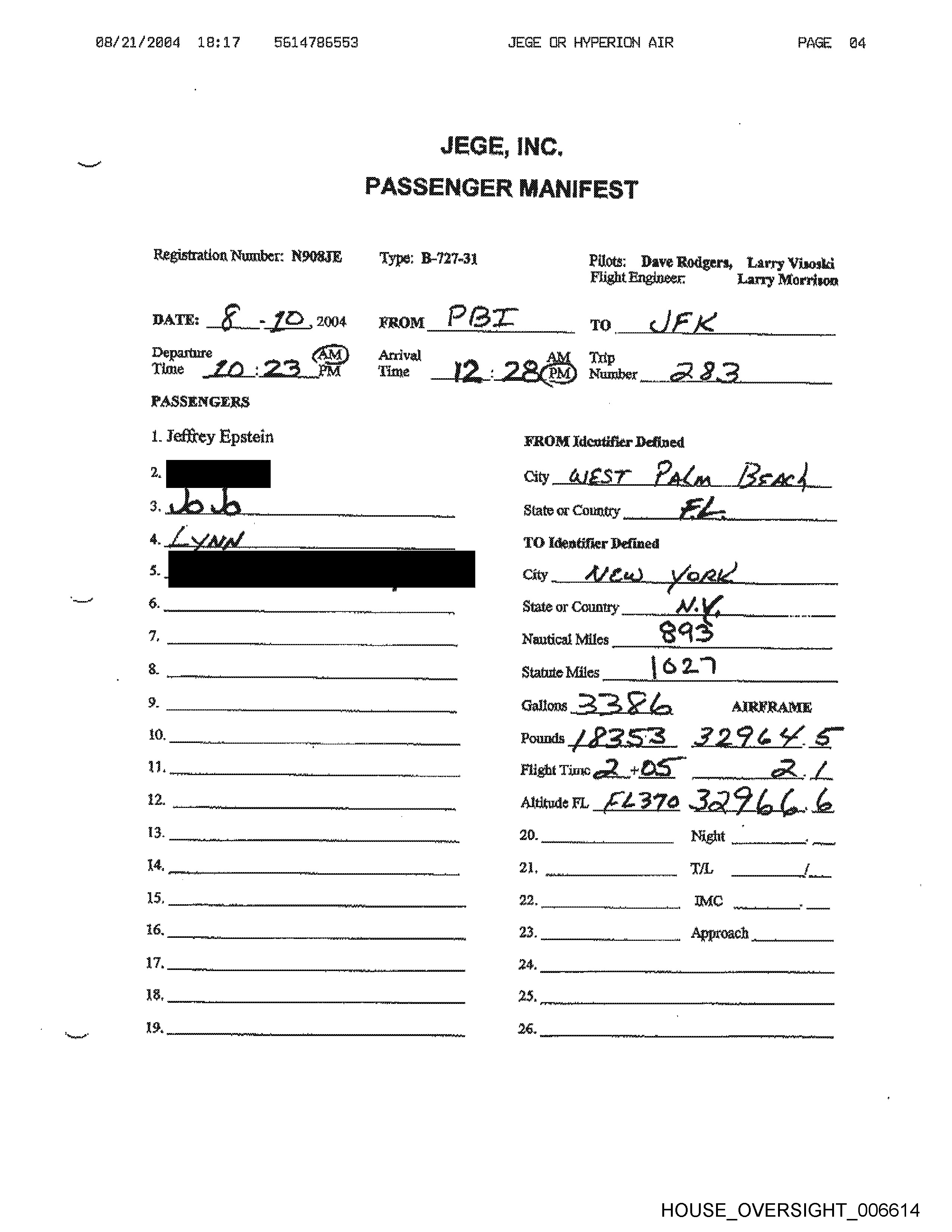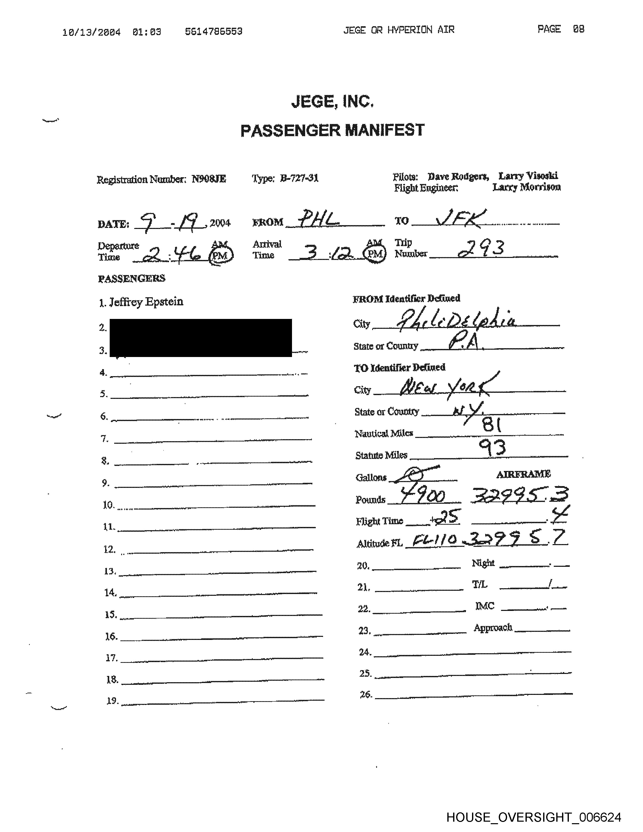 M4/11/2684 12:61 6614786593 JEGE OR HYPERTION AIR PAGE 83 Registration Number: NOG8IE Type: B-727-34 Pilots; Dave Rodgers, Larry Visoski Flight Engineer: Larry Morrison PASSENGERS \. Jeffrey Epstein Denney yp mean hs 7) identifier Defined City _ Ob a nail State or Country __ J 7 Wattical Miles Statue WAGE HOUSE OVERSIGHT _006588