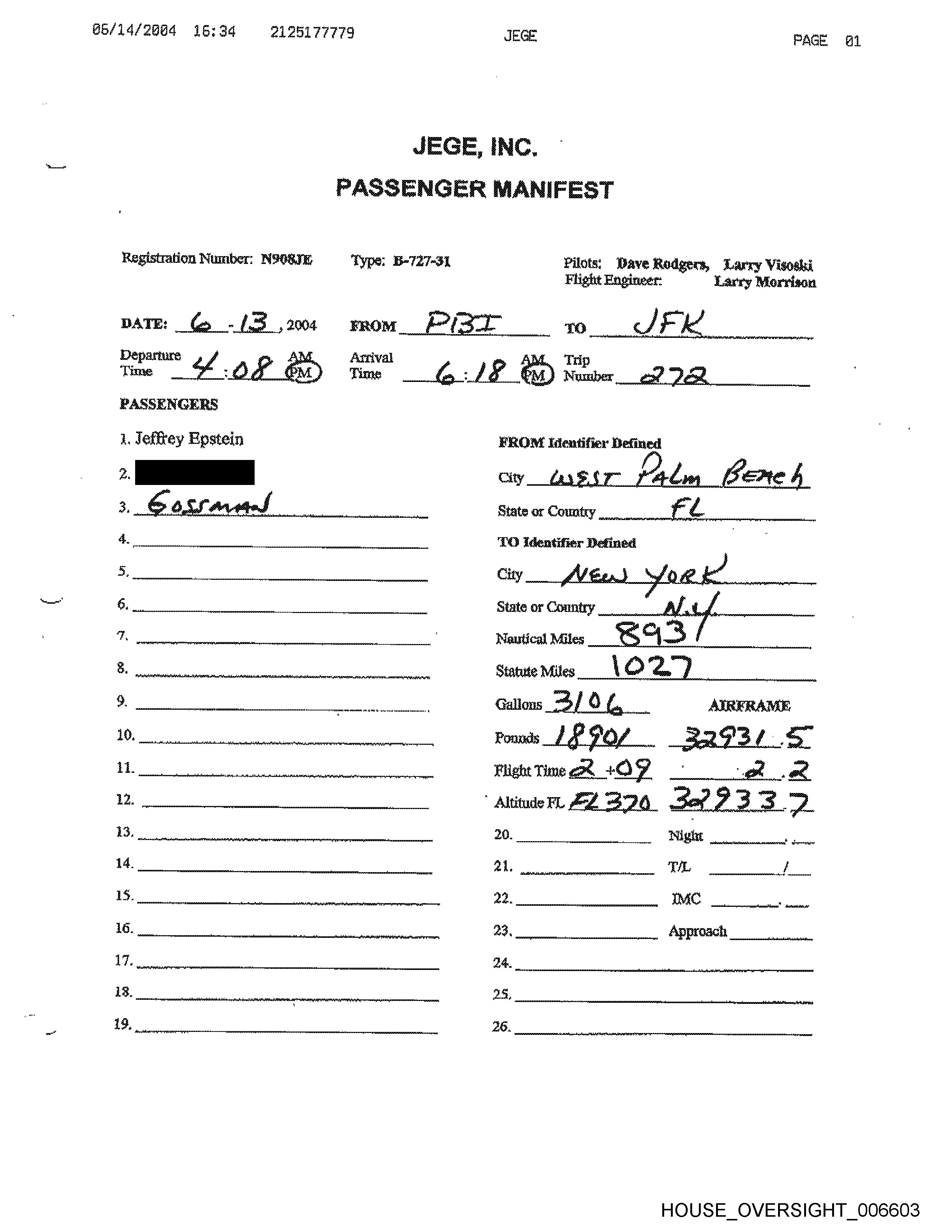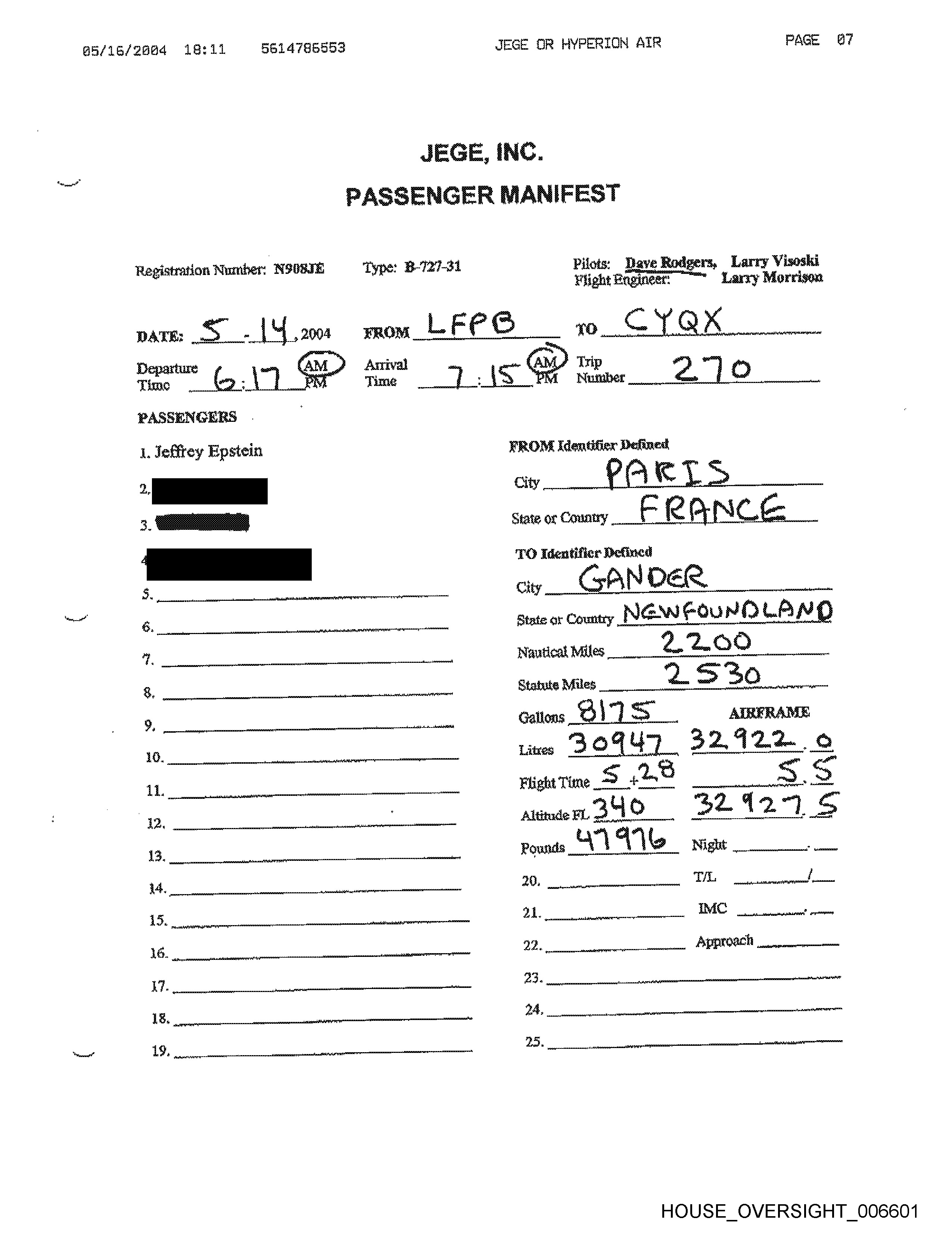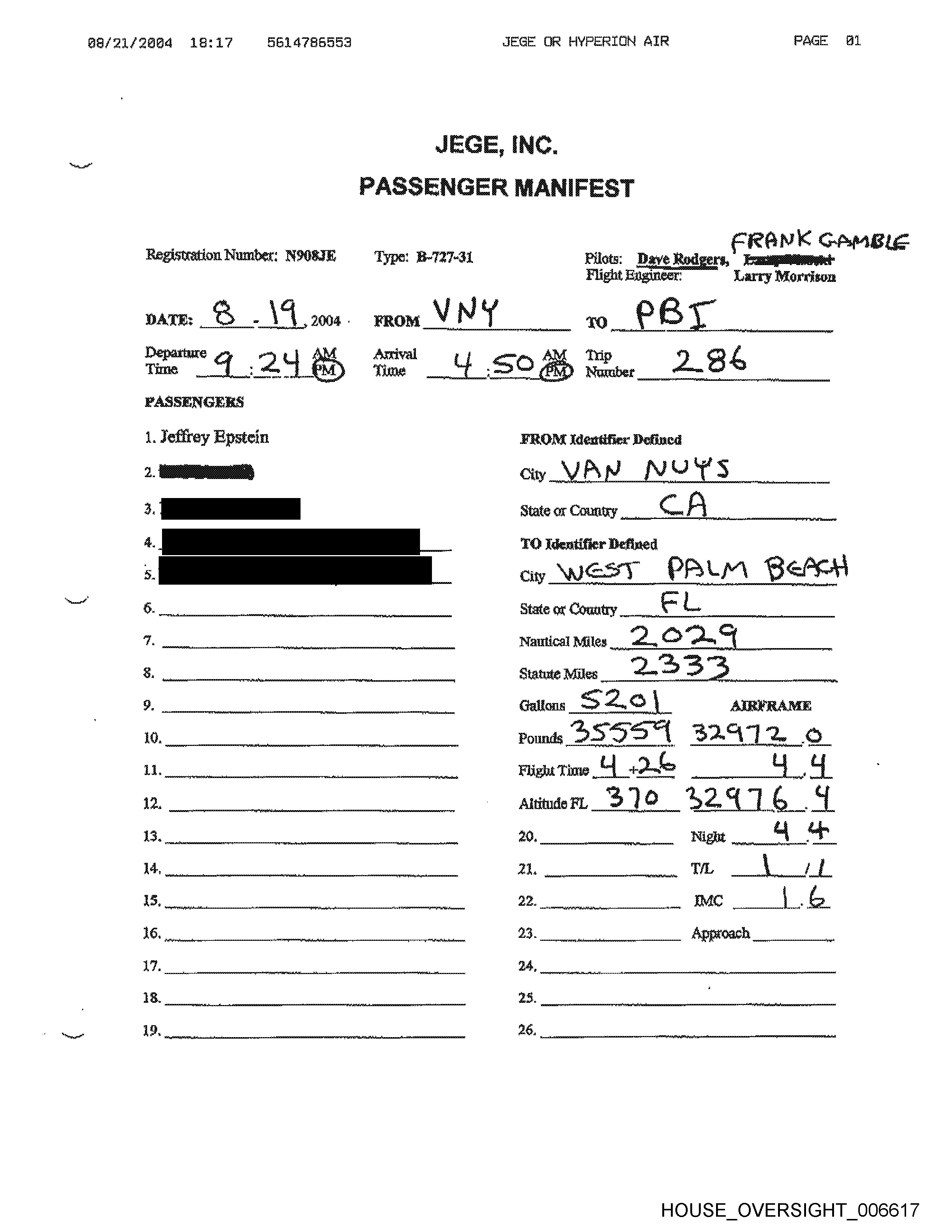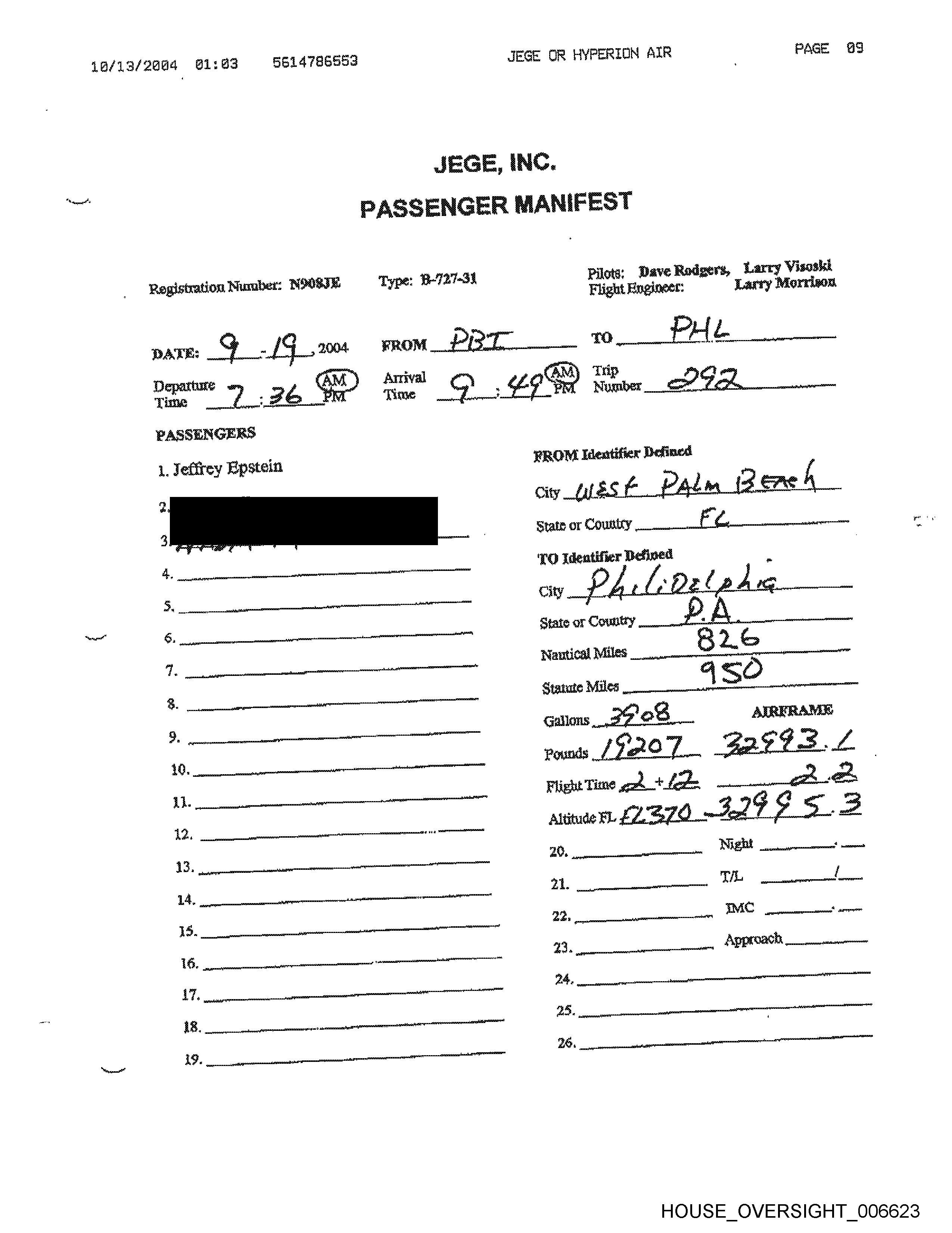 M4/11/2684 12:61 6614786593 JEGE OR HYPERTION AIR PAGE 83 Registration Number: NOG8IE Type: B-727-34 Pilots; Dave Rodgers, Larry Visoski Flight Engineer: Larry Morrison PASSENGERS \. Jeffrey Epstein Denney yp mean hs 7) identifier Defined City _ Ob a nail State or Country __ J 7 Wattical Miles Statue WAGE HOUSE OVERSIGHT _006588