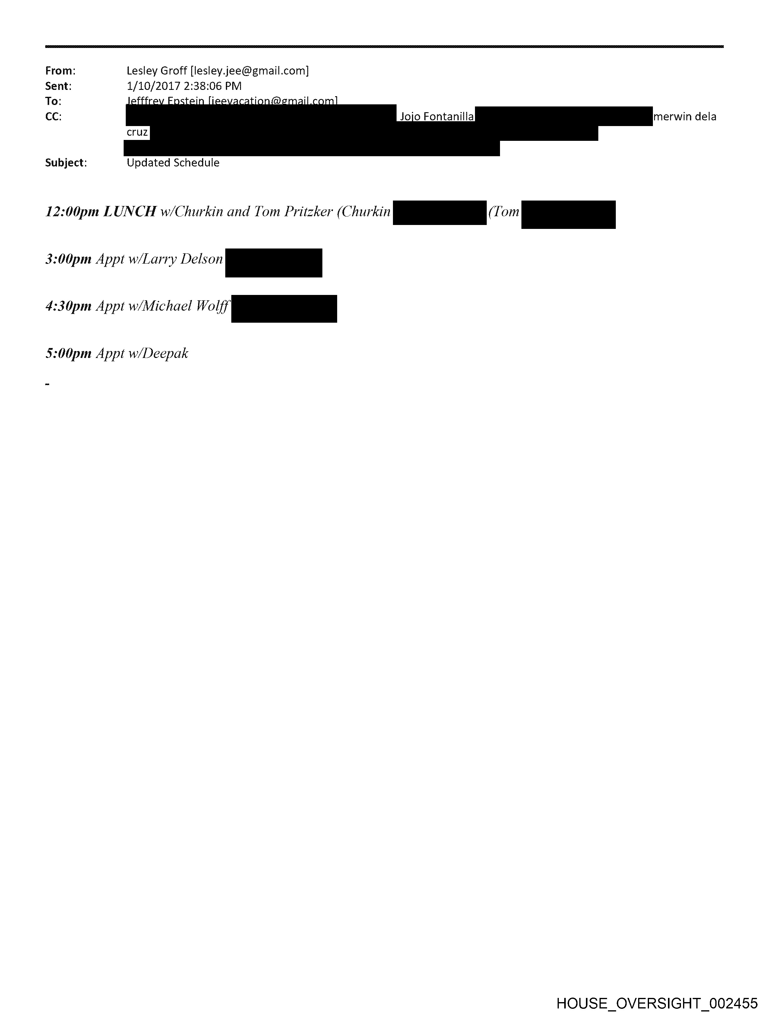 From: Lesley Groff [lesley.jee@gmail.com] Sent: 1/10/2017 2:38:06 PM Cc: merwin dela Subject: Updated Schedule 12:00pm LUNCH w/Churkin and Tom Pritzker (Churkin pe (Lom ne 3:00pm Appt w/Larry Deison a 4:30pm Appt w/Michael Wolff a 5:00pm Appt w/Deepak HOUSE_OVERSIGHT_002455