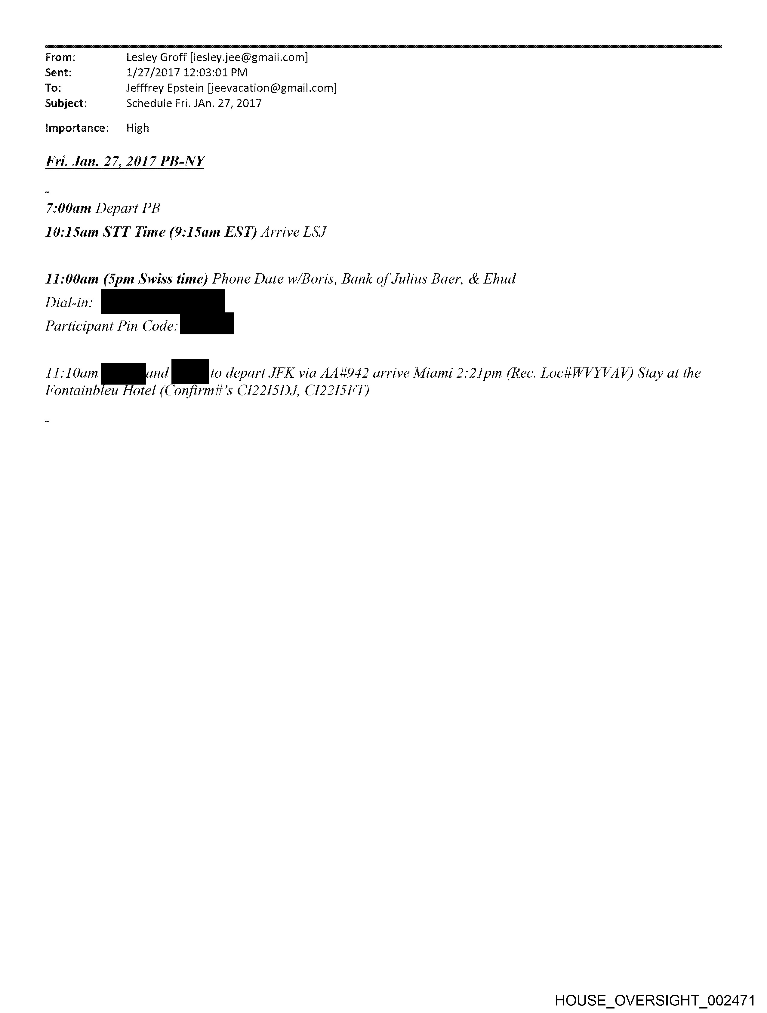 From: Lesley Groff [lesley.jee@gmail.com] Sent: 1/27/2017 12:03:01 PM To: Jefffrey Epstein [jeevacation@gmail.com] Subject: Schedule Fri. JAn. 27, 2017 Importance: High 7:00am Depart PB 10:15am STT Time (9:15am EST) Arrive LSJ 11:00am (Spm Swiss time) Phone Date w/Boris, Bank of Julius Baer, & Ehud Dial-in: Participant Pin Code: 11:10am and depart JFK via AA#942 arrive Miami 2:21pm (Rec. LocHWVYVAV) Stay at the Fontainbieu Hotel (Confirmit’s CI22ISDJ, Cl221I5 FT) HOUSE_OVERSIGHT_002471