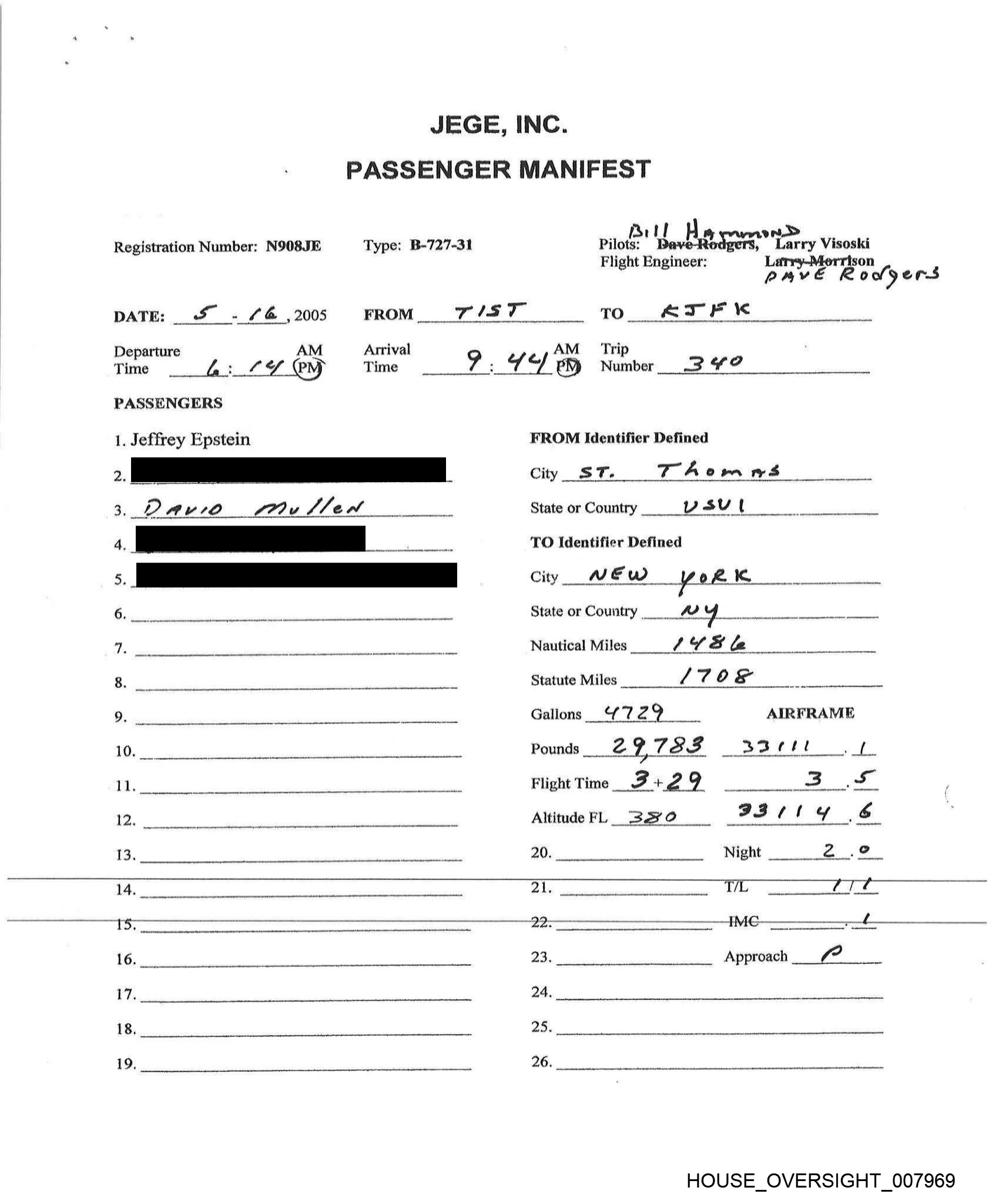JEGE, INC. PASSENGER MANIFEST Registration Number: N908JE Type: B-727-31 i] ited Herr Visoski Flight Engineer: Larry—Merrison . pave Rol gers DATE: _% - 4&@ ,2005 FROM TIST T0 ATFXK Departure AM Arrival AM _ Trip Time L: 4Y PM Time ? how eM Number 3 ¥9 PASSENGERS 1. Jeffrey Epstein mo —“(tisS 3. David fev Sen [i / _ ee 6 a rr ry eee nn ree rh tt CE TT | LT: ee TY CN RS FROM Identifier Defined City ST. TAomns _ State or Country VY sv l TO Identifier Defined City MEW State or Country AP — Nautical Miles i i Statute Miles L708 - Galions 729. AIRFRAME Pounds__2 ? TSF BBett if Flight Time F+29 _ 3 Altitude FL 3370 a A 20. Night ss 2 OS IMG-——- 4. ---___. 23. Approach f? a. 26. HOUSE_OVERSIGHT_007969