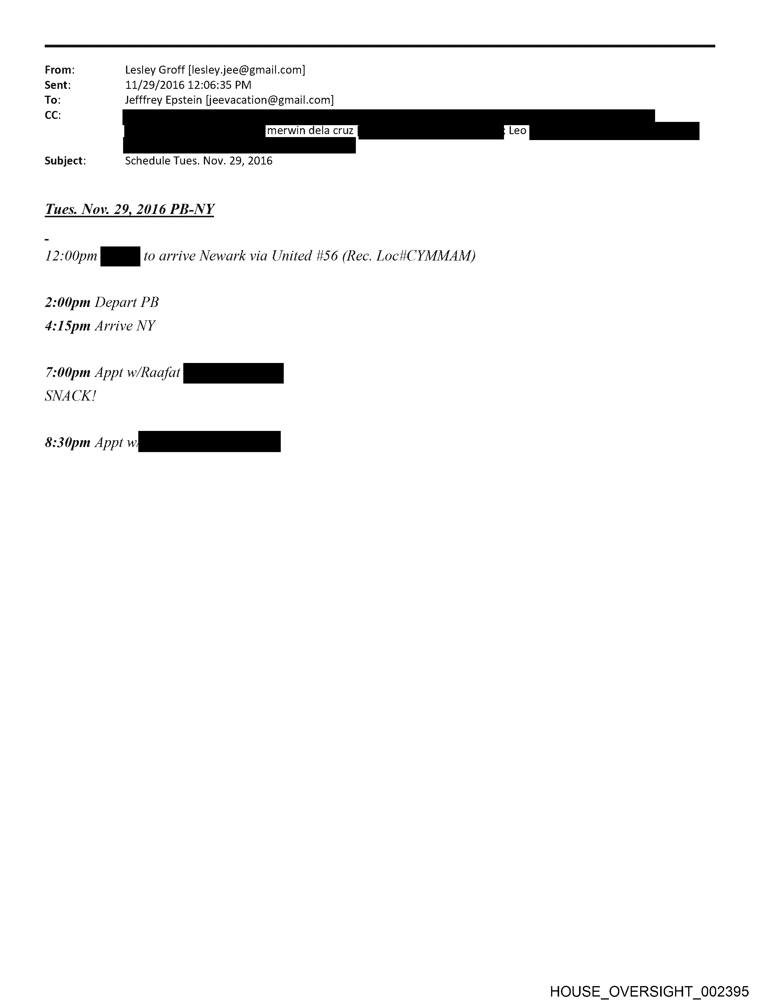 From: Lesley Groff [lesley.jee@gmail.com] Sent: 11/29/2016 12:06:35 PM To: Jefffrey Epstein [jeevacation@gmail.com] merwin dela cruz Subject: Schedule Tues. Nov. 29, 2016 Tues. Nov. 29, 2016 PB-NY 12:00pm po to arrive Newark via United #56 (Rec. Loc#CYMMAM) 2:00pm Depart PB 4:15pm Arrive NY 7:00pm Appt w/Raafat pS SNACK! 8:30pm App HOUSE_OVERSIGHT_002395
