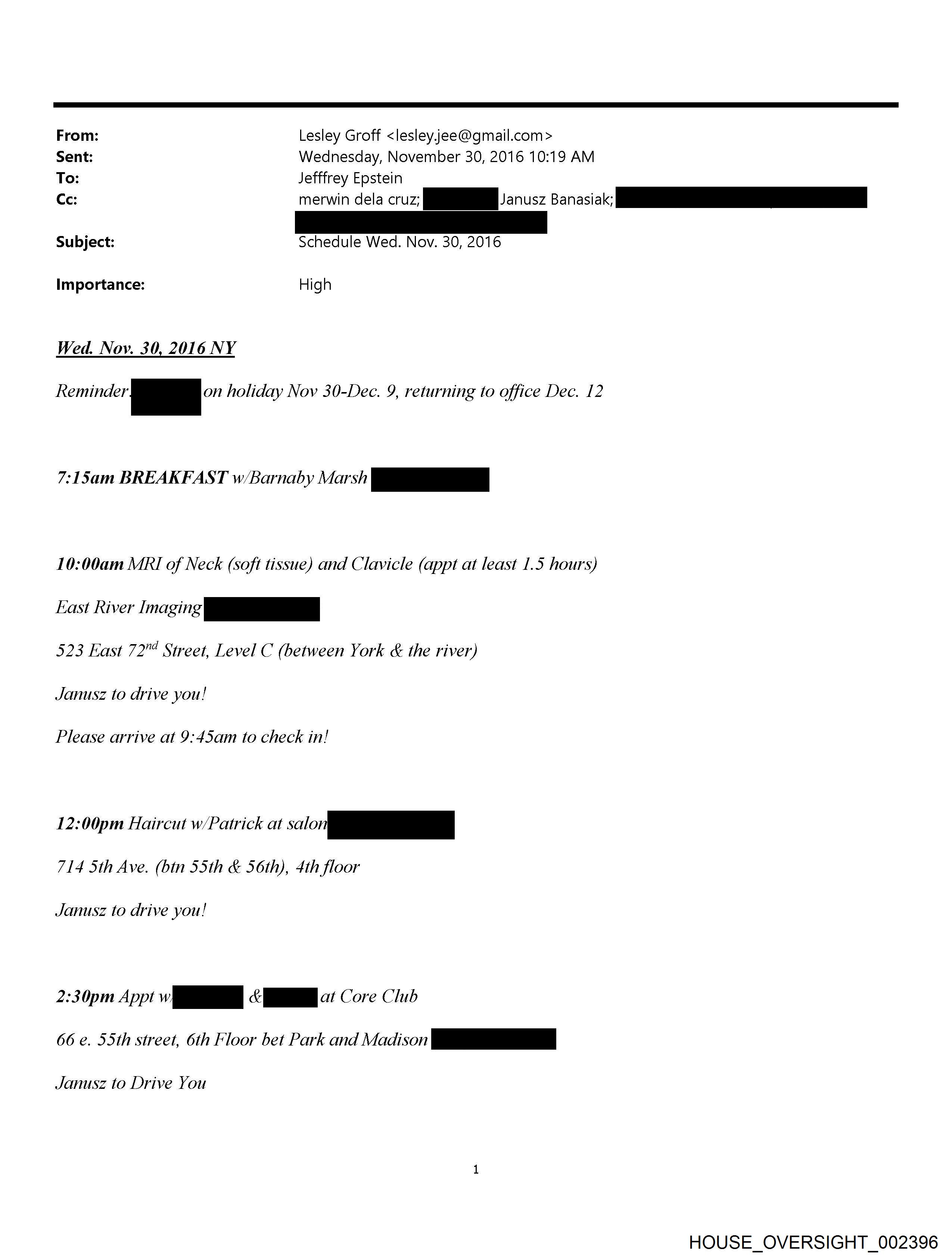 From: Lesley Groff [lesley.jee@gmail.com] Sent: 11/30/2016 10:18:39 AM To: Jefffrey Epstein [jeevacation@gmail.com] Cc: merwin dela cruz Janusz Banasiak Subject: Schedule Wed. Nov. 30, 2016 Wed. Nov. 30, 2016 NY Reminder: on holiday Nov 30-Dec. 9, returning to office Dec. 12 7:15am BREAKFAST w/Barnaby Marsh pe 10:00am MRI of Neck (soft tissue) and Clavicle (appt at least 1.5 hours) hast Rive ng 523 East 72” Street, Level C (between York & the river) Janusz to drive you! Please arrive at 9:45am to check in! 12:00pm Haircut w/Parick a colo 714 Sth Ave. (btn 55th & 56th), 4th floor Janusz to drive you! 2:30pm Appt iii & Bat Core Club 66 e. 55th street, 6th Floor bet Park and Meds TO — Janusz to Drive You 4:00pm Rich and Darren 7:00pm DINNER w/Woody and Soon Yi pe HOUSE_OVERSIGHT_002400